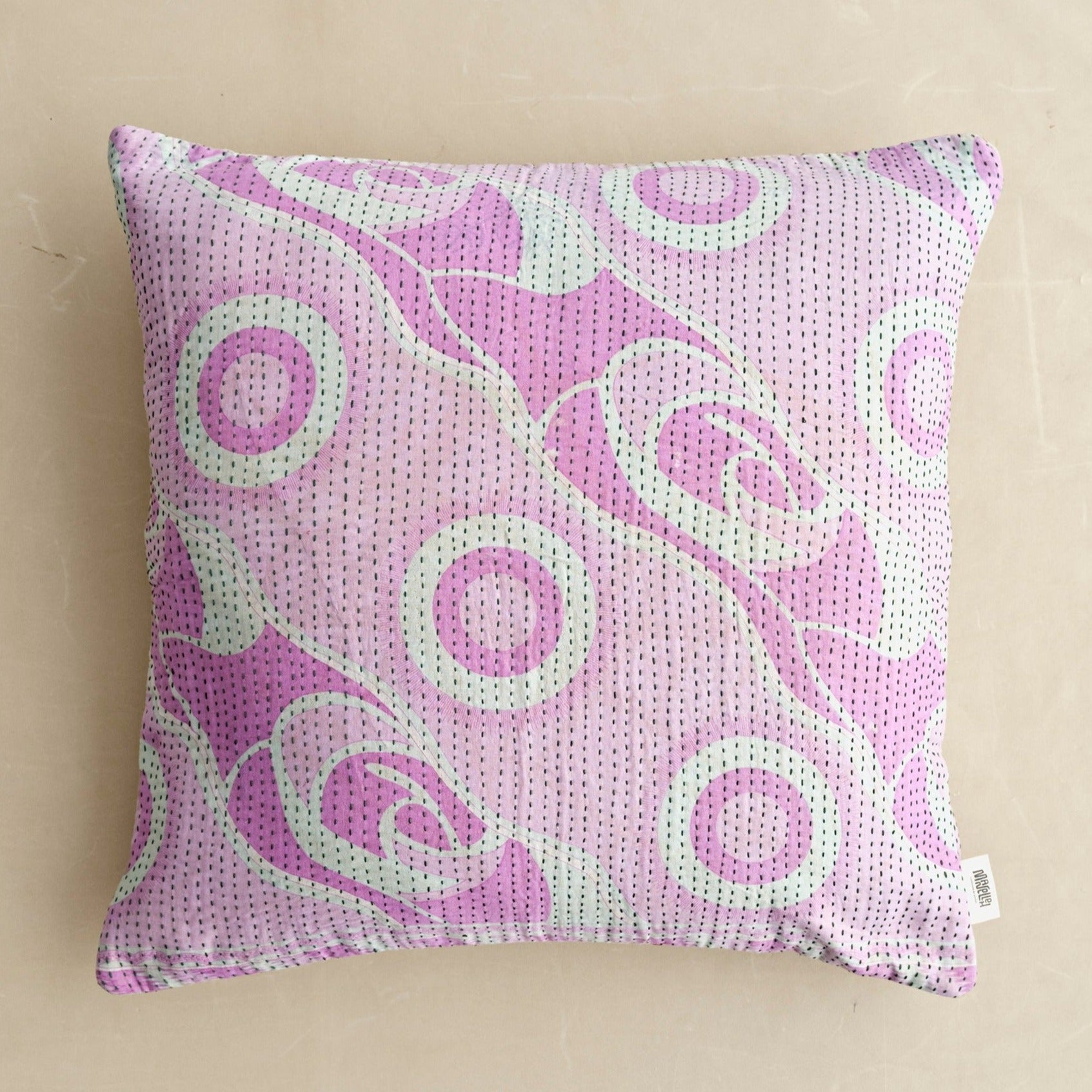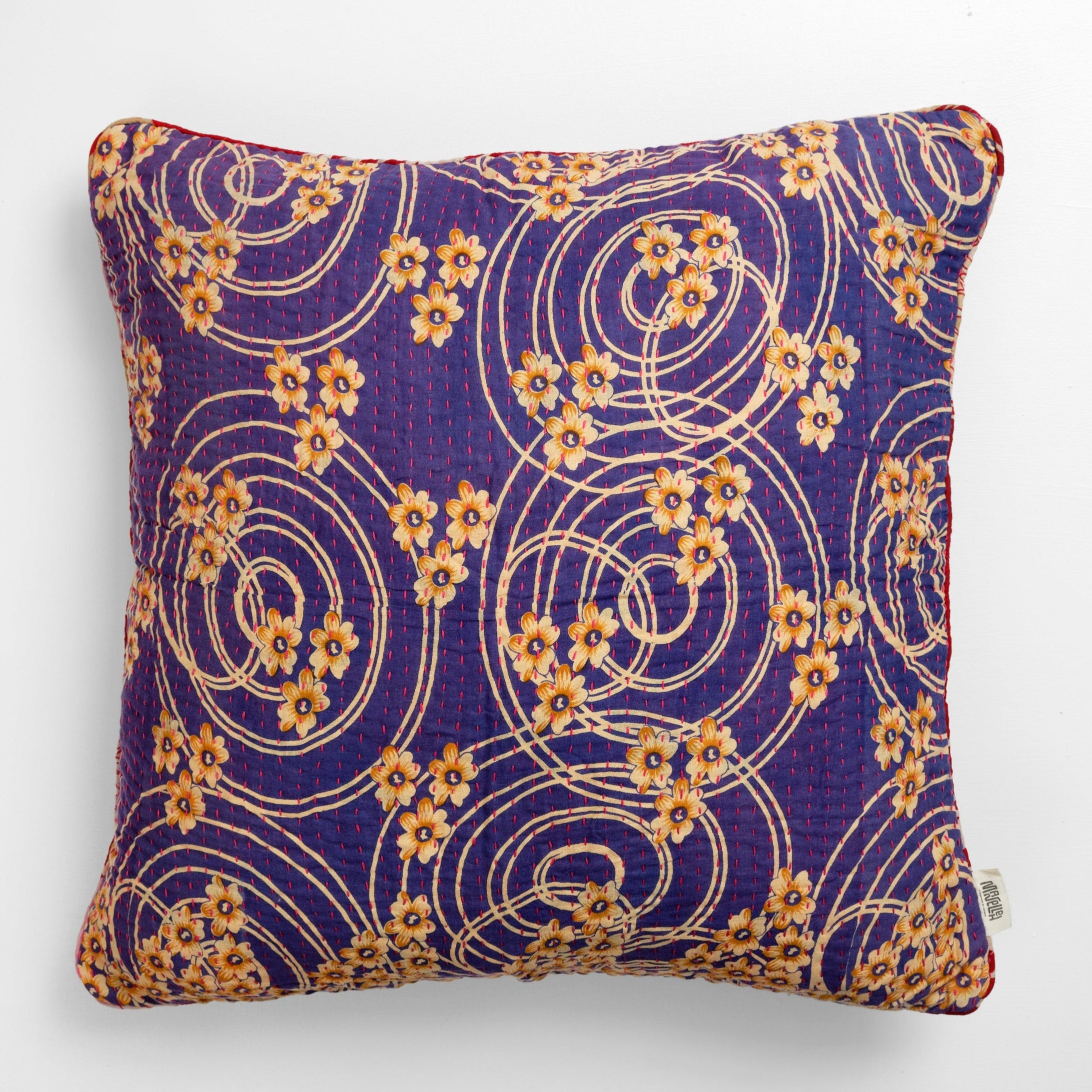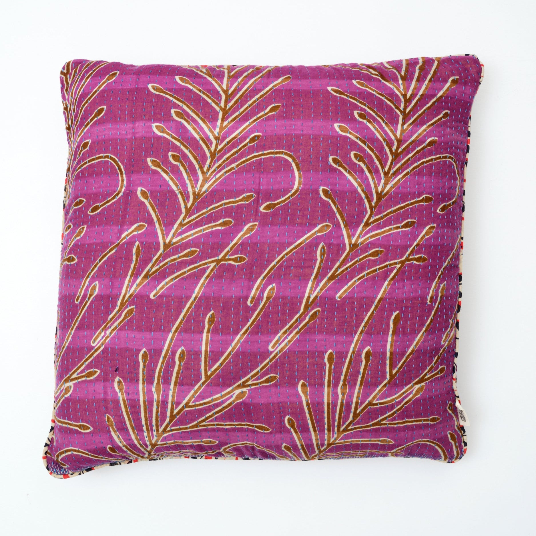 De mange smukke grønne puder er syet med fire lag vintage sarier. De findes i bomuld og silke og er lavet i størrelserne: 30x50 cm, 40x60 cm, 40x40 cm, 50x50 cm og 60x60 cm.