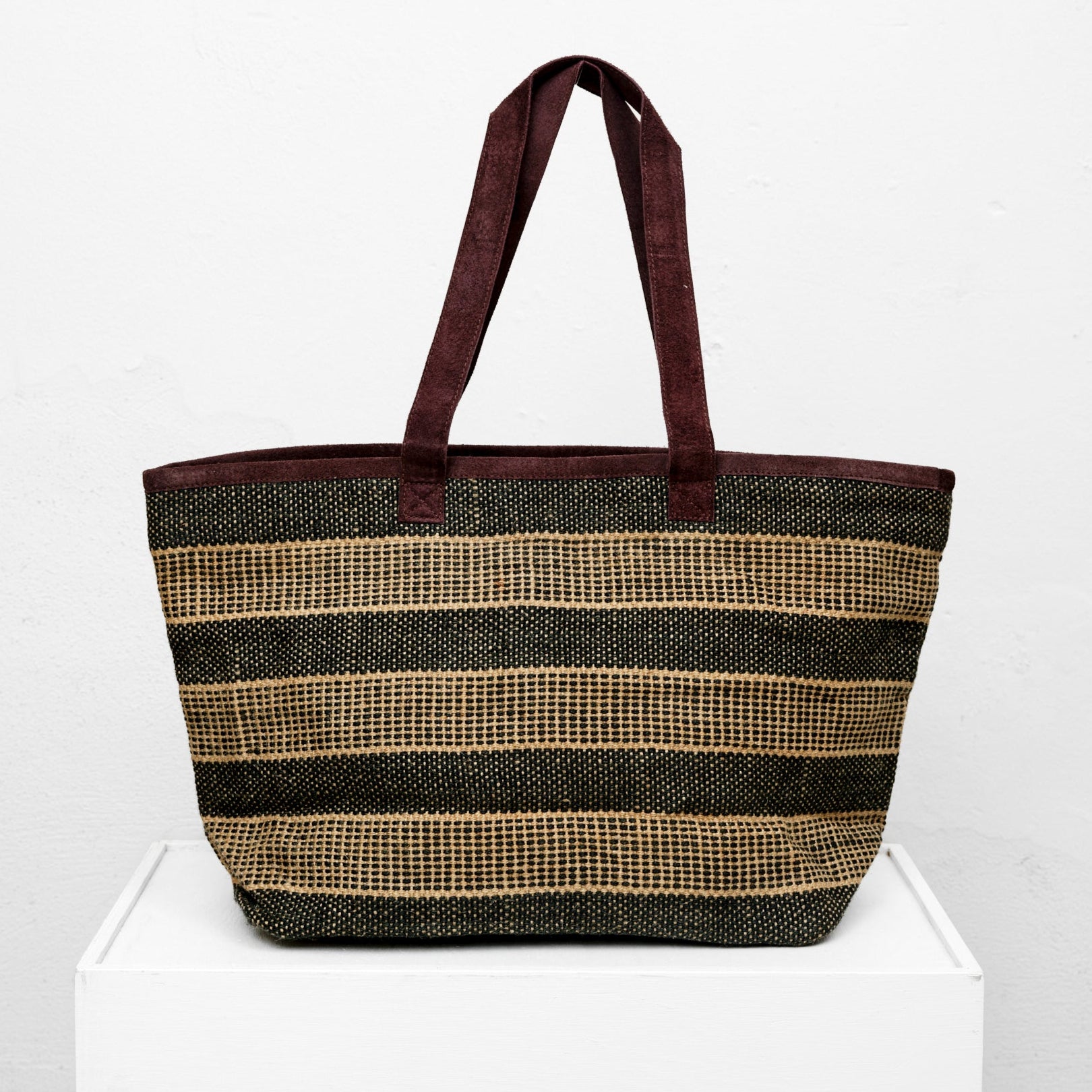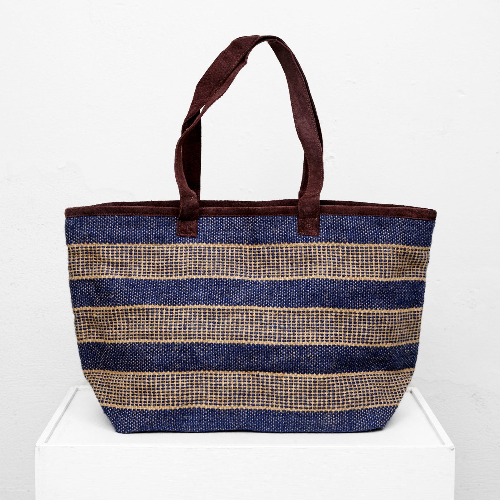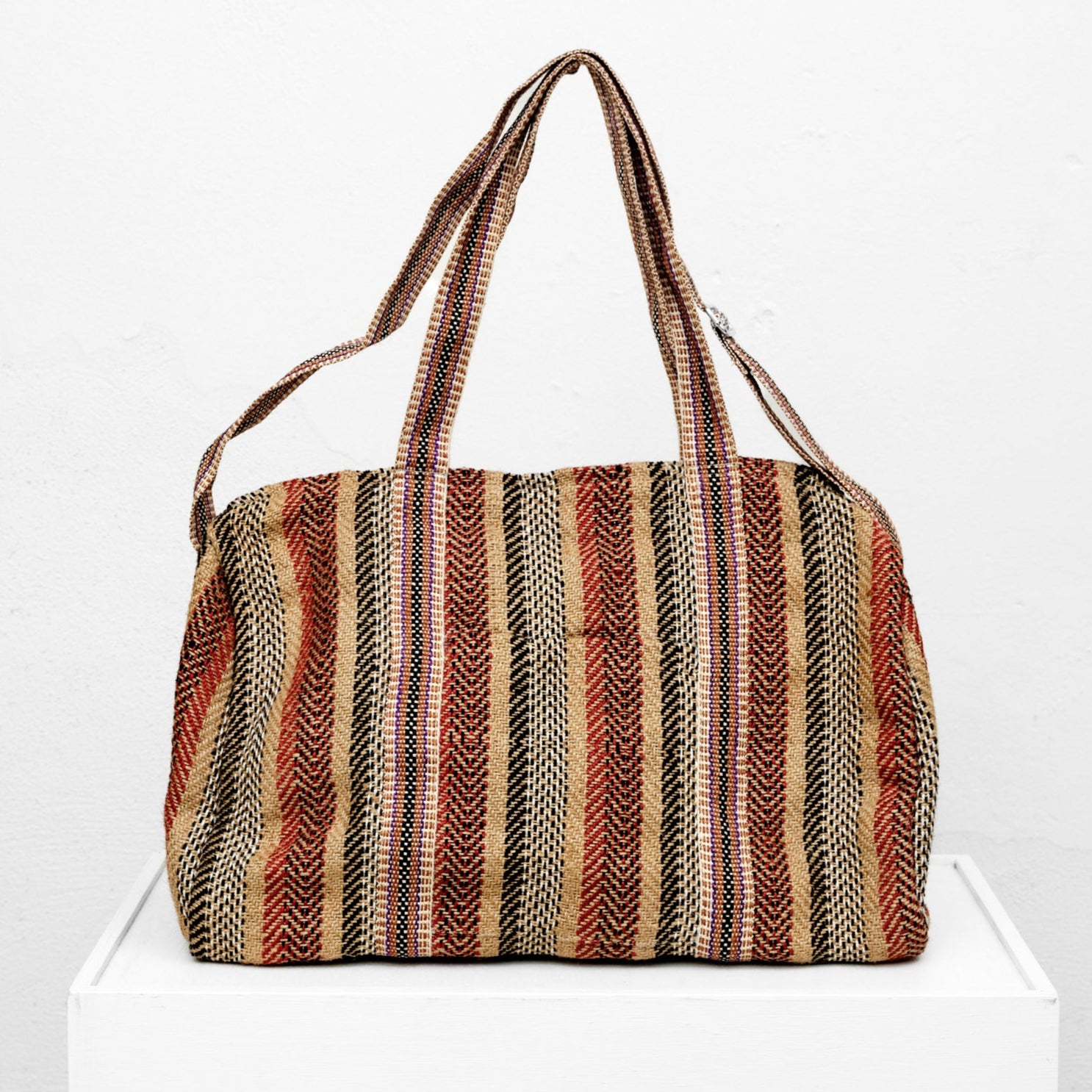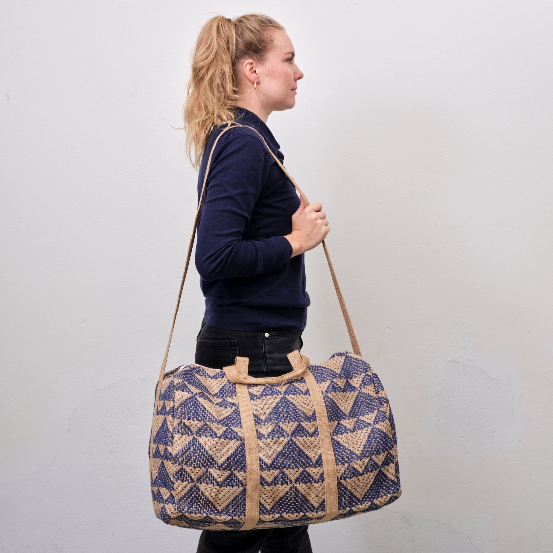 Hver jute weekendtaske er lavet af håndvævet jutestof. Stoffet er naturligt farvet, håndvævet og til sidst syet til tasker.