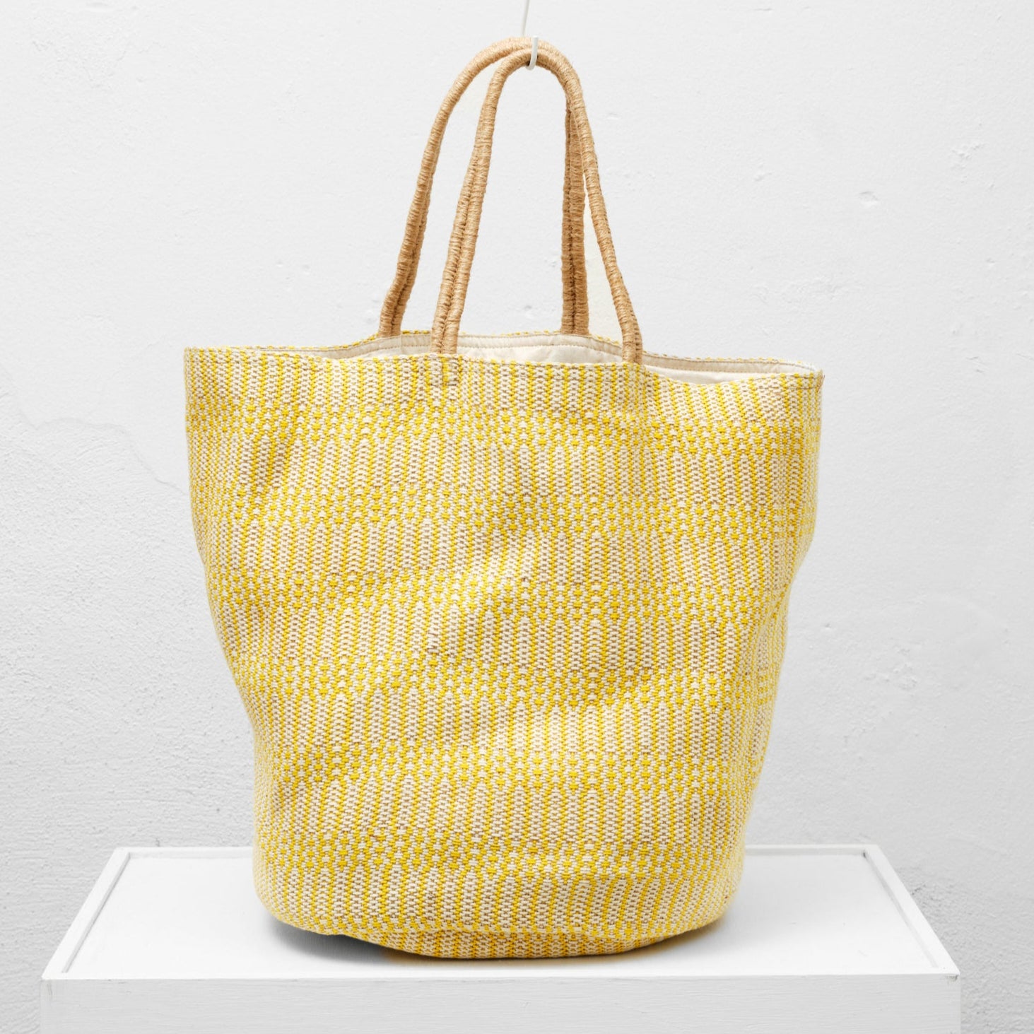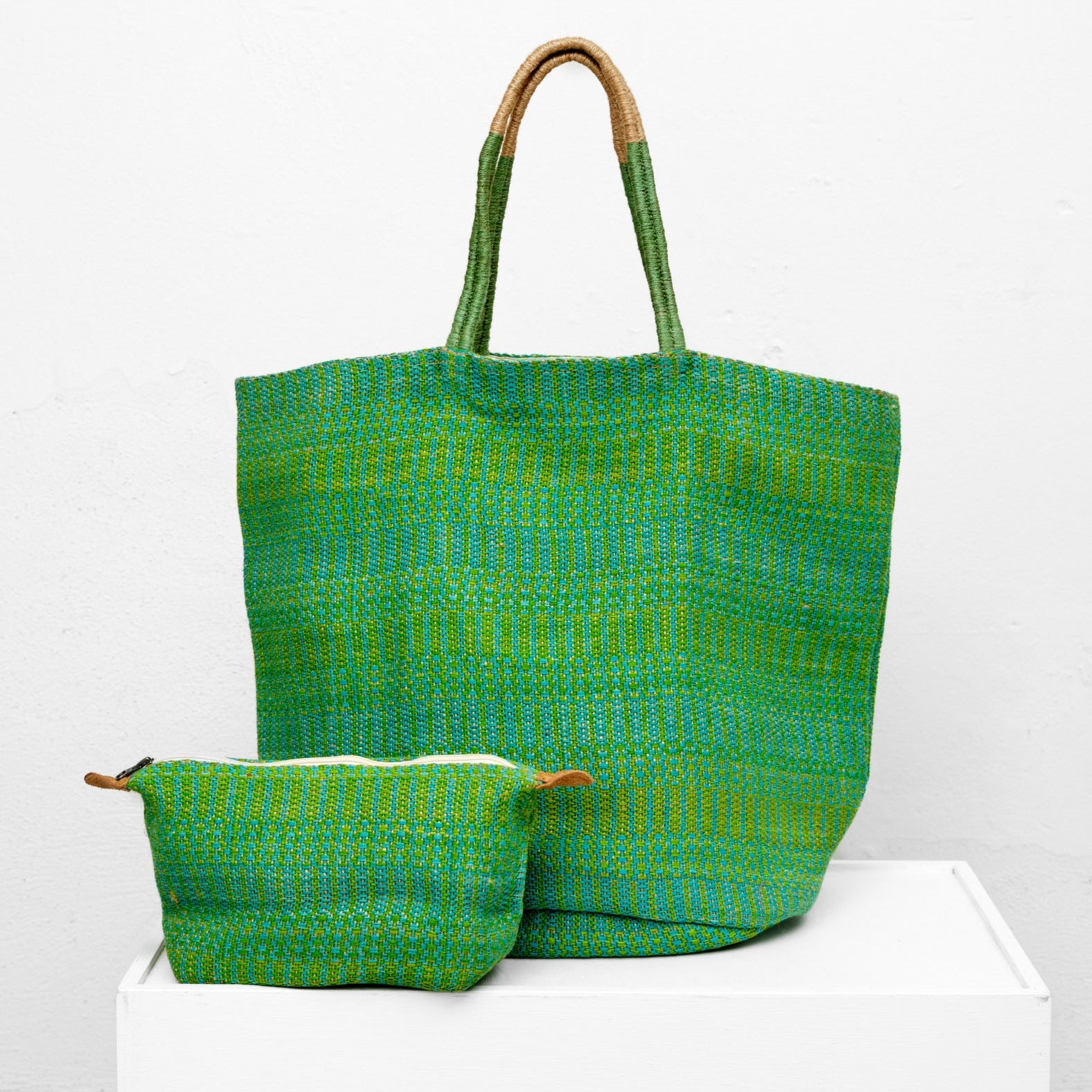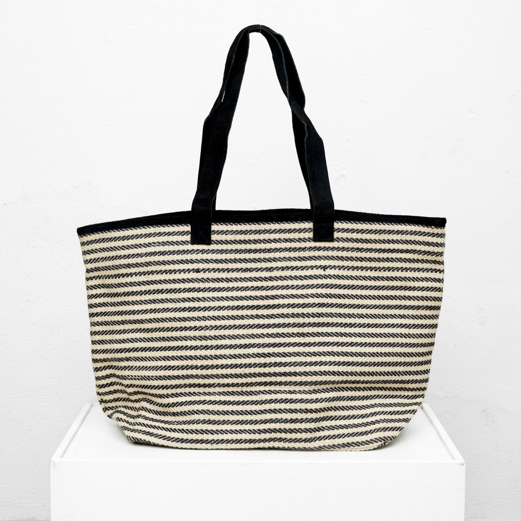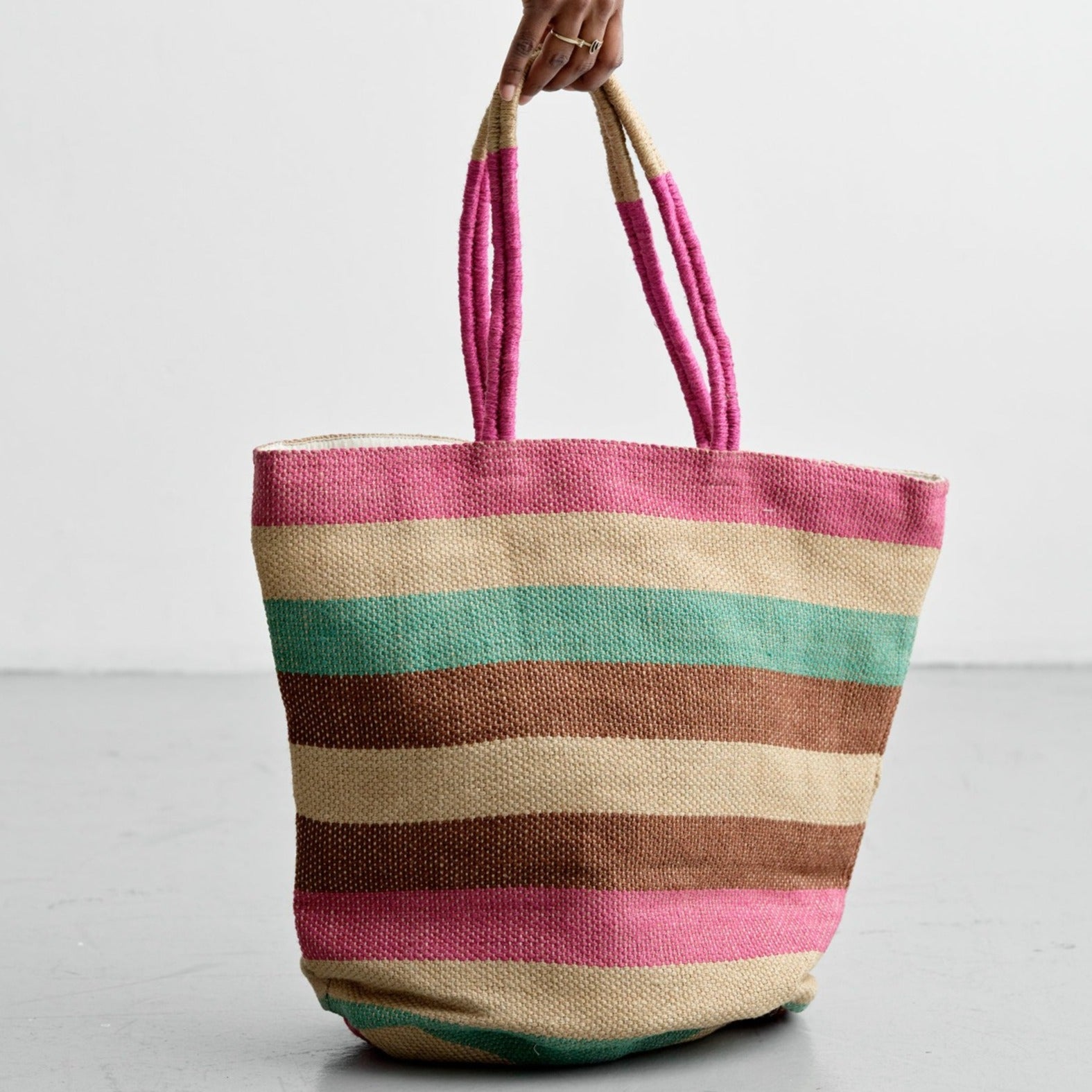 Hver jute weekendtaske er lavet af håndvævet jutestof. Stoffet er naturligt farvet, håndvævet og til sidst syet til tasker.