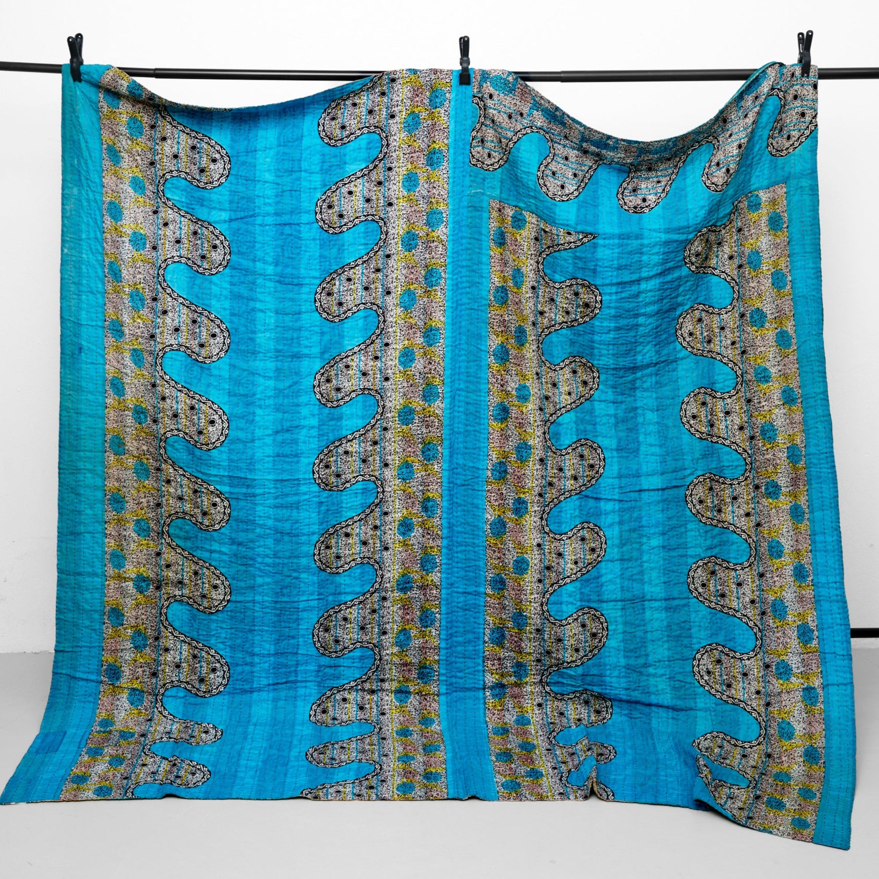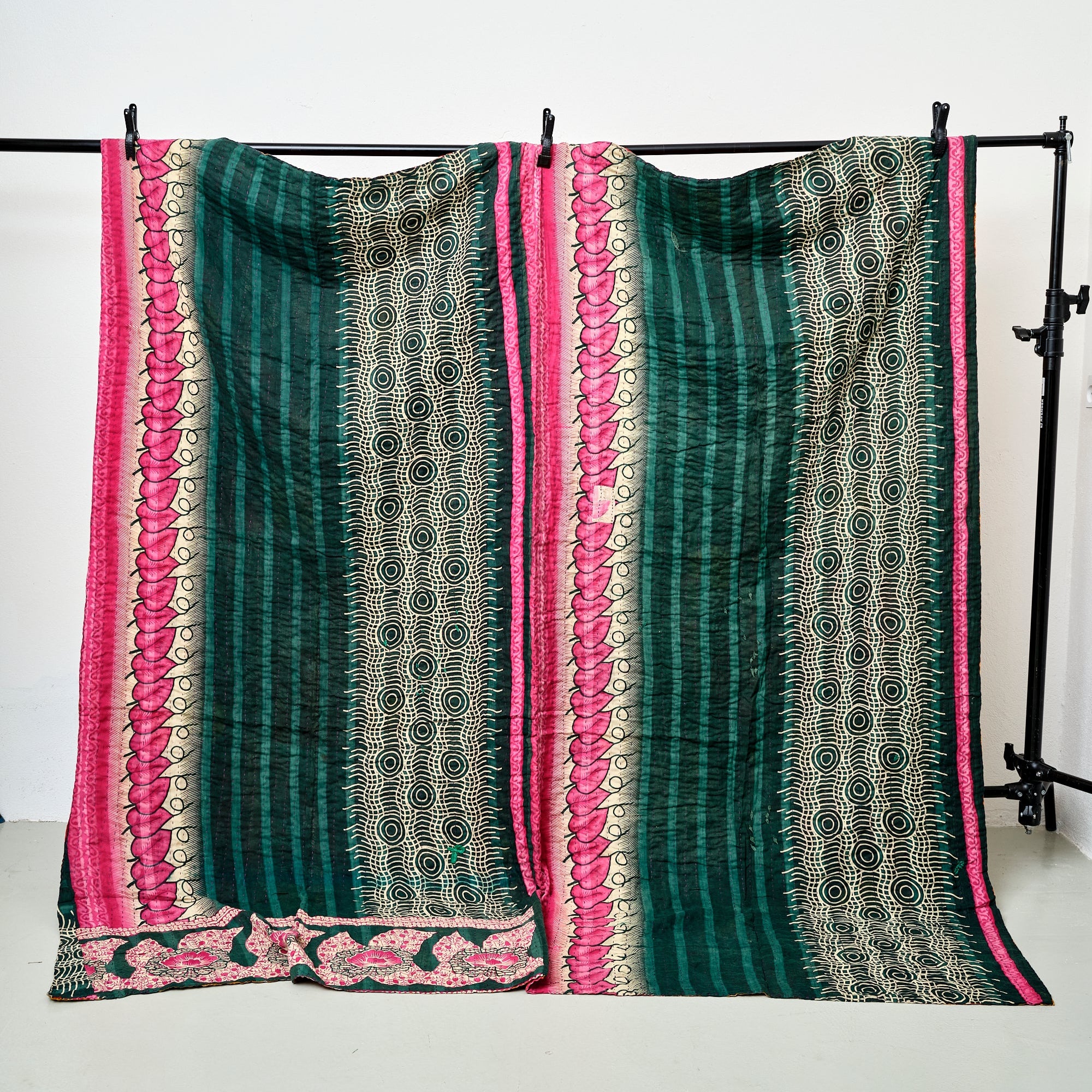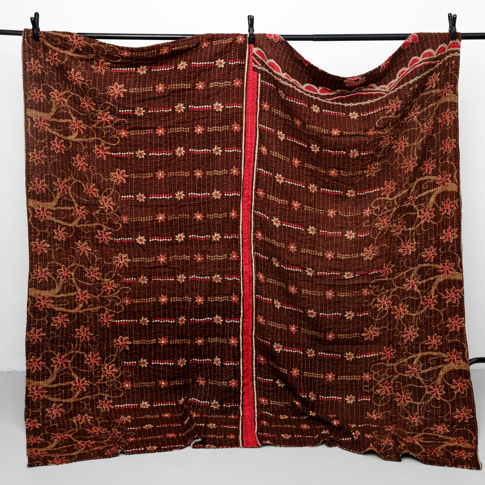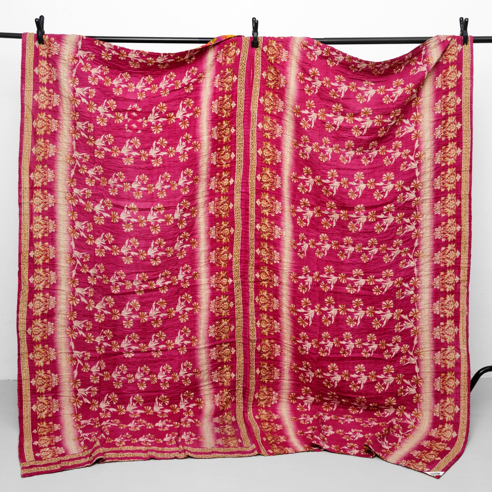 Kantha tæppe 200 x 200 cm er syet med fire lag vintage bomulds-sarier. Hvert tæppe er unikt.