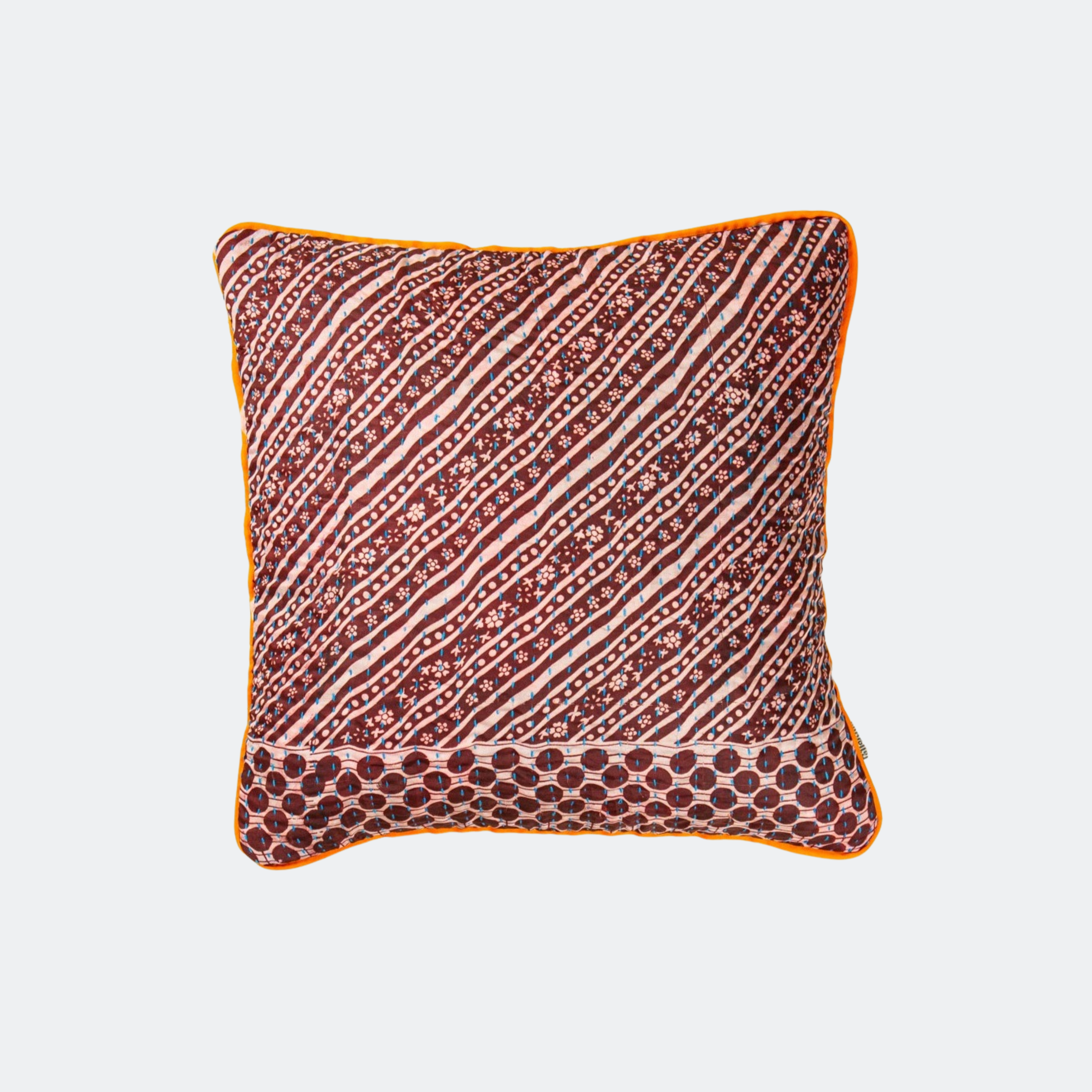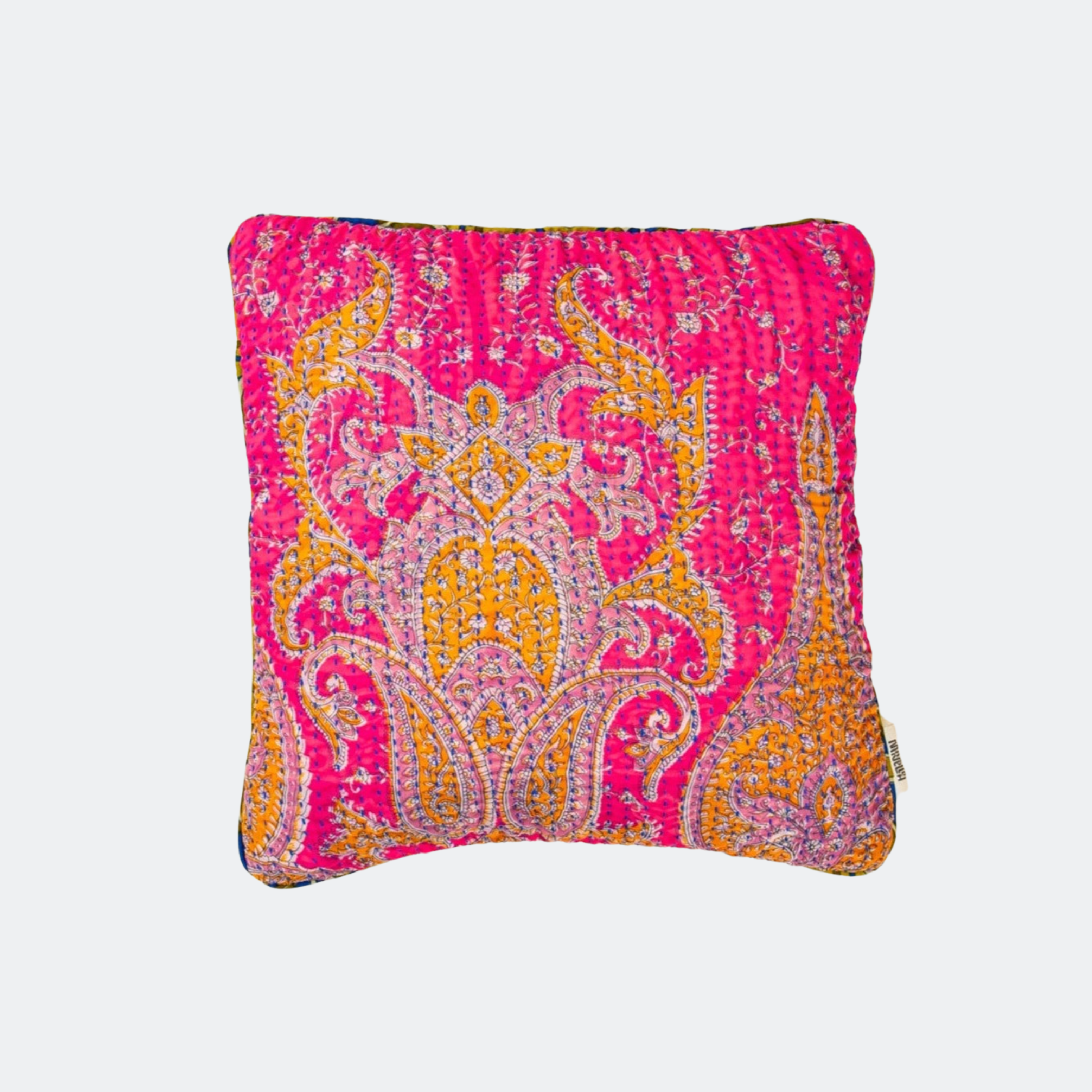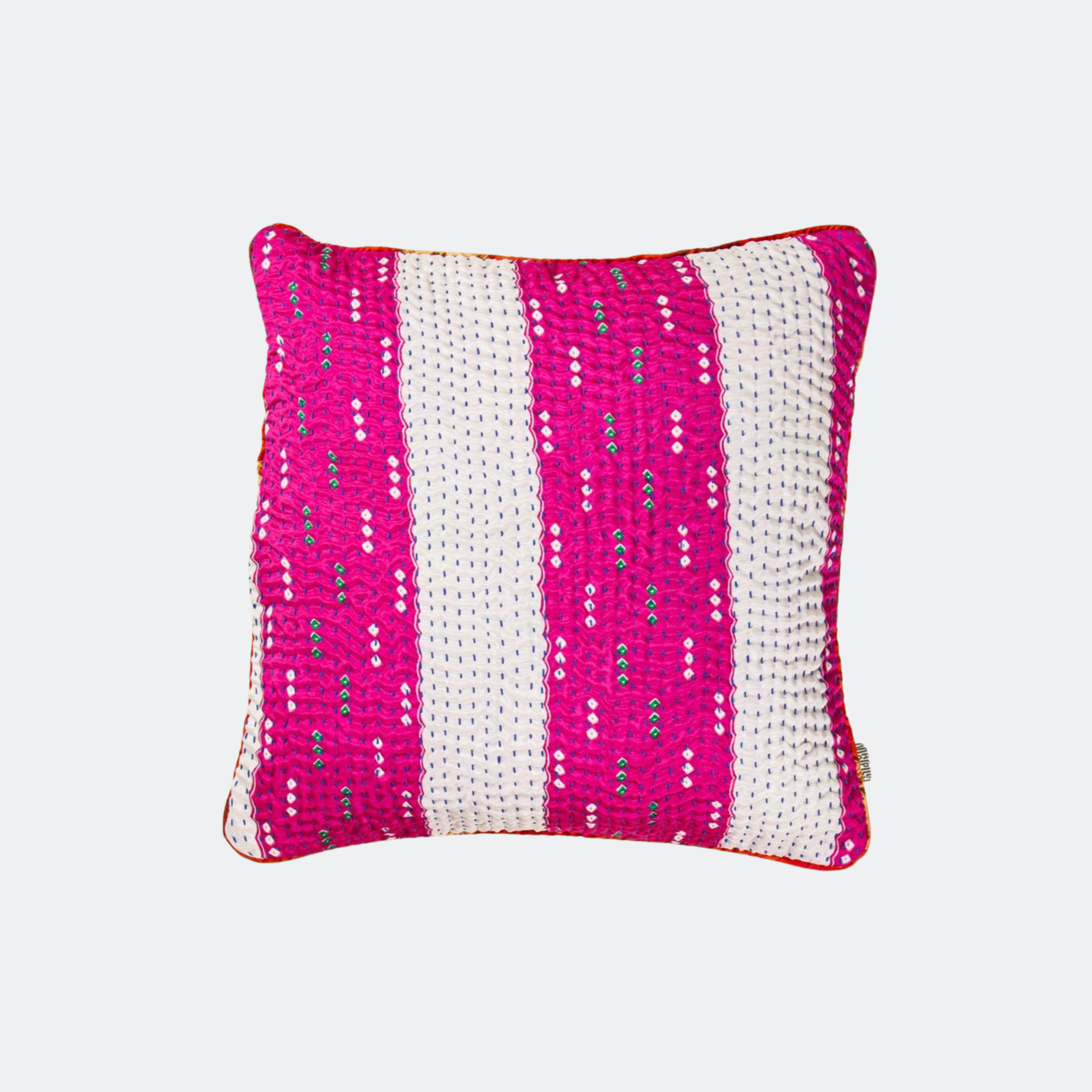 En lille pude måler 30x50 cm eller 40x40 cm, og de mange puder er syet med fire lag vintage sarier. De alle lavet af vintage silke sarier.