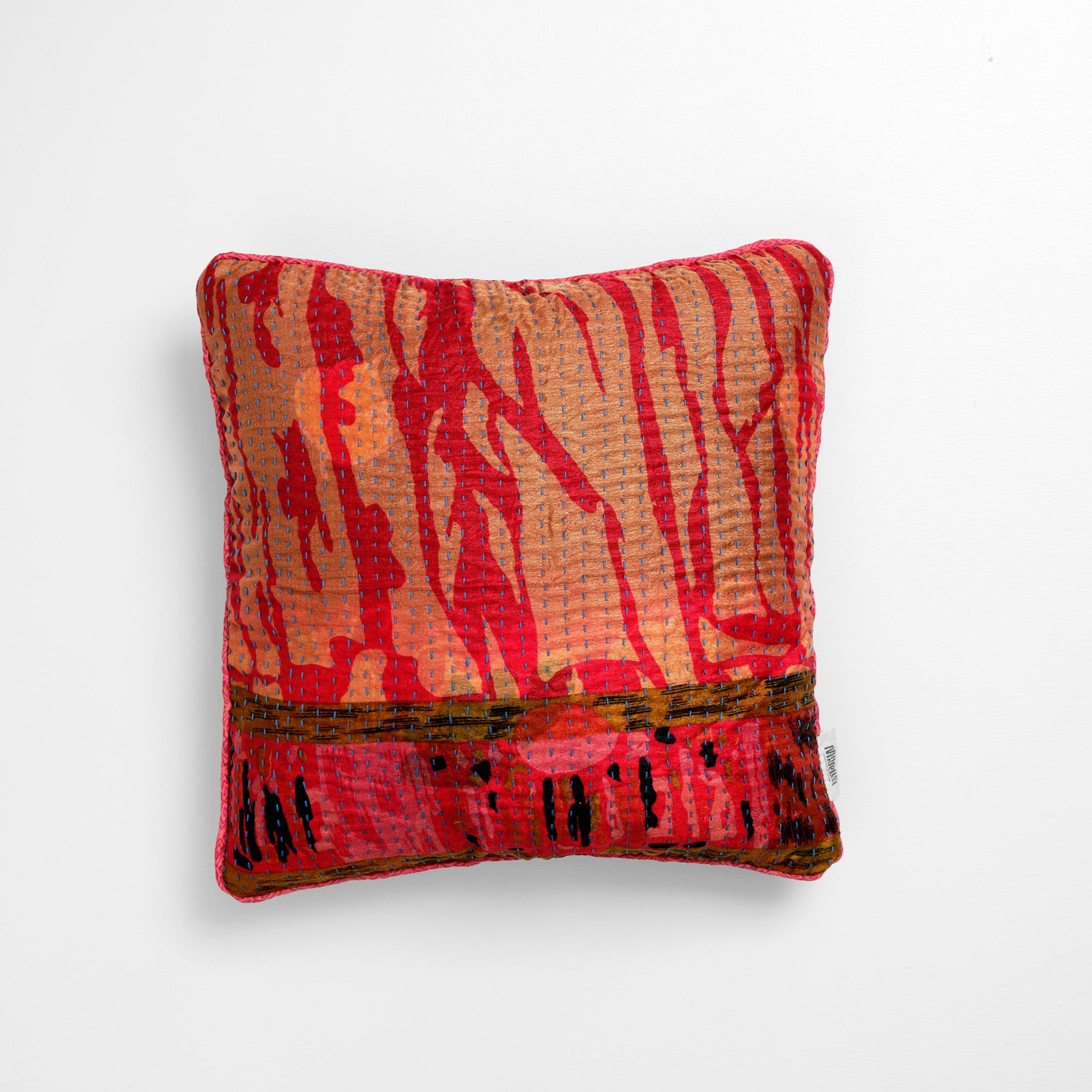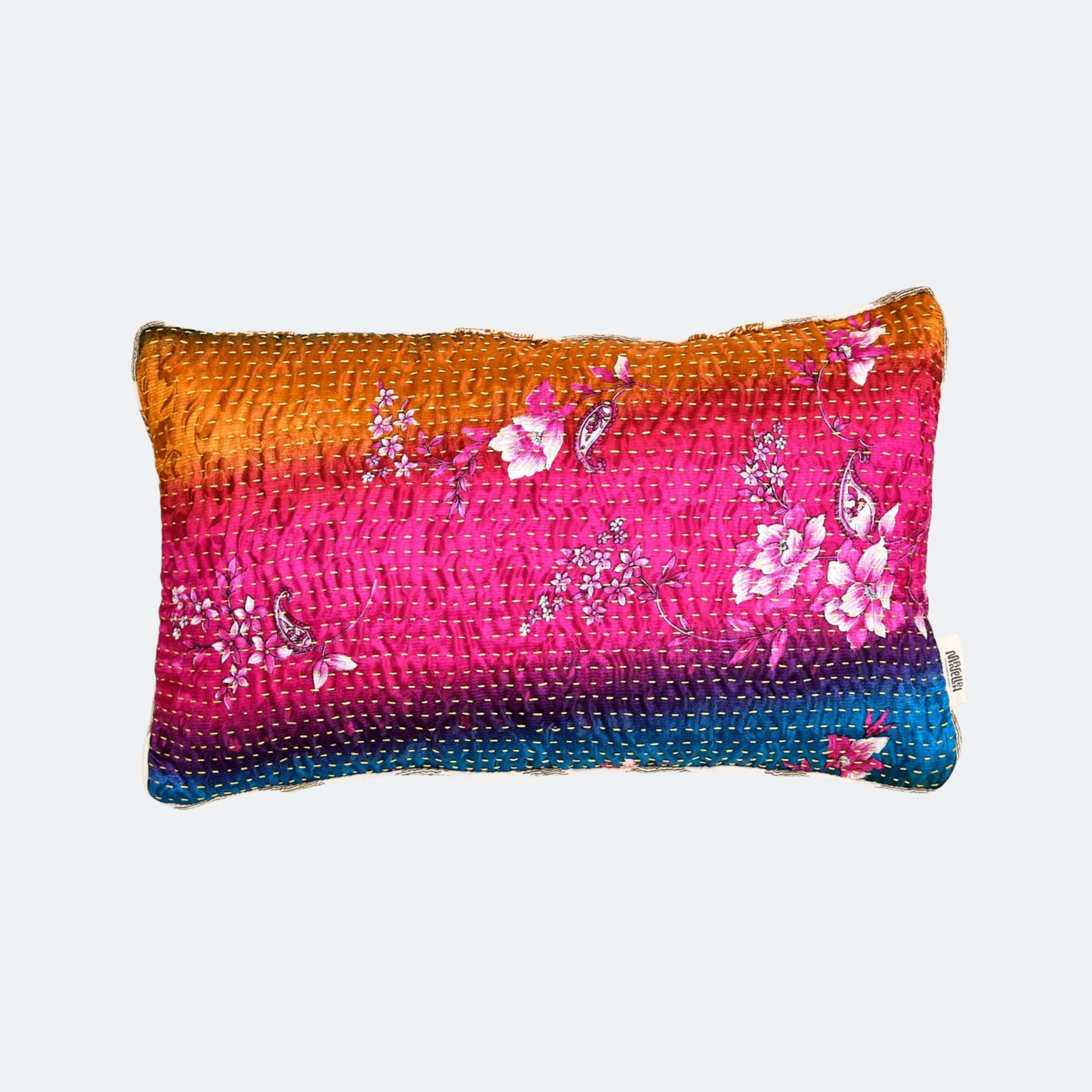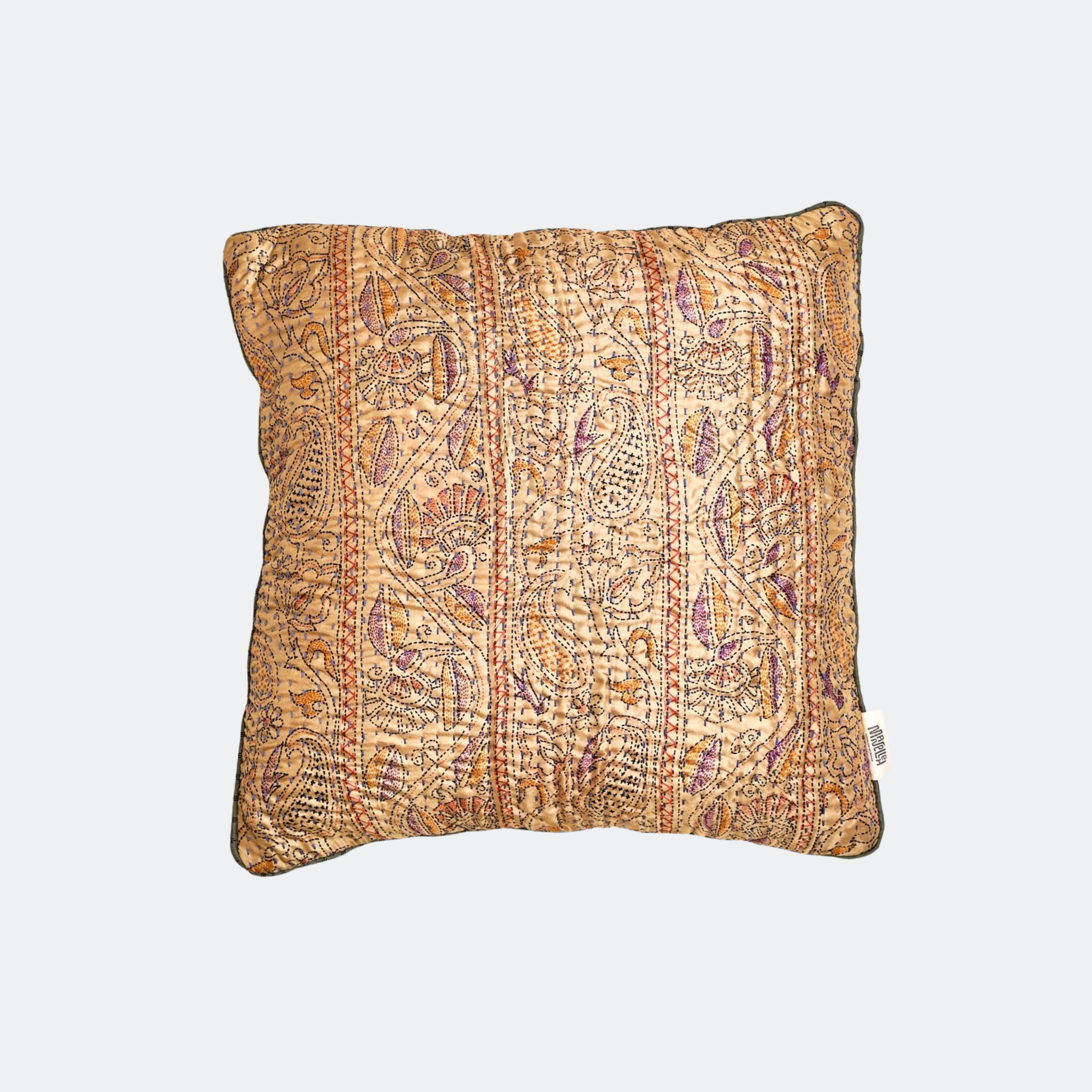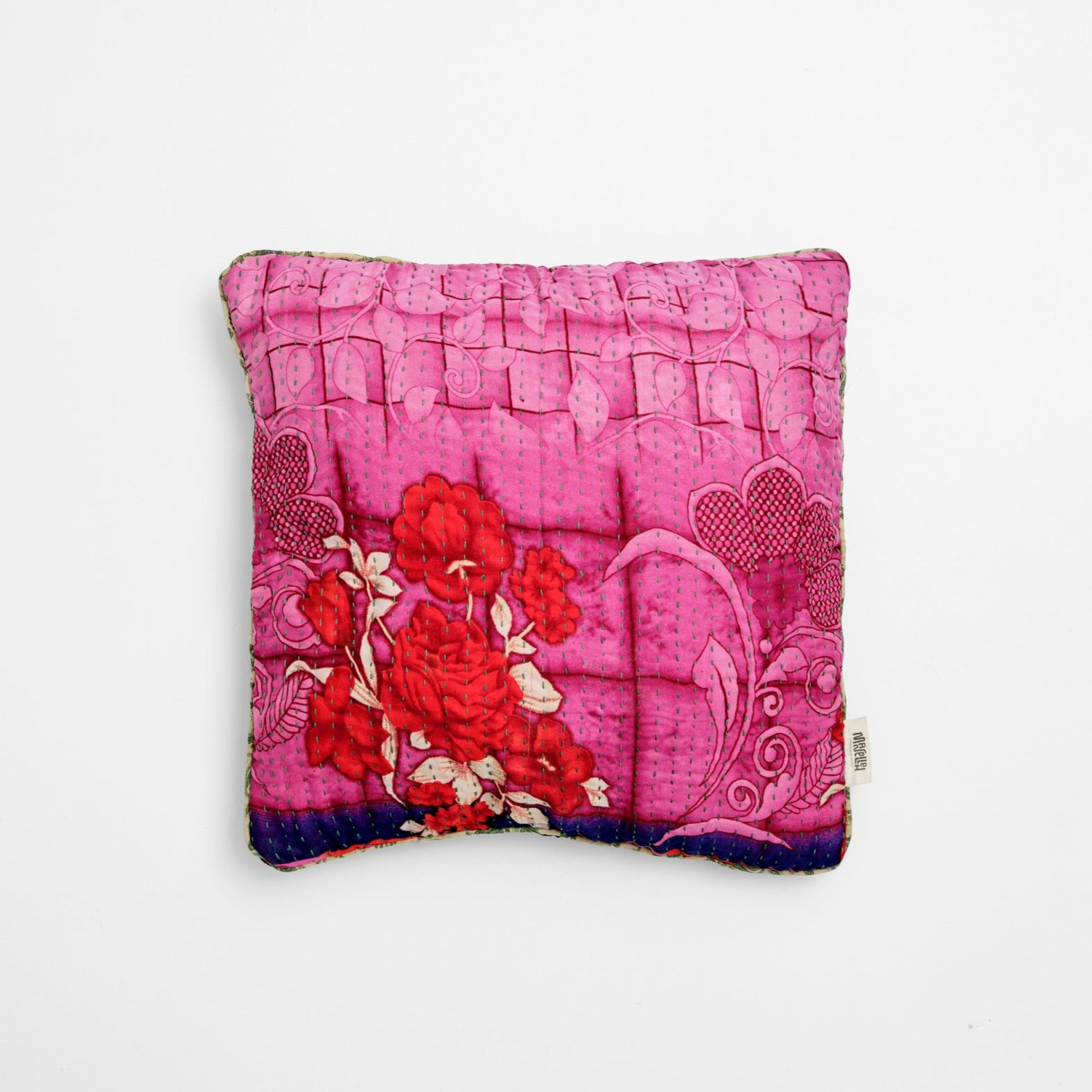 En lille pude måler 30x50 cm eller 40x40 cm, og de mange puder er syet med fire lag vintage sarier. De alle lavet af vintage silke sarier.