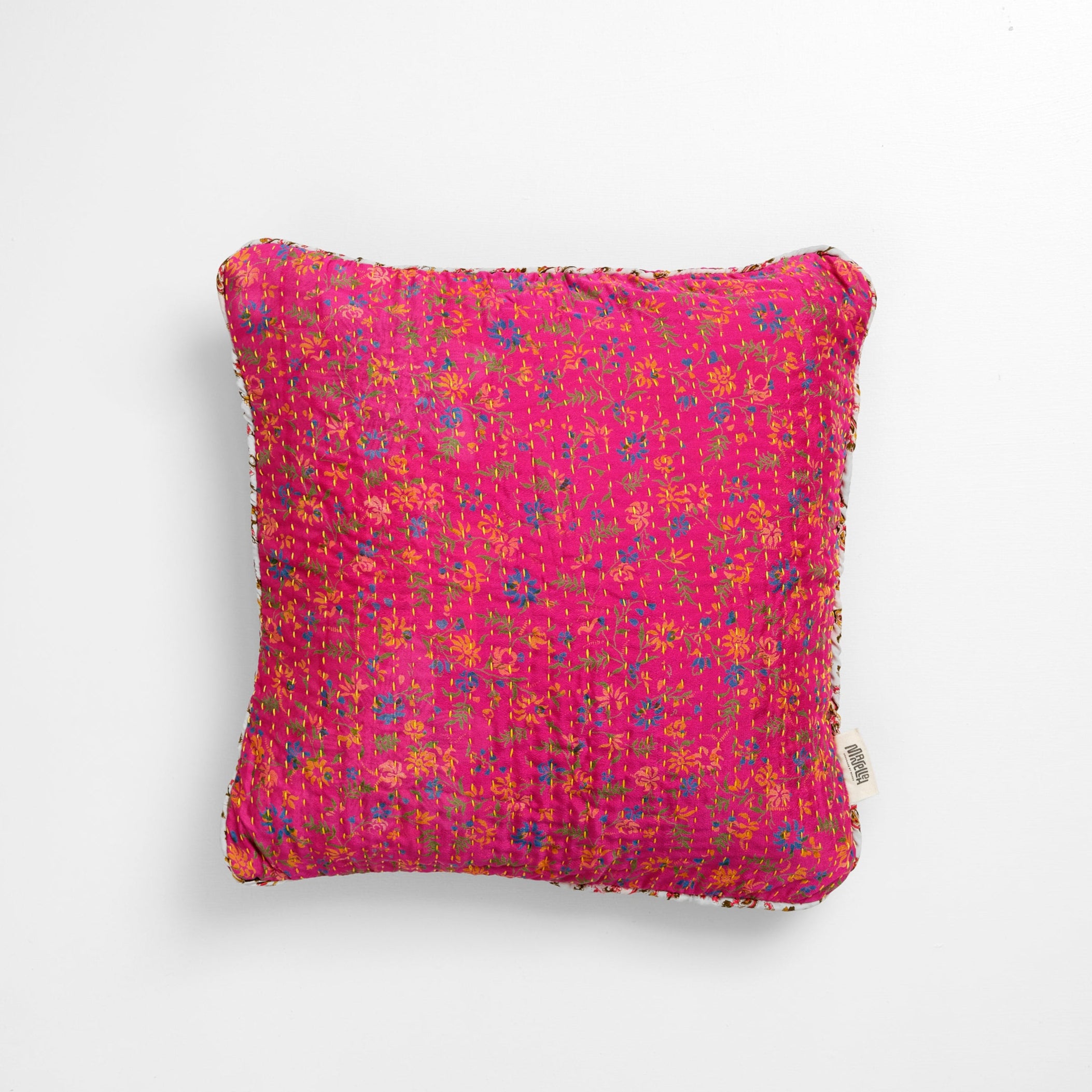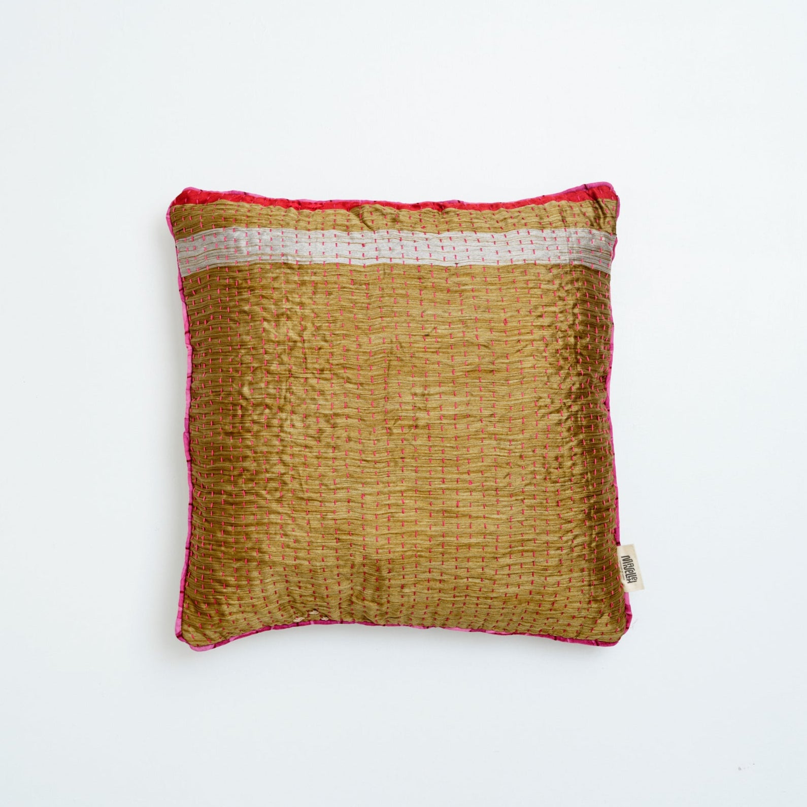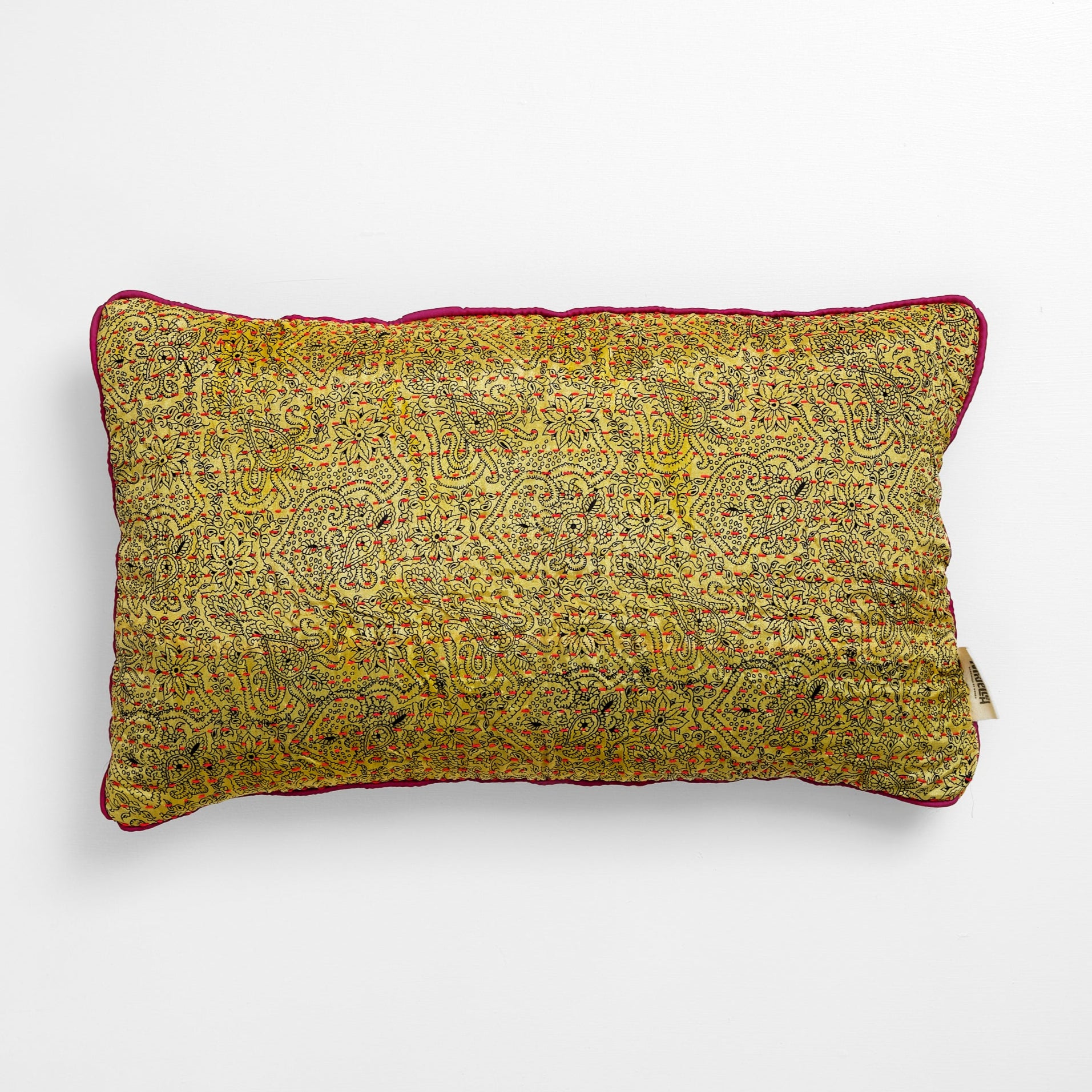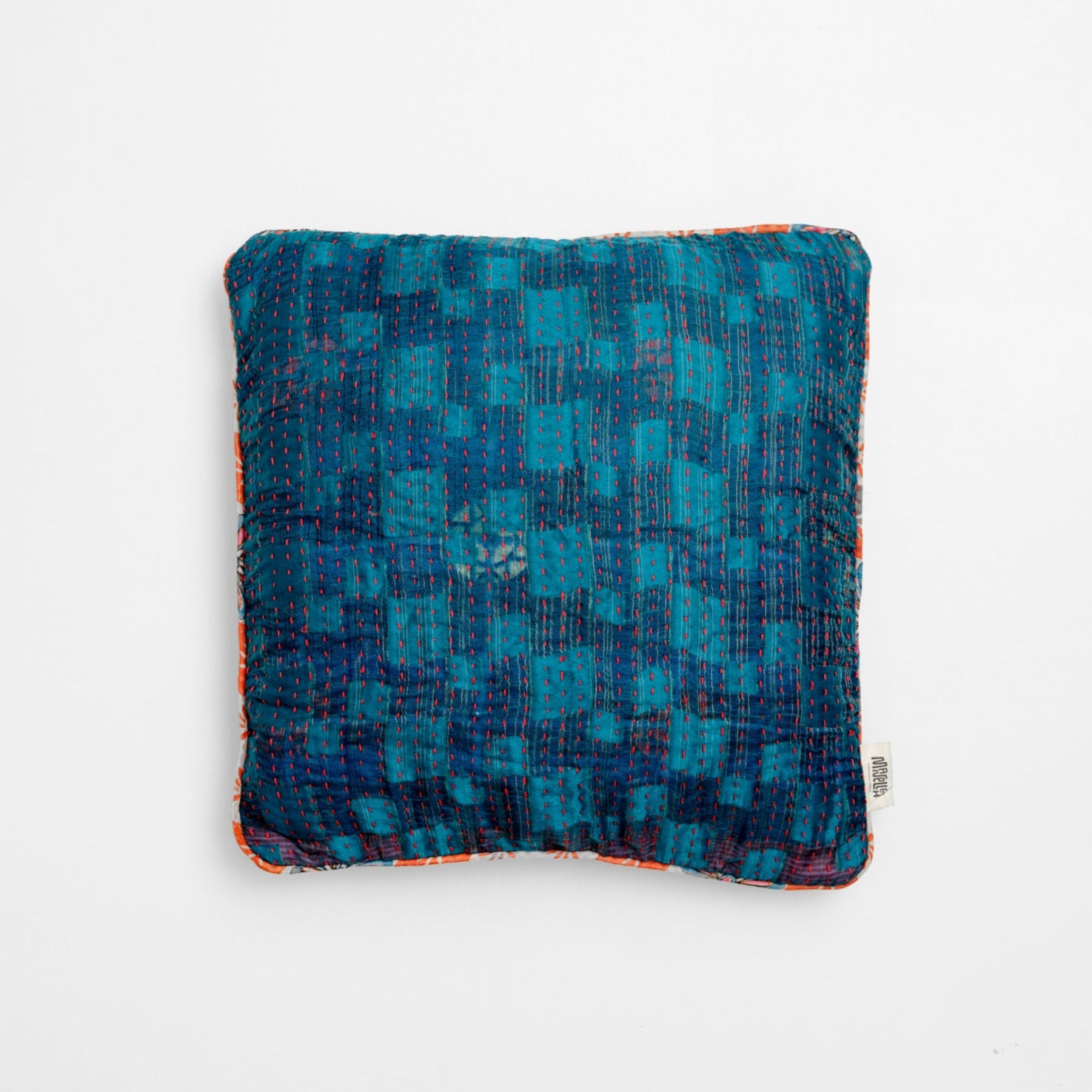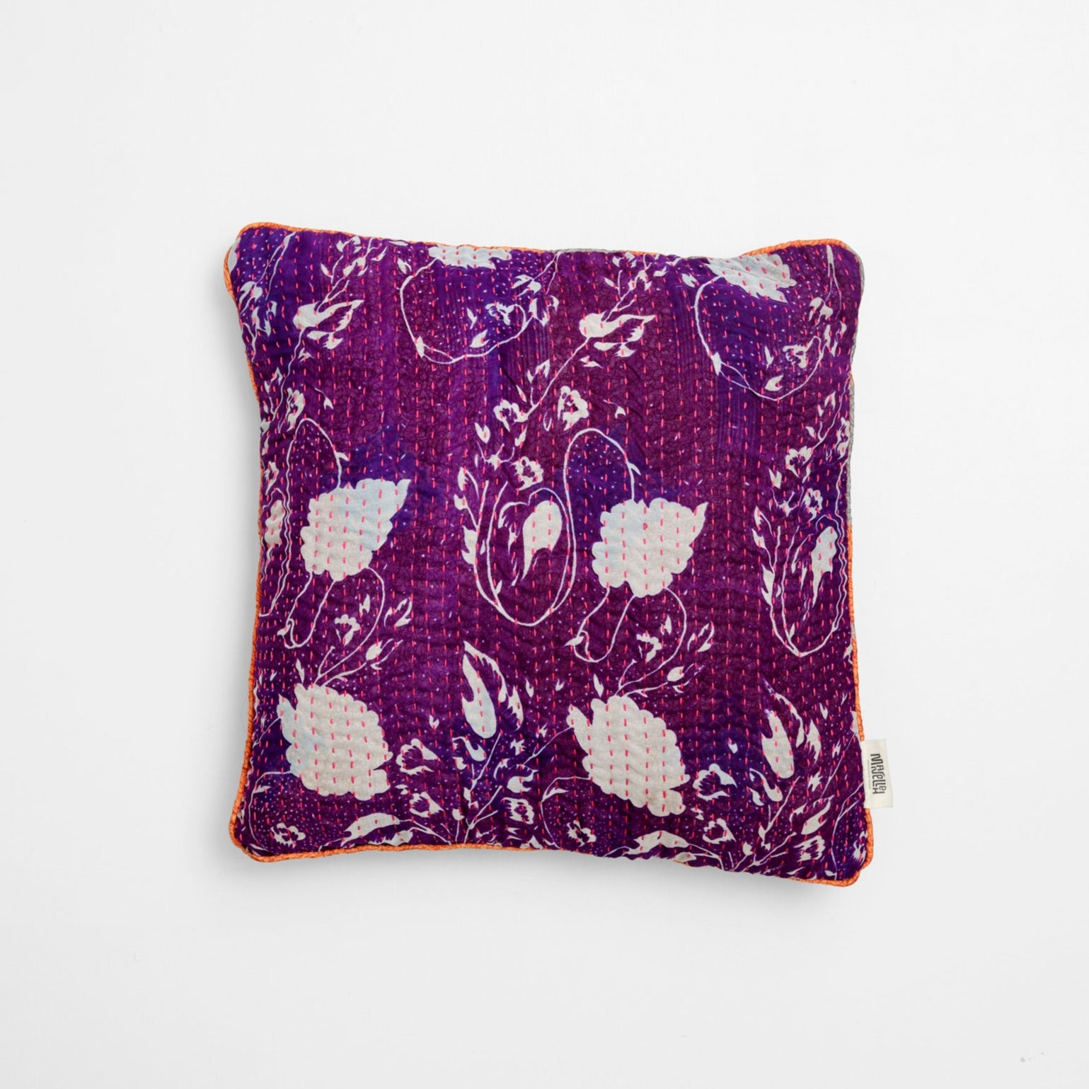 En lille pude måler 30x50 cm eller 40x40 cm, og de mange puder er syet med fire lag vintage sarier. De alle lavet af vintage silke sarier.