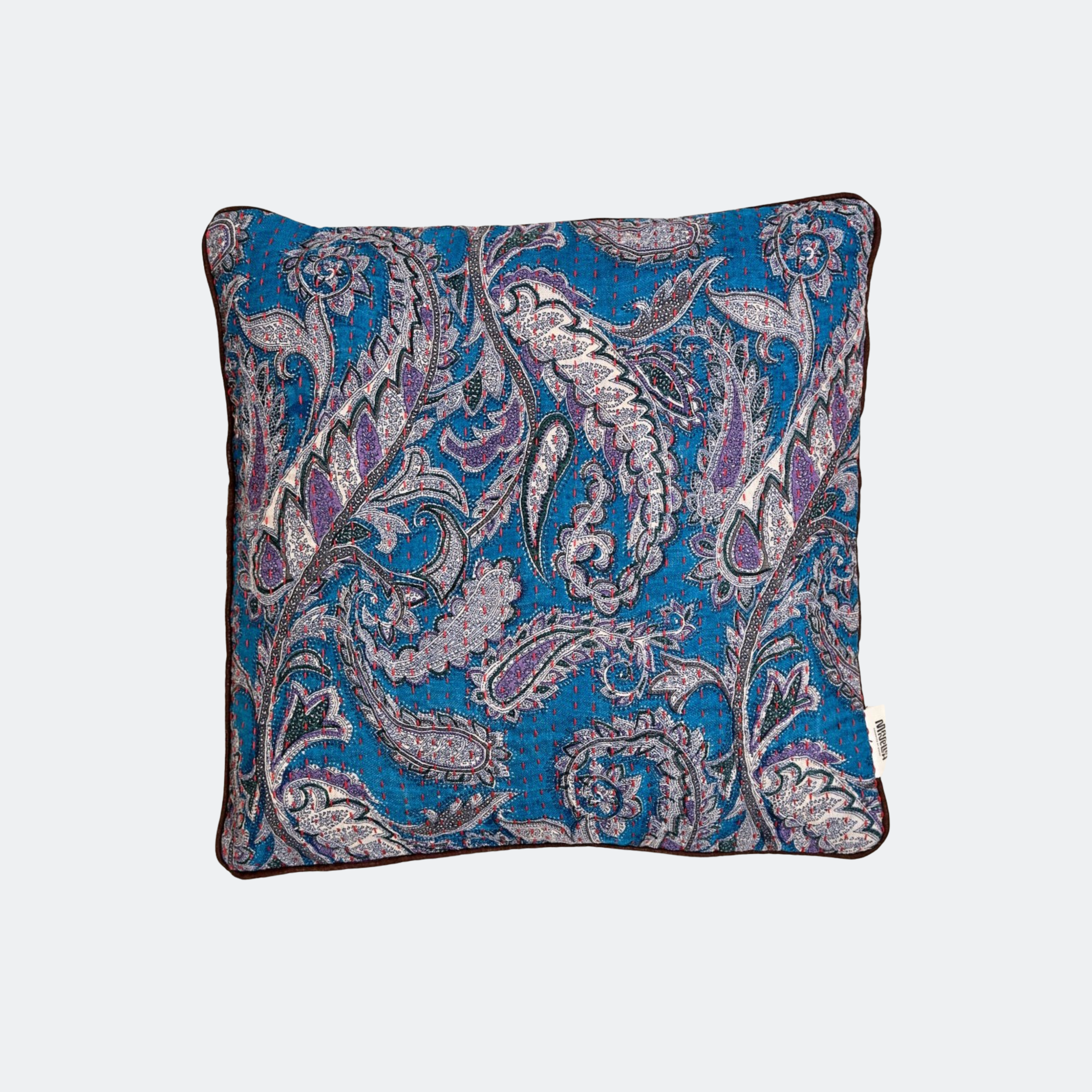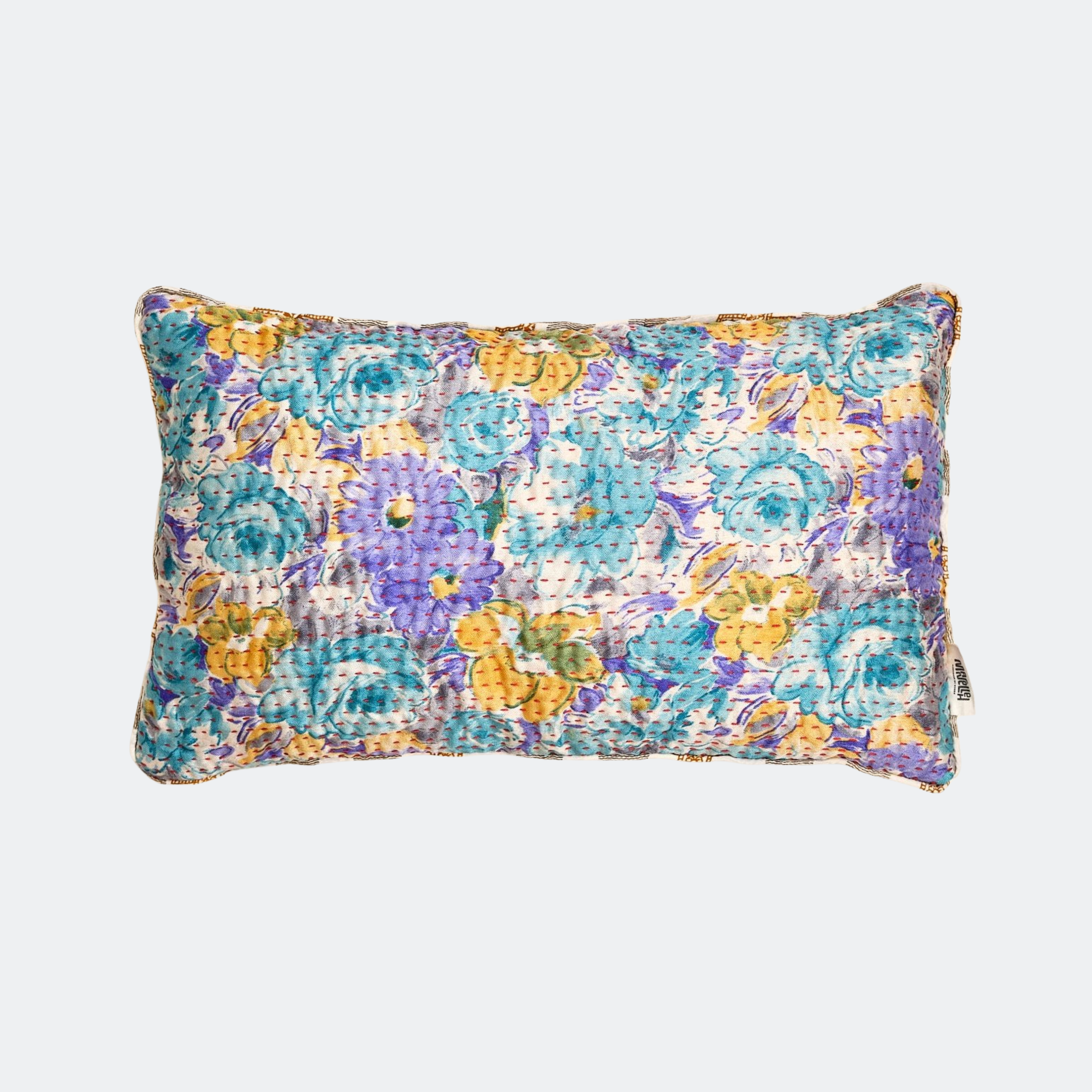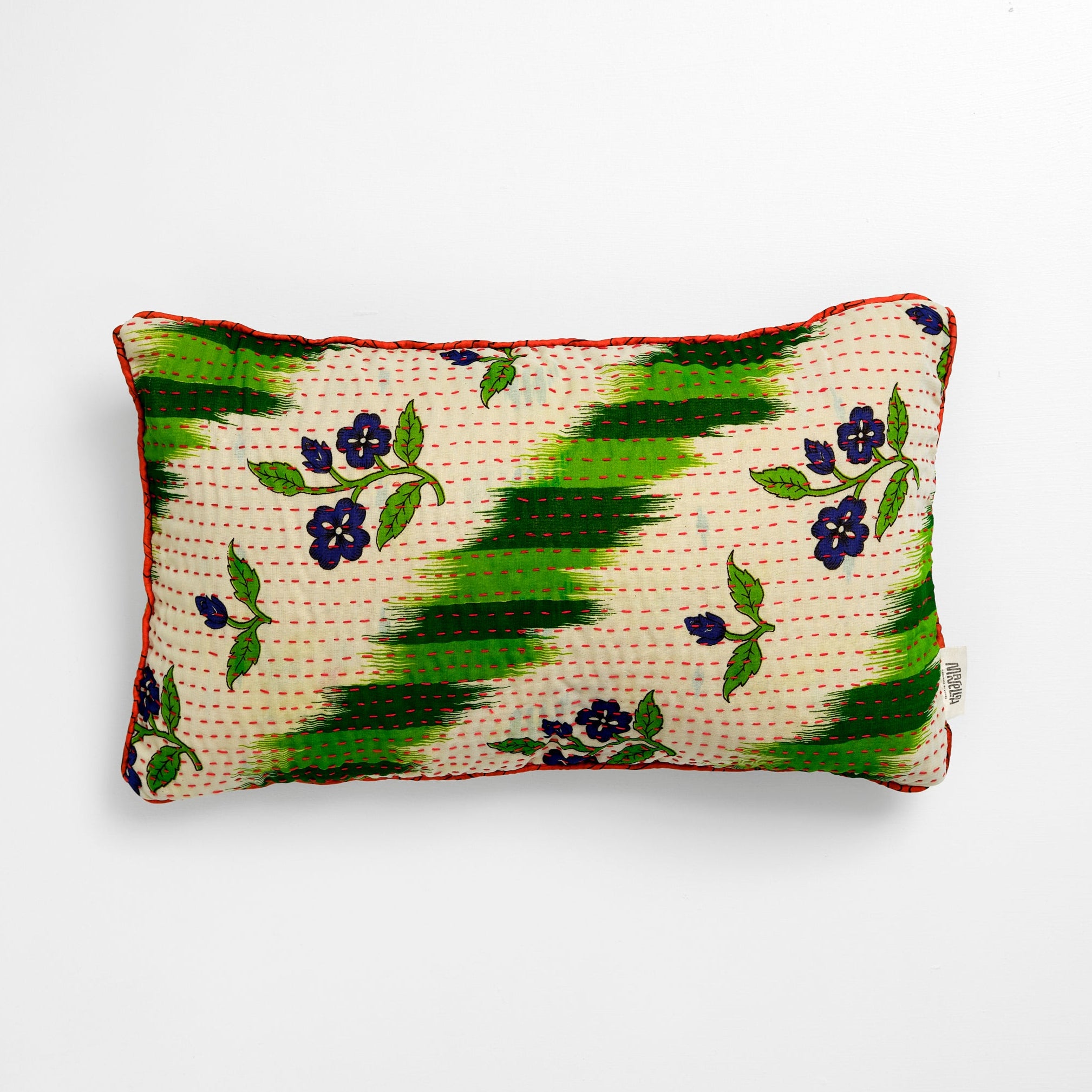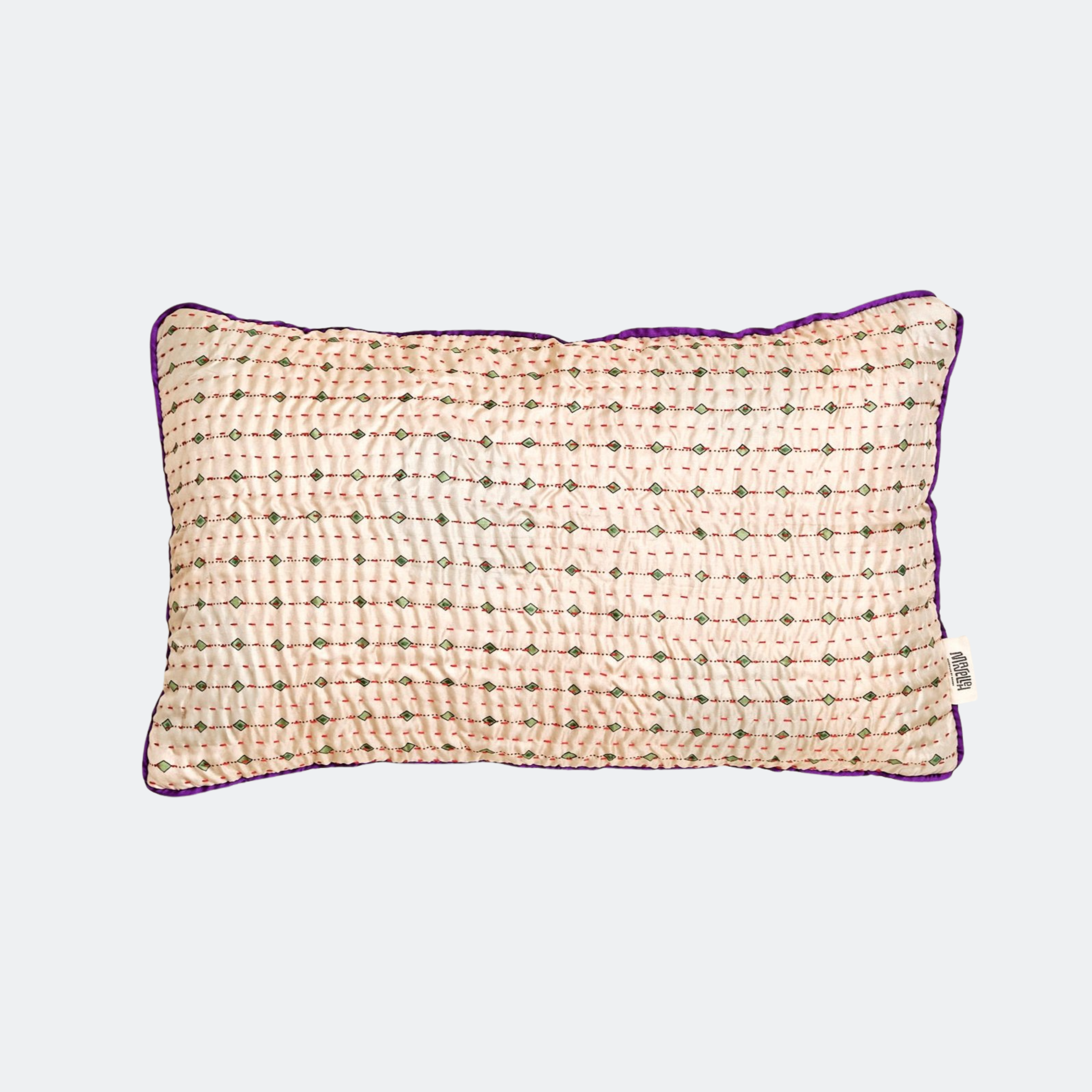 En lille pude måler 30x50 cm eller 40x40 cm, og de mange puder er syet med fire lag vintage sarier. De alle lavet af vintage silke sarier.