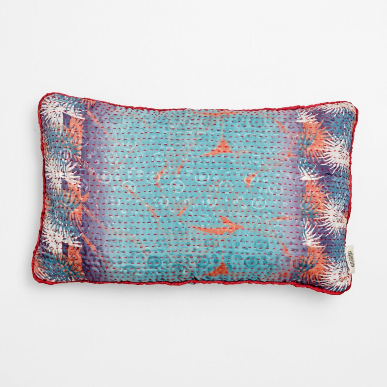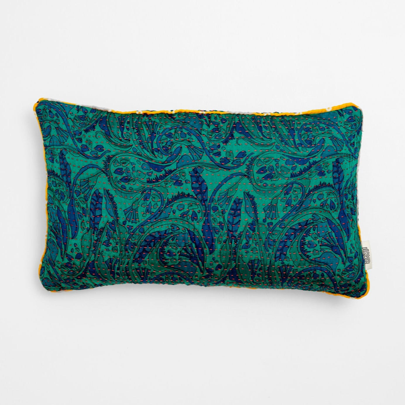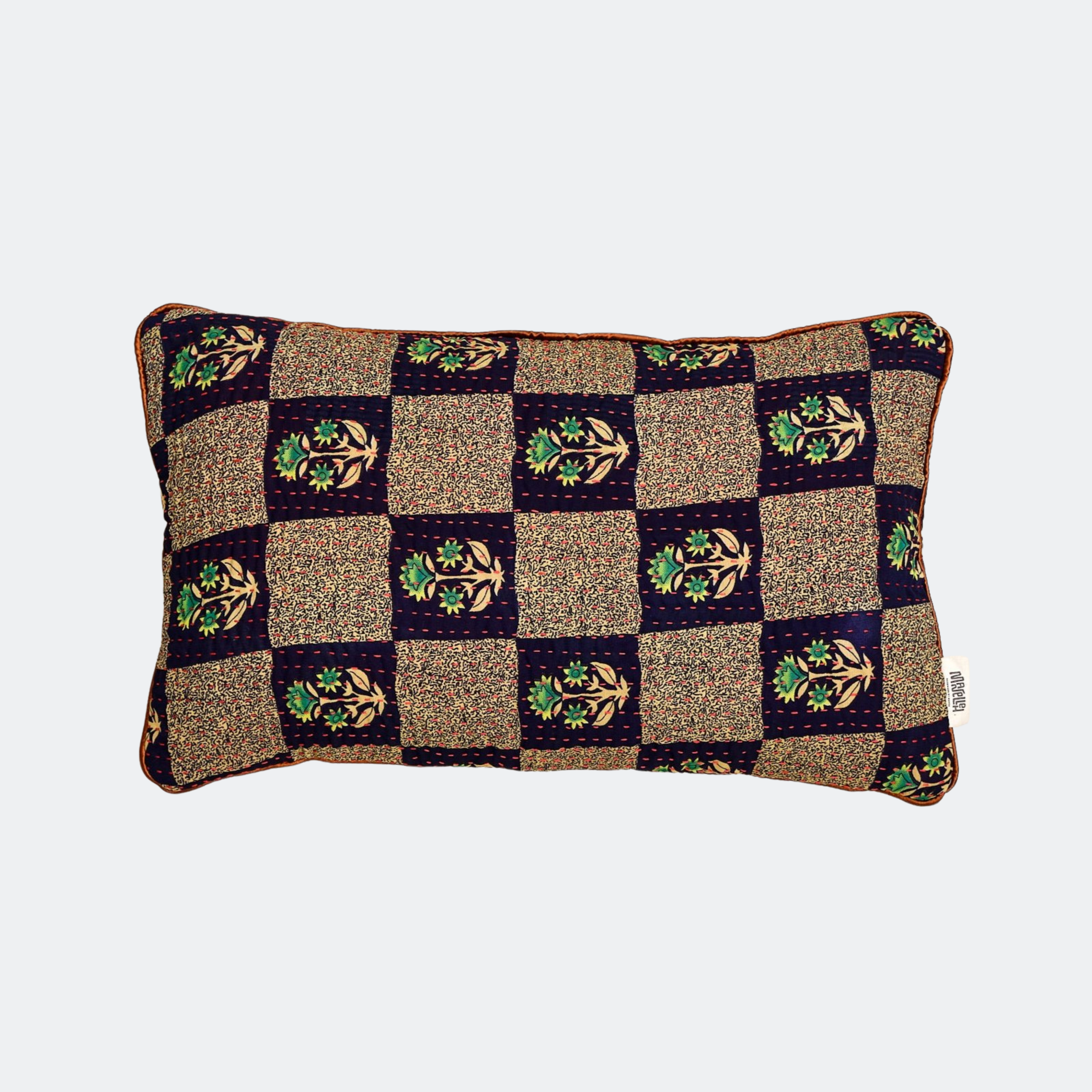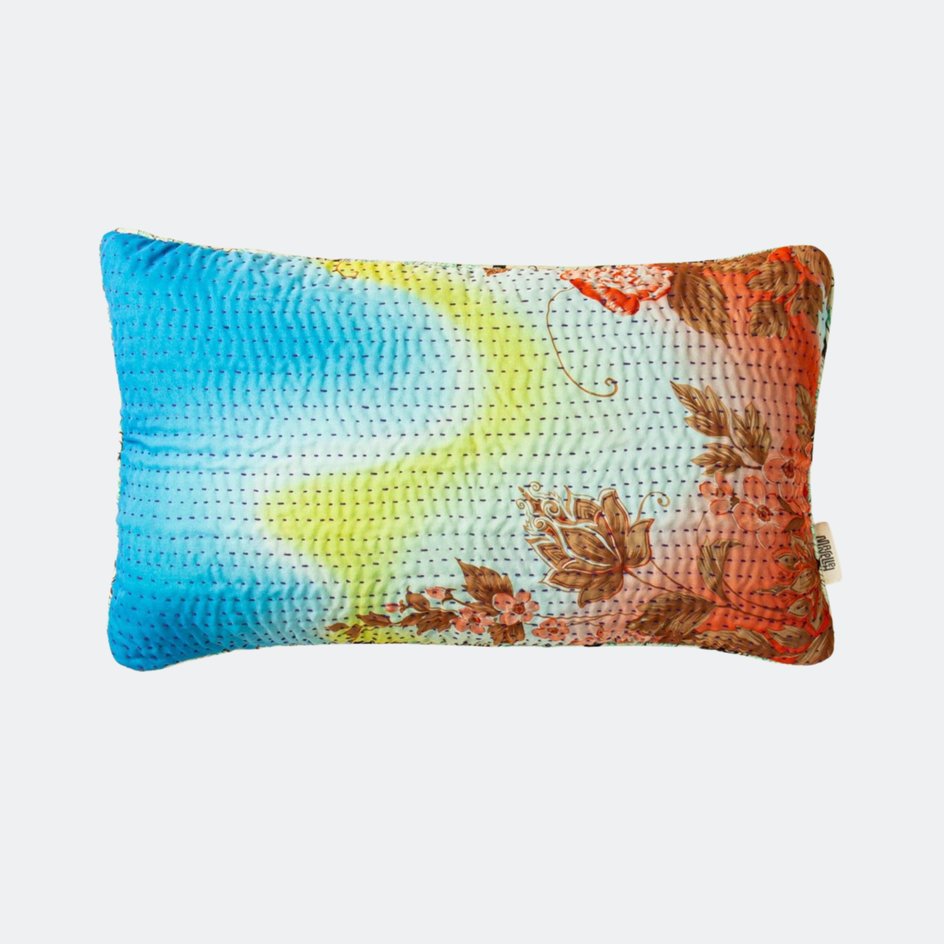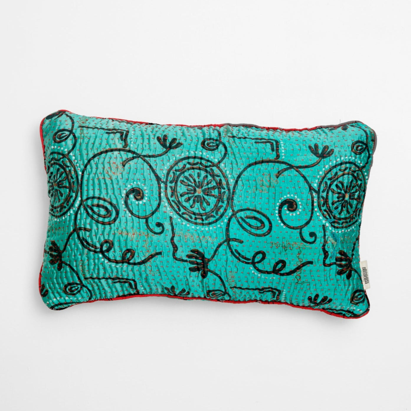 En lille pude måler 30x50 cm eller 40x40 cm, og de mange puder er syet med fire lag vintage sarier. De alle lavet af vintage silke sarier.