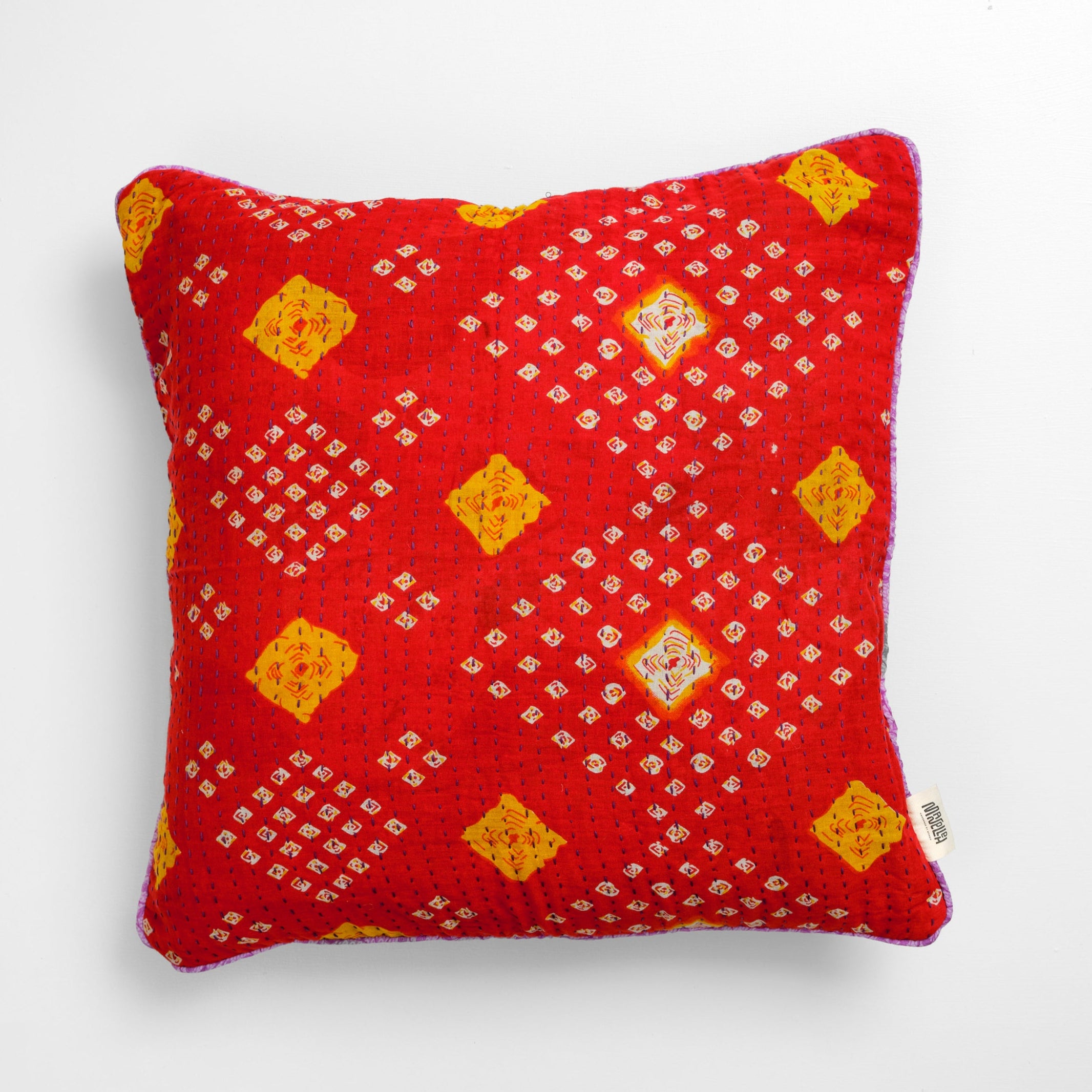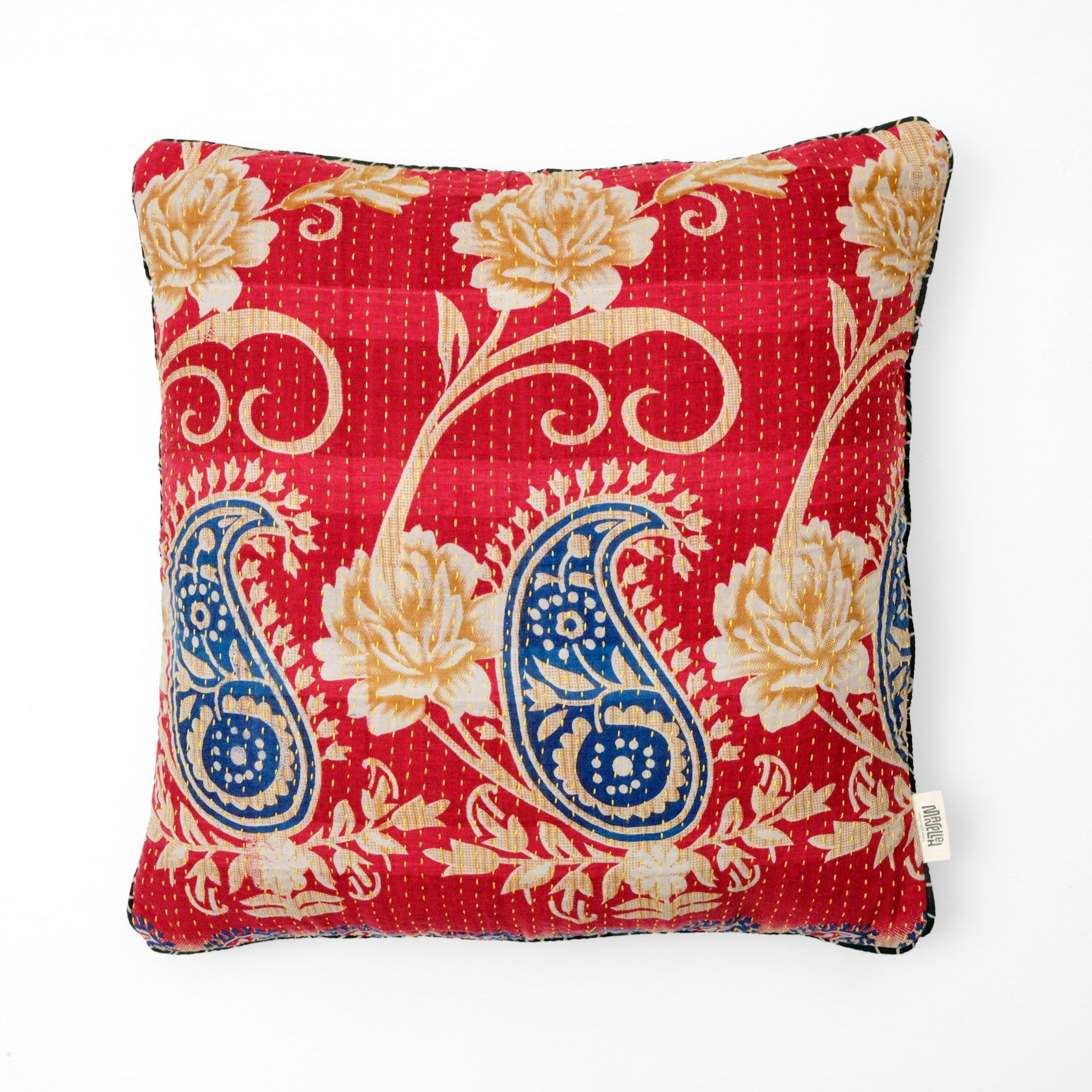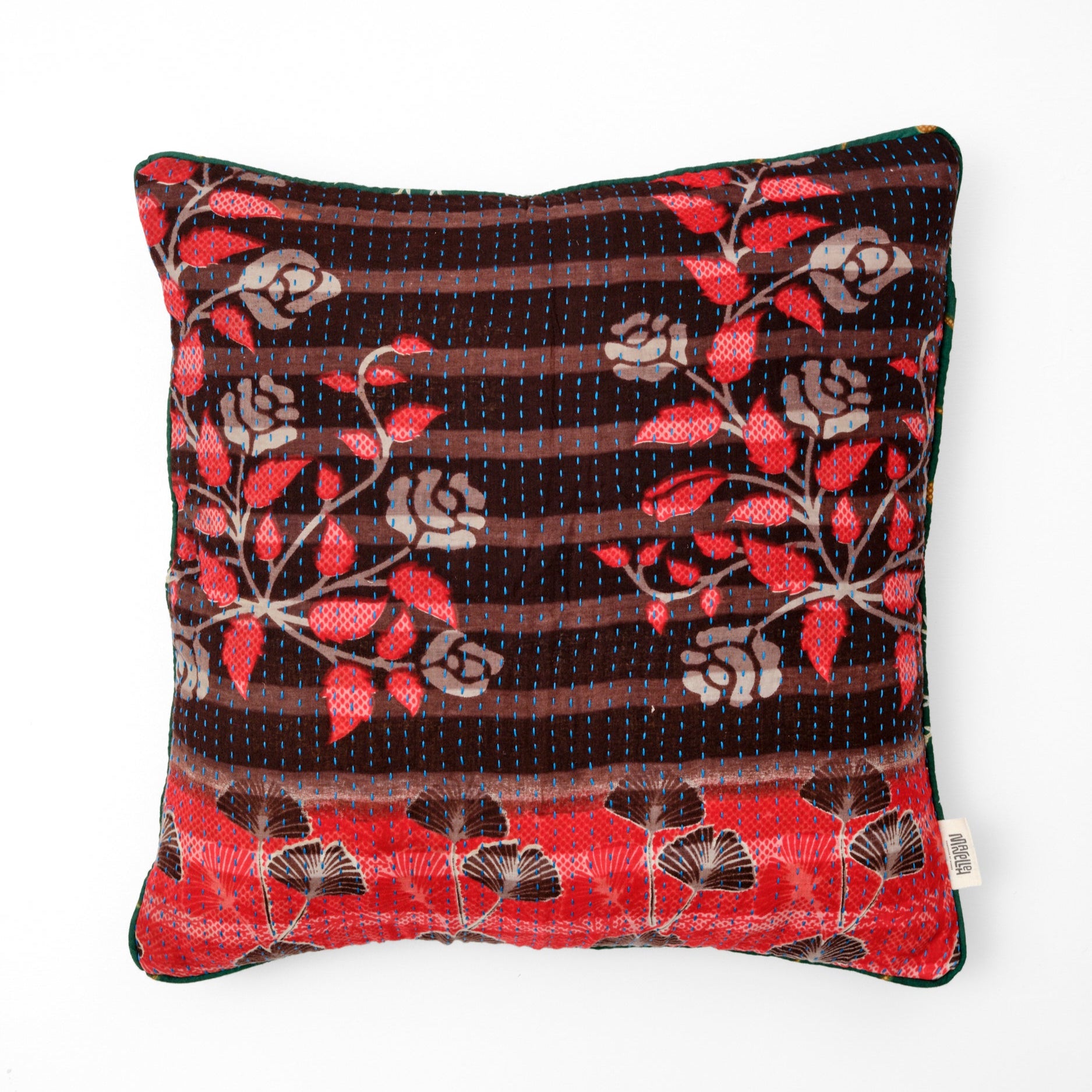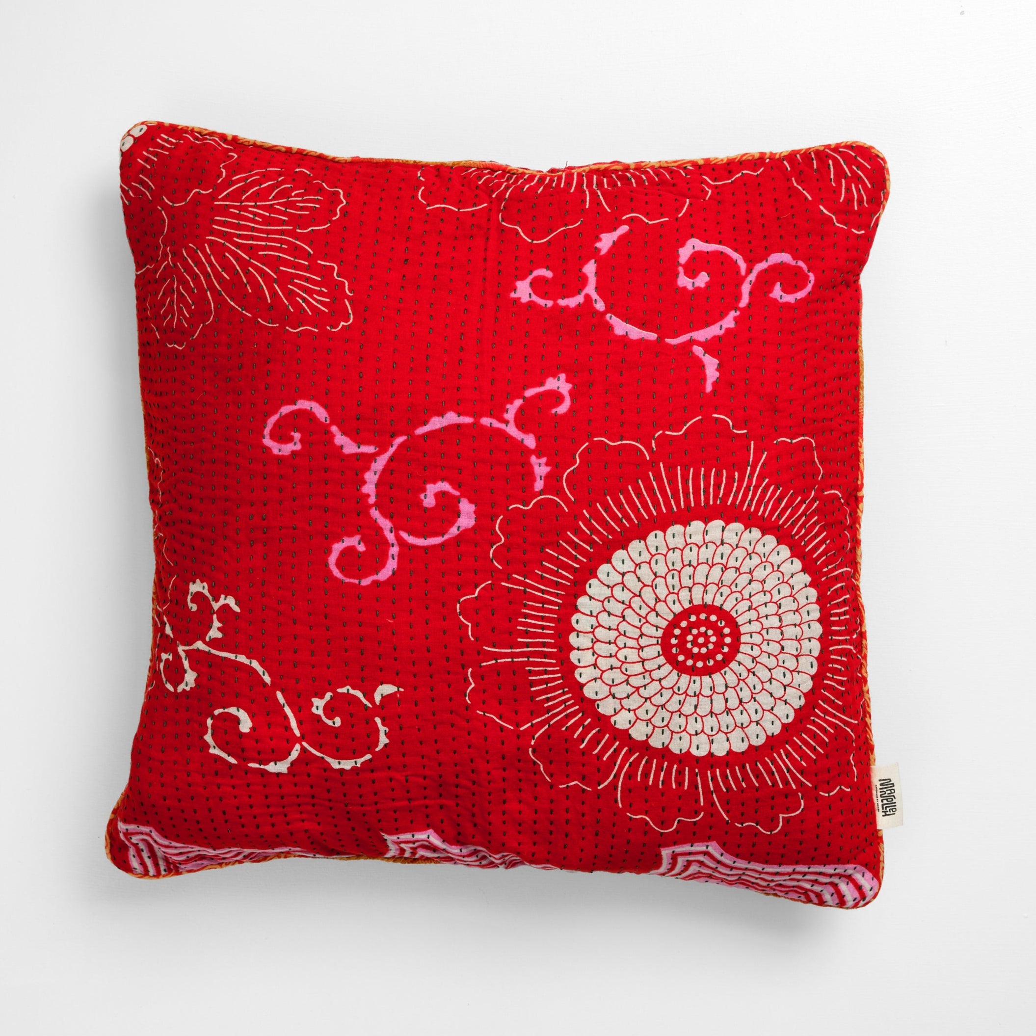 De mange smukke røde puder er syet med fire lag vintage sarier. De findes i bomuld og silke og er lavet i størrelserne: 30x50 cm, 40x60 cm, 40x40 cm, 50x50 cm og 60x60 cm.