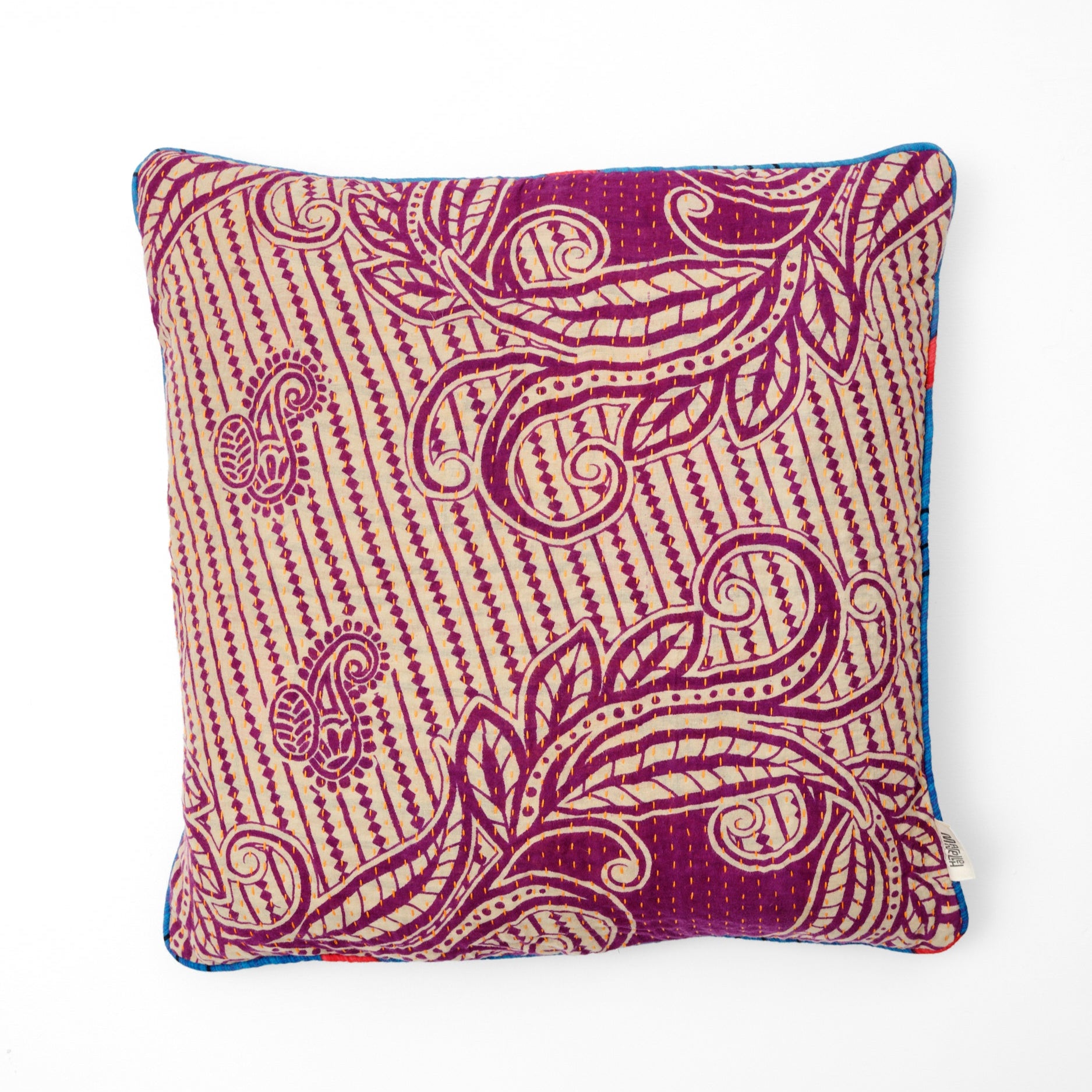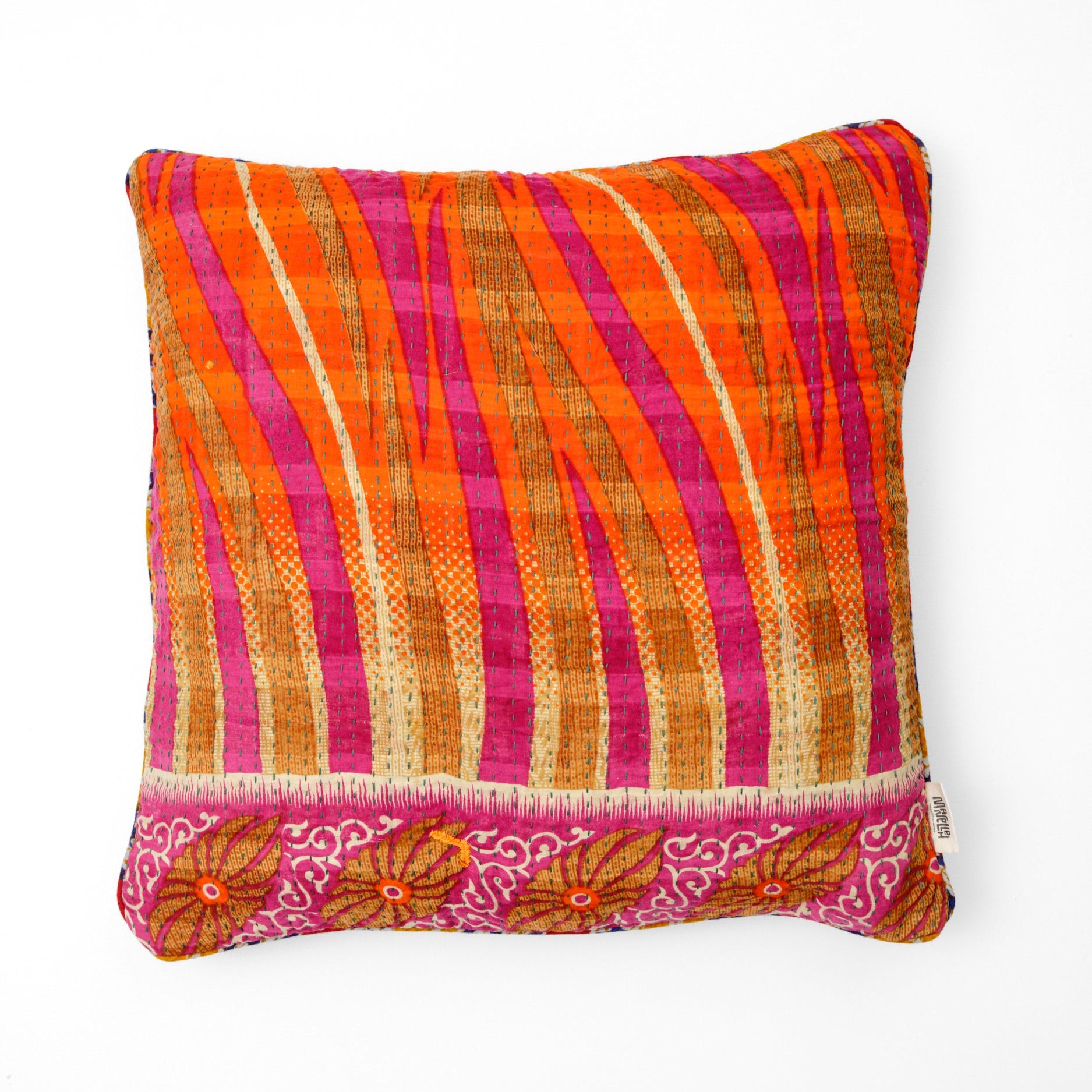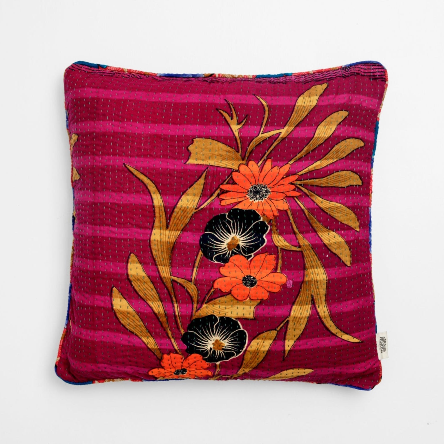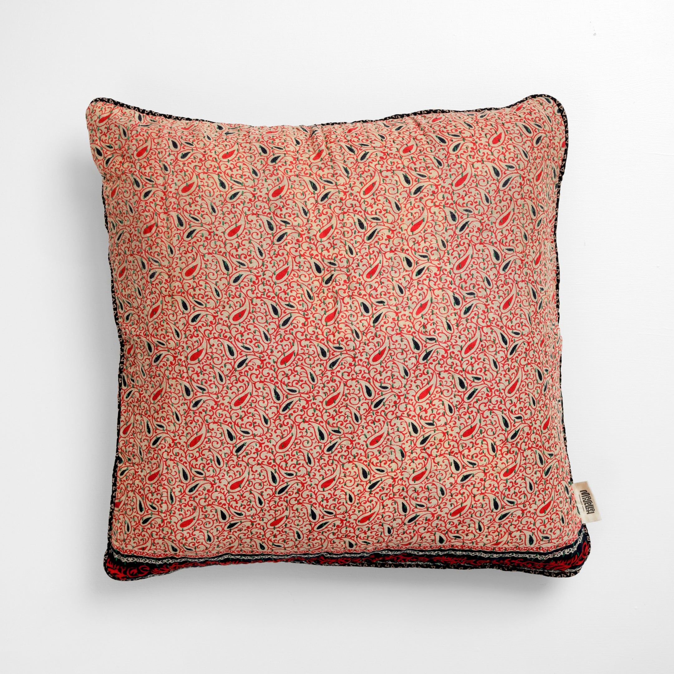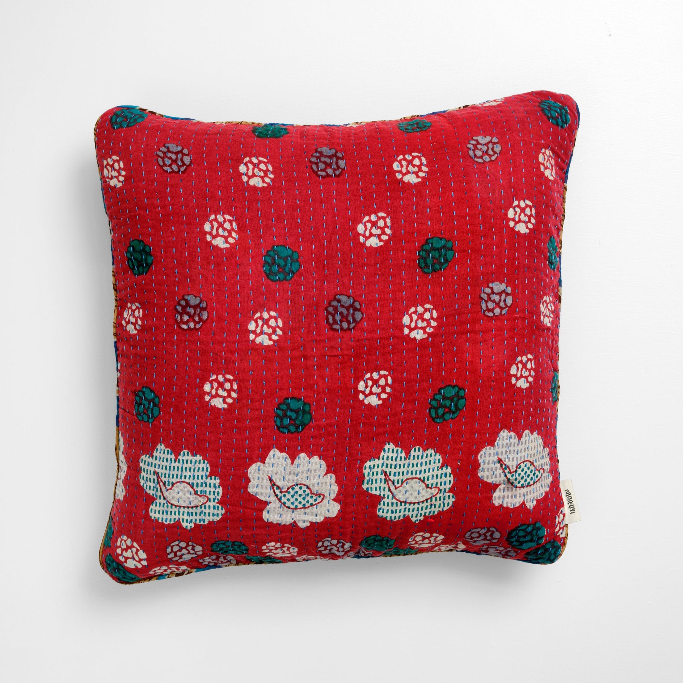 De mange smukke røde puder er syet med fire lag vintage sarier. De findes i bomuld og silke og er lavet i størrelserne: 30x50 cm, 40x60 cm, 40x40 cm, 50x50 cm og 60x60 cm.
