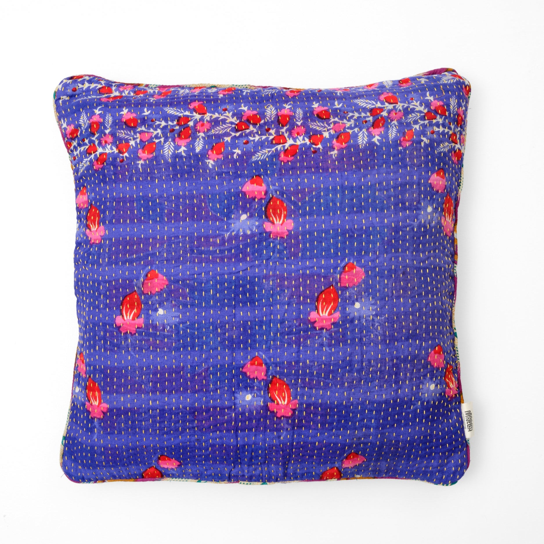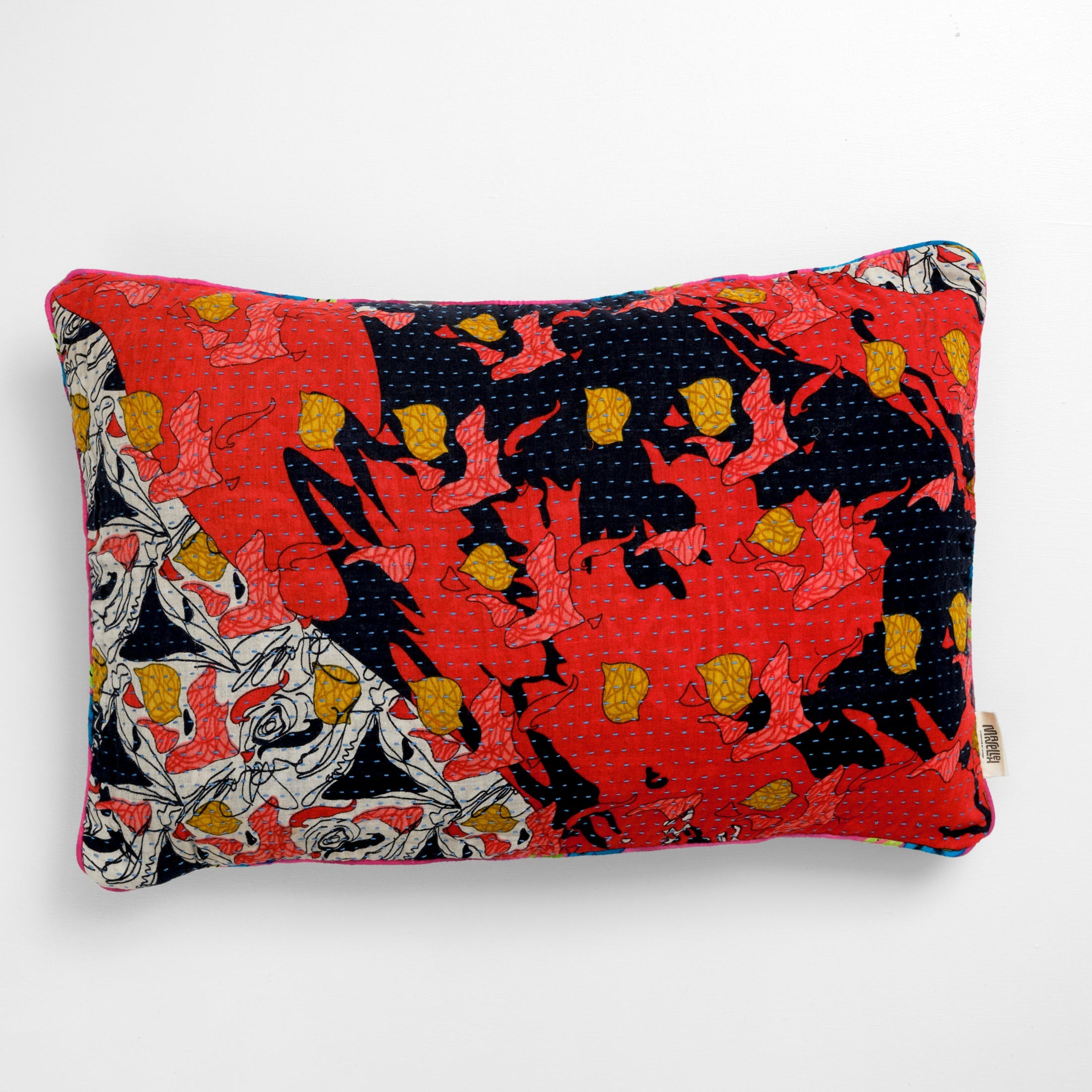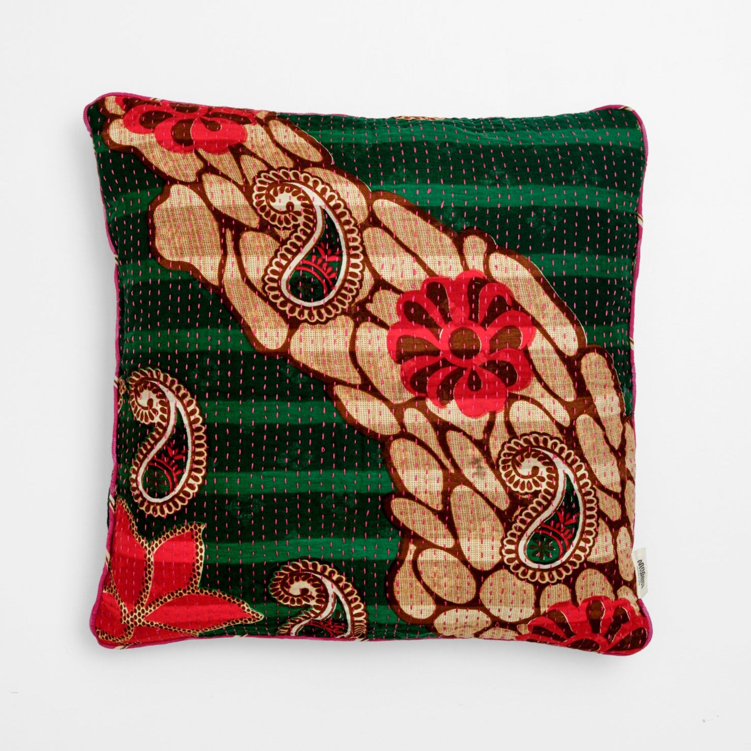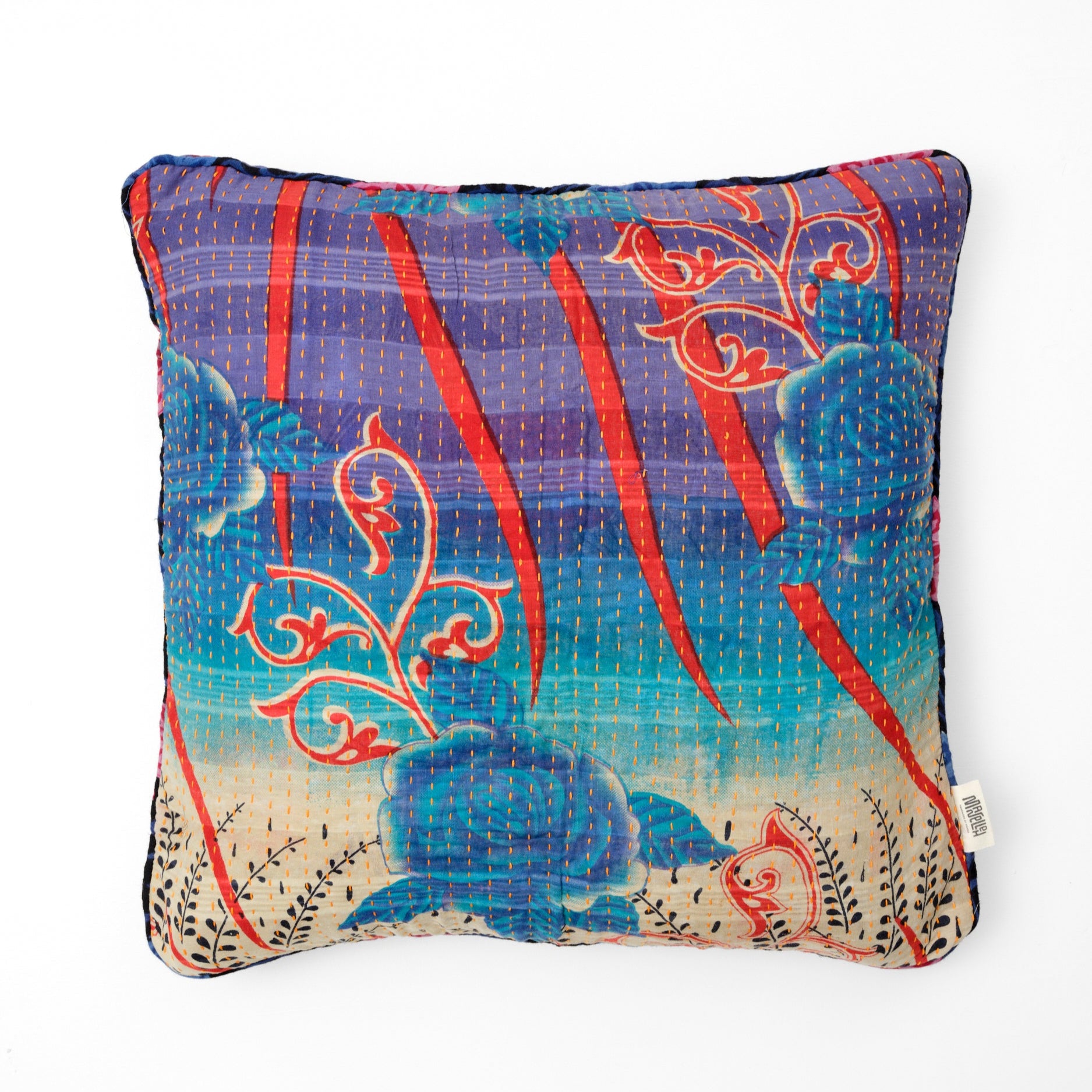 De mange smukke røde puder er syet med fire lag vintage sarier. De findes i bomuld og silke og er lavet i størrelserne: 30x50 cm, 40x60 cm, 40x40 cm, 50x50 cm og 60x60 cm.