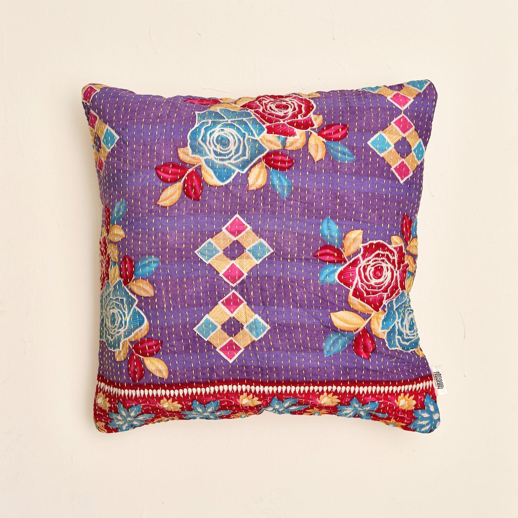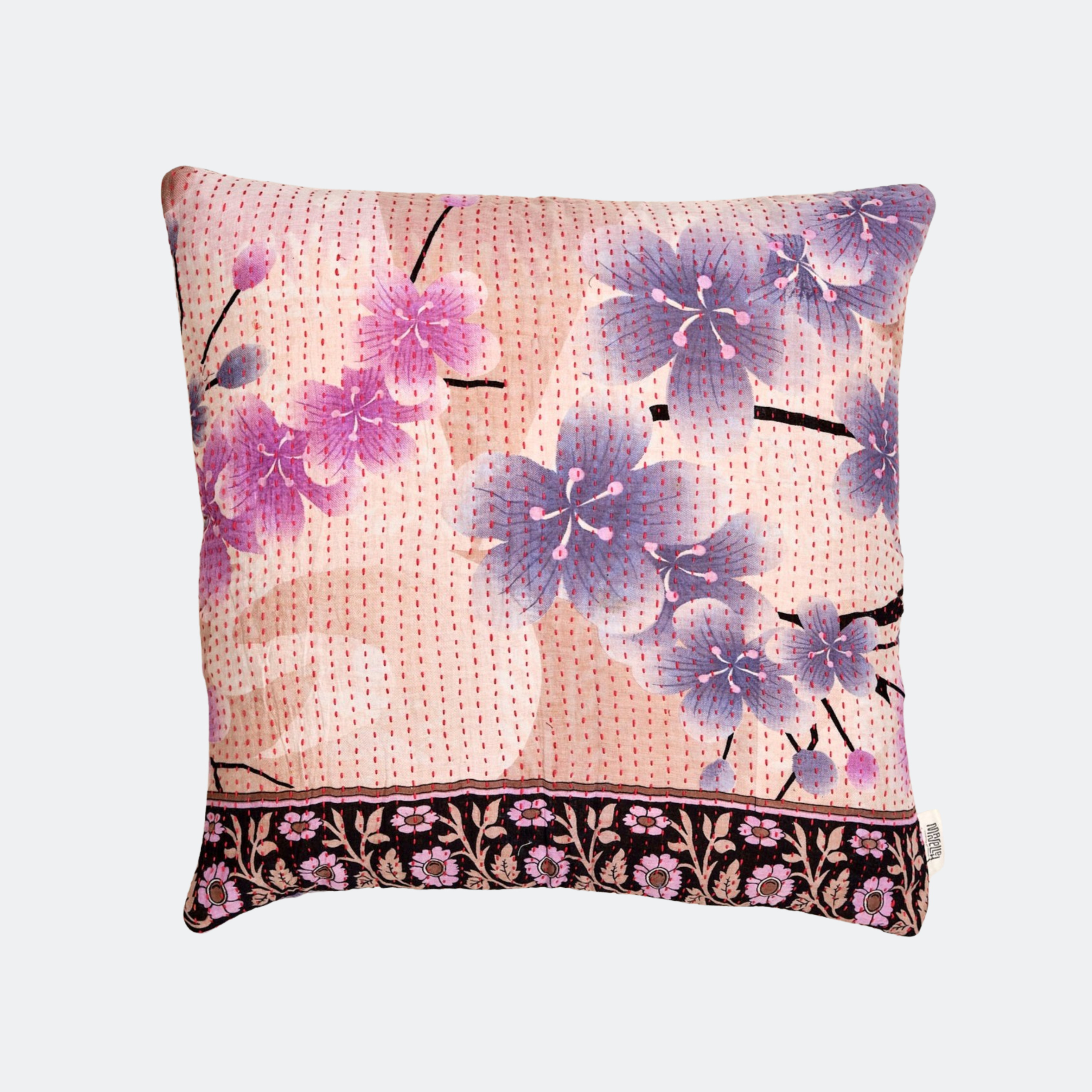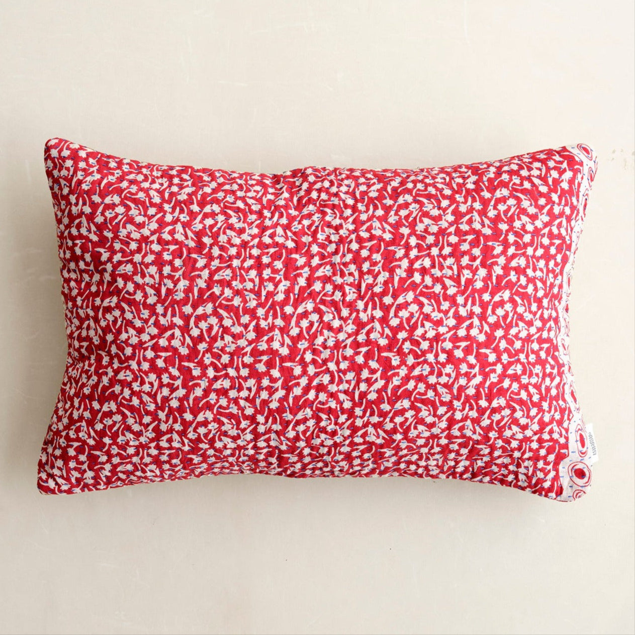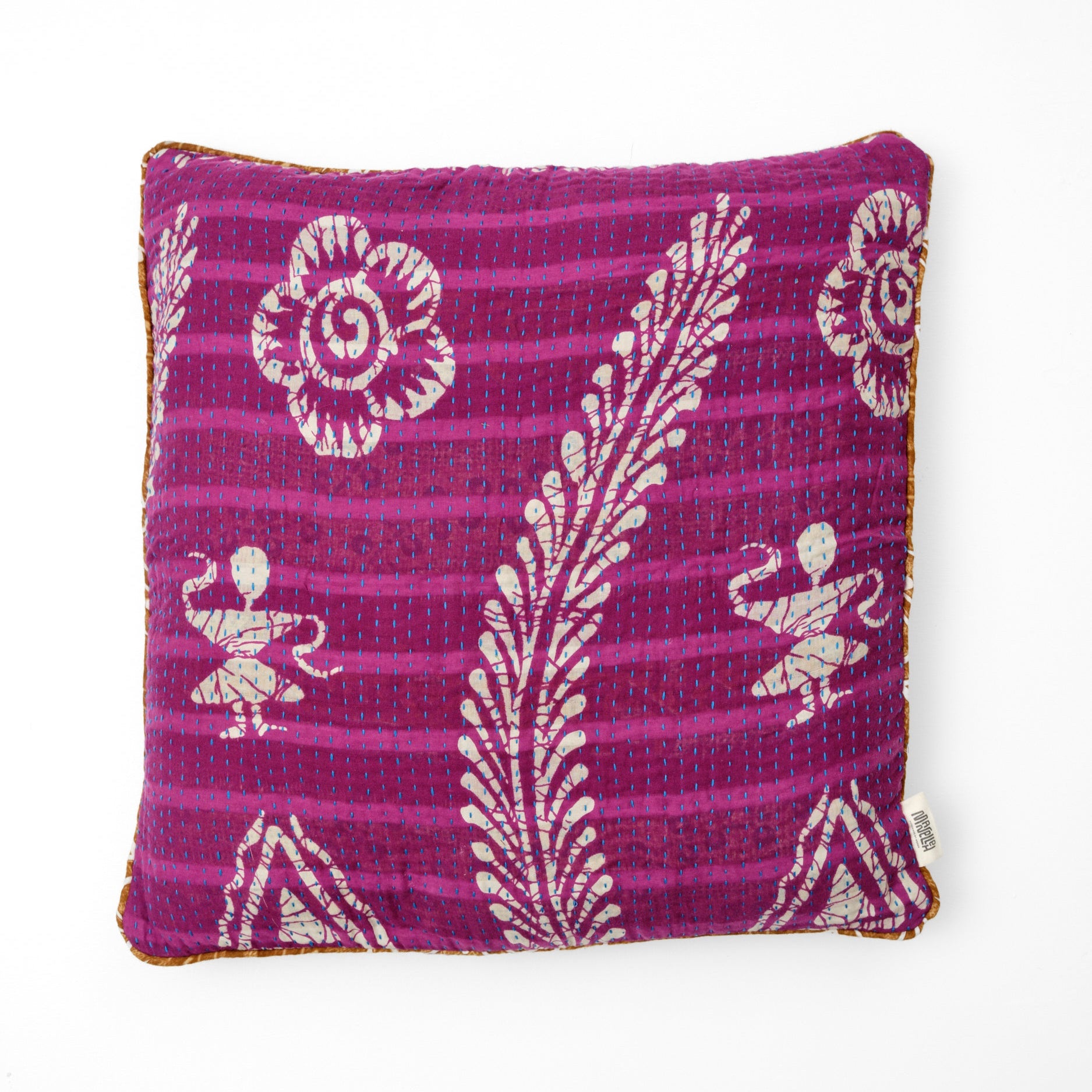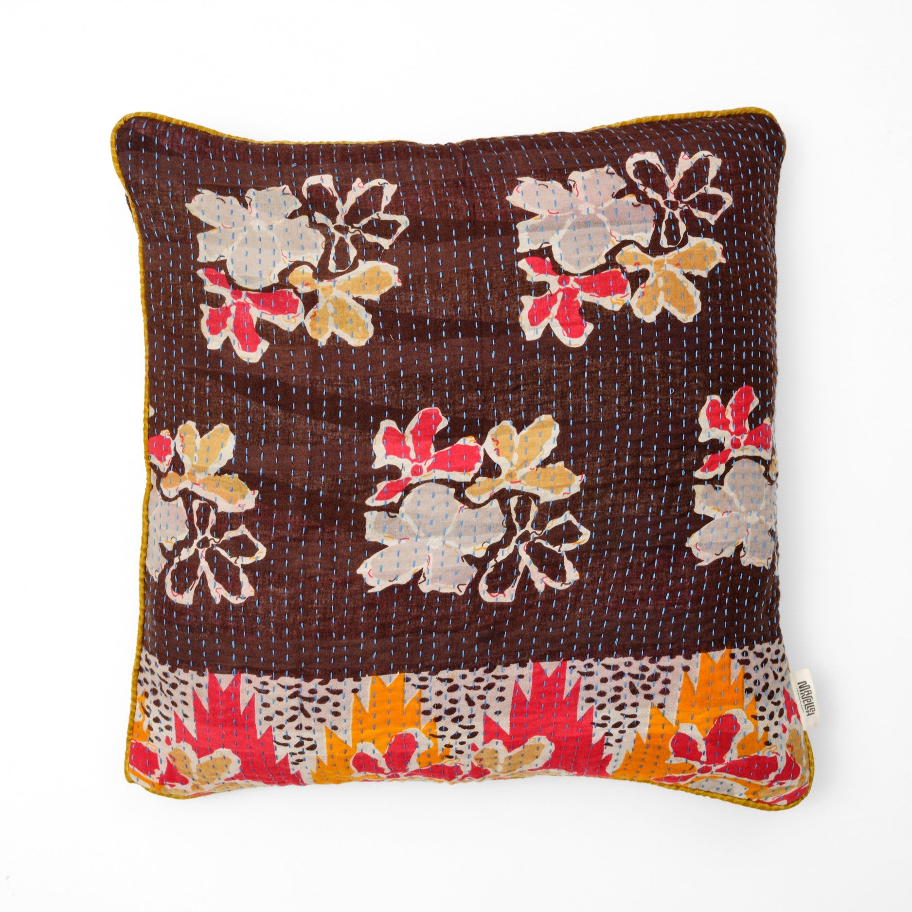 De mange smukke røde puder er syet med fire lag vintage sarier. De findes i bomuld og silke og er lavet i størrelserne: 30x50 cm, 40x60 cm, 40x40 cm, 50x50 cm og 60x60 cm.