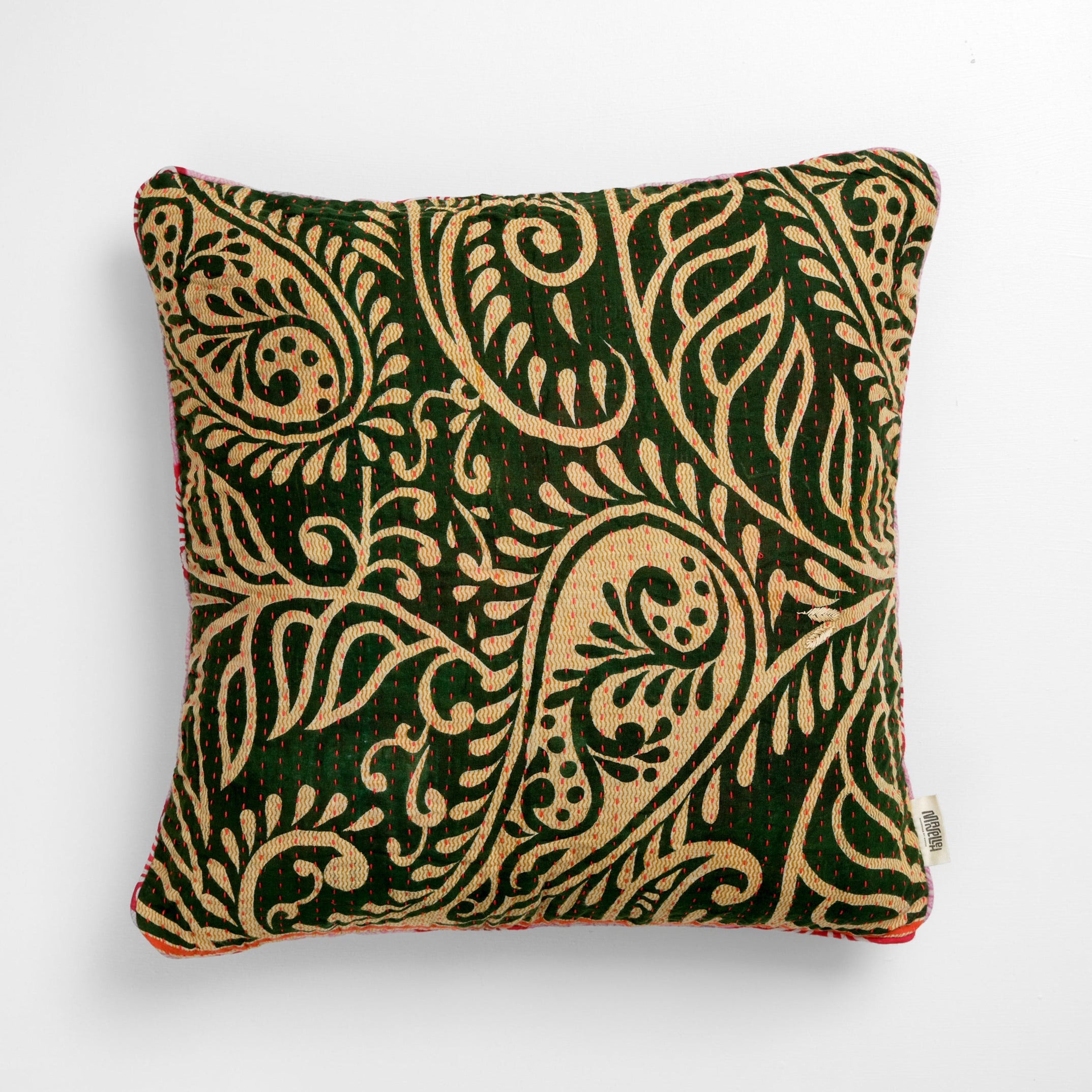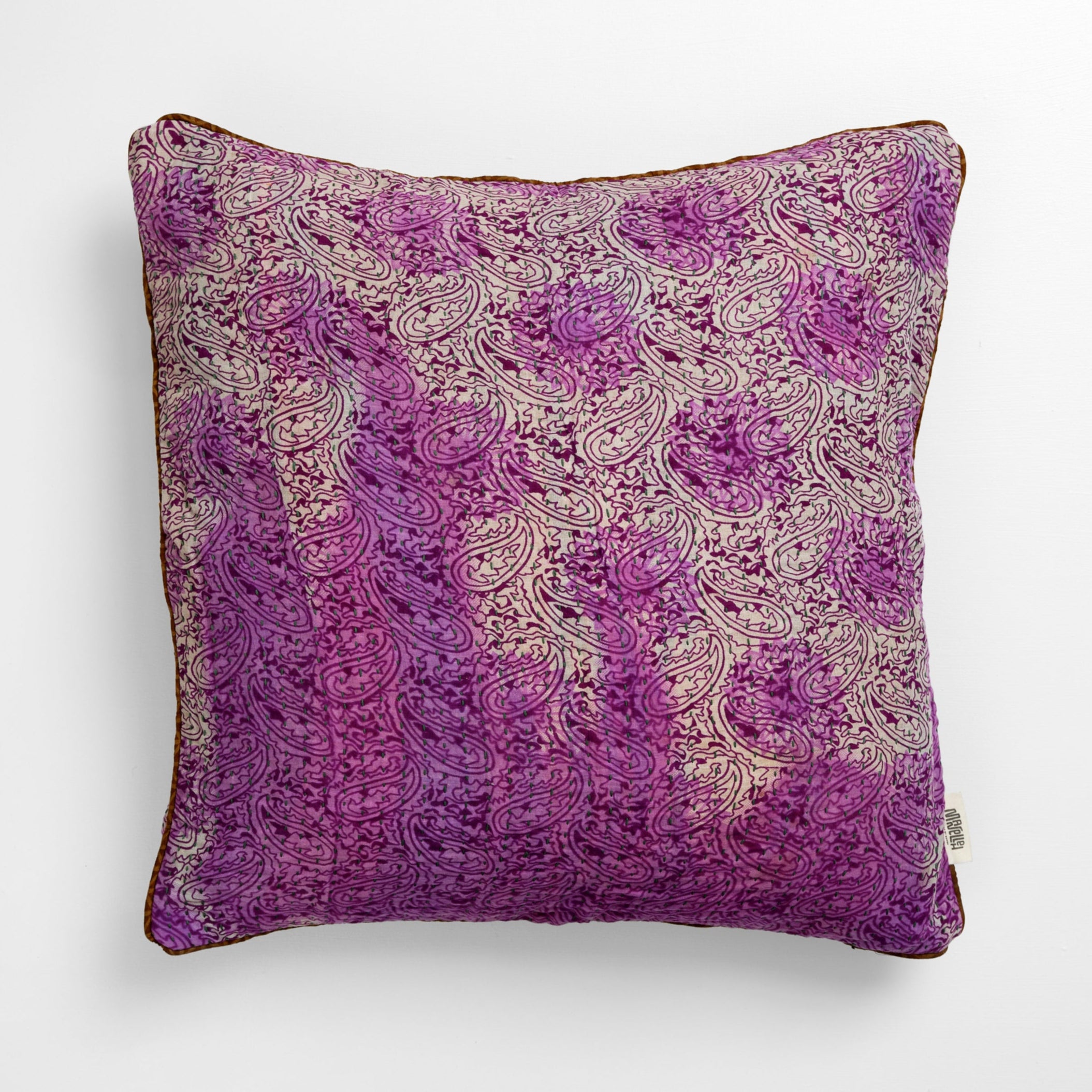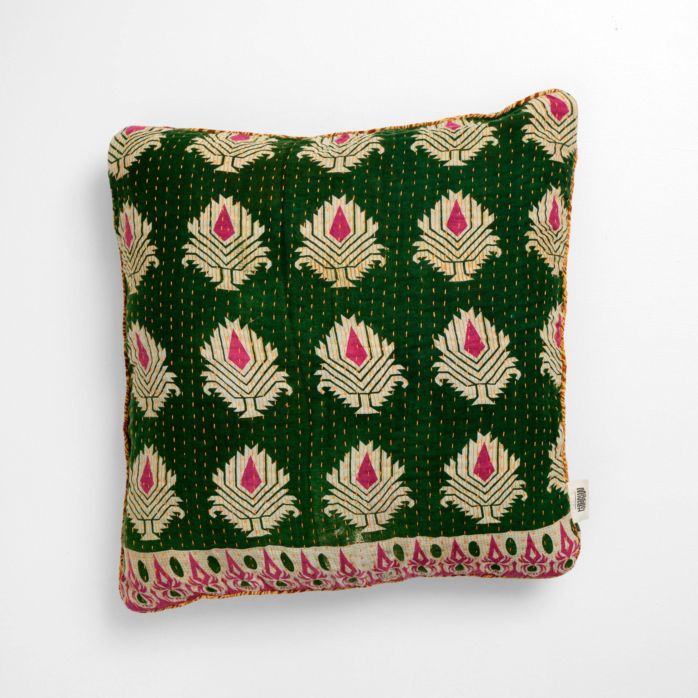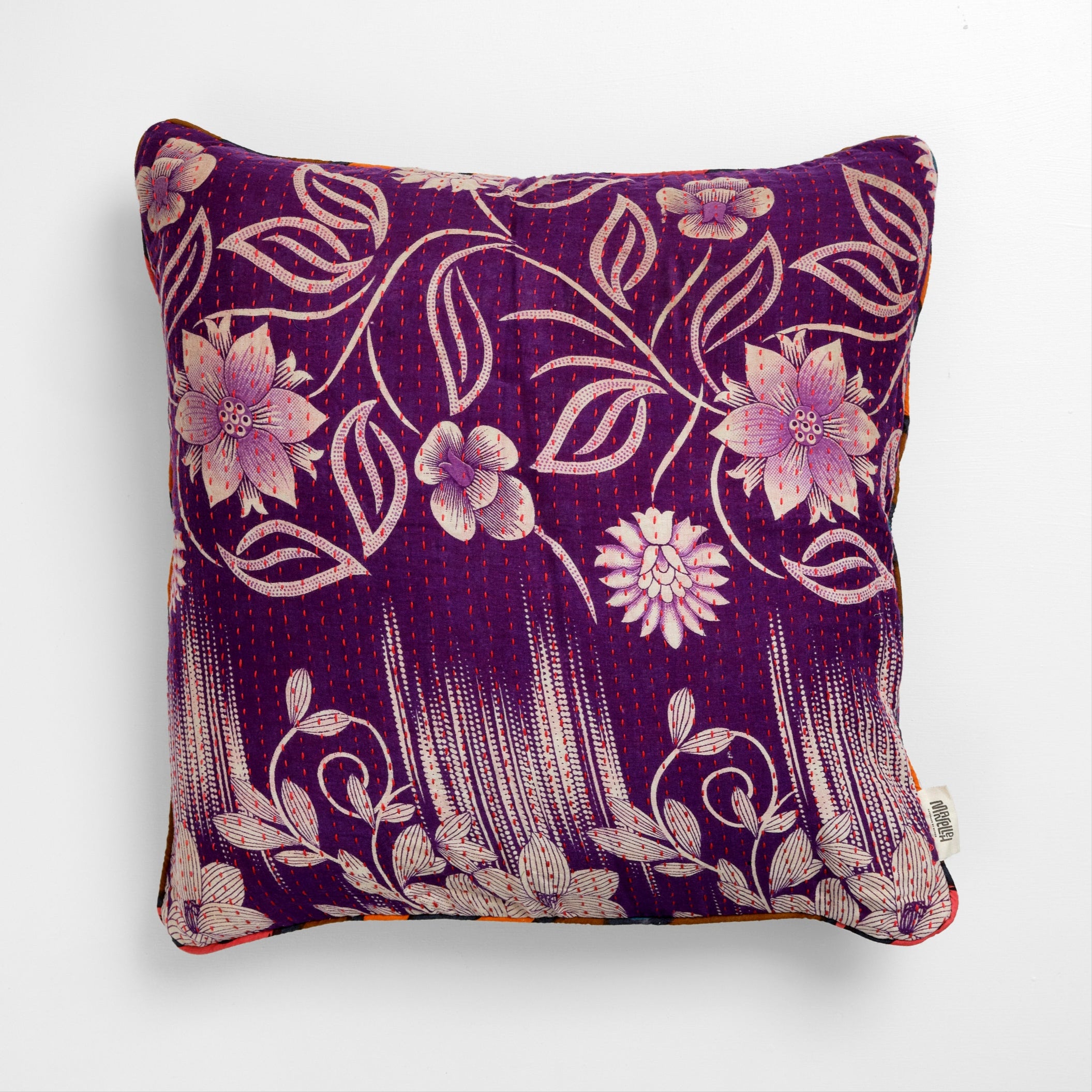 De mange smukke røde puder er syet med fire lag vintage sarier. De findes i bomuld og silke og er lavet i størrelserne: 30x50 cm, 40x60 cm, 40x40 cm, 50x50 cm og 60x60 cm.