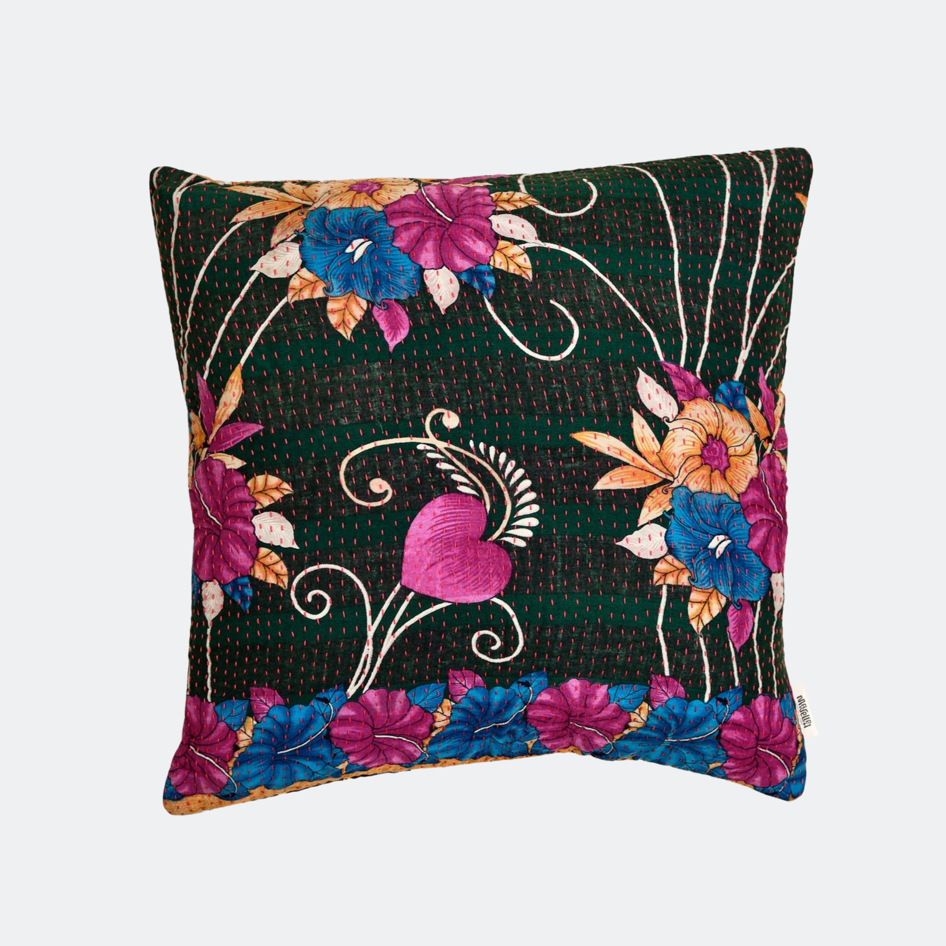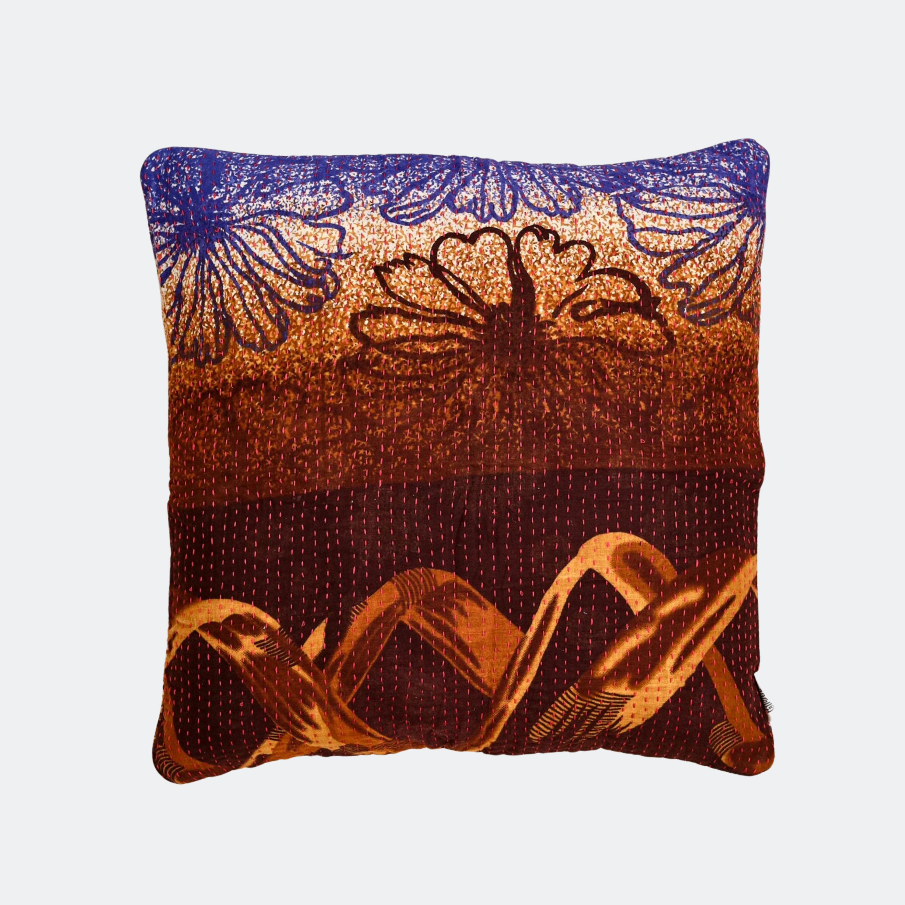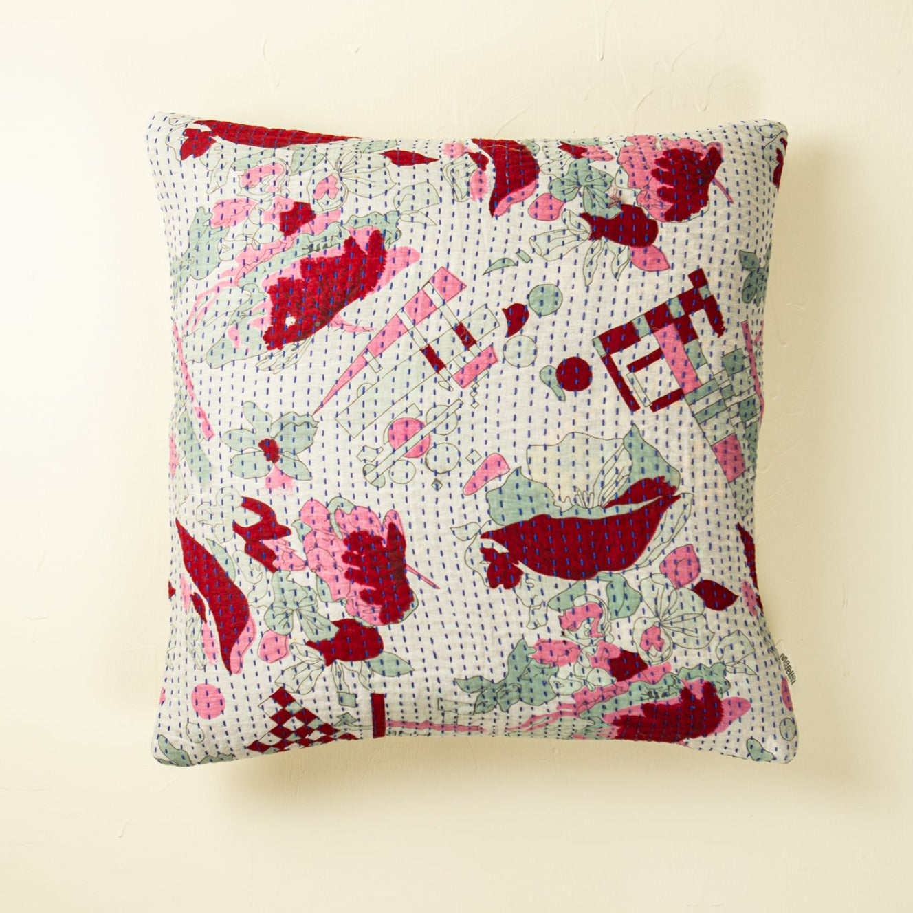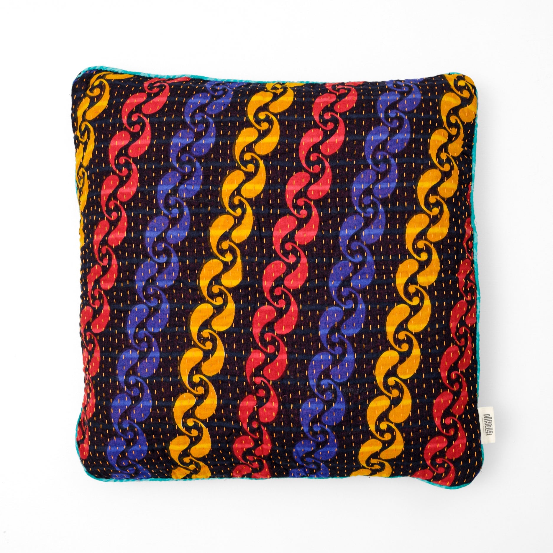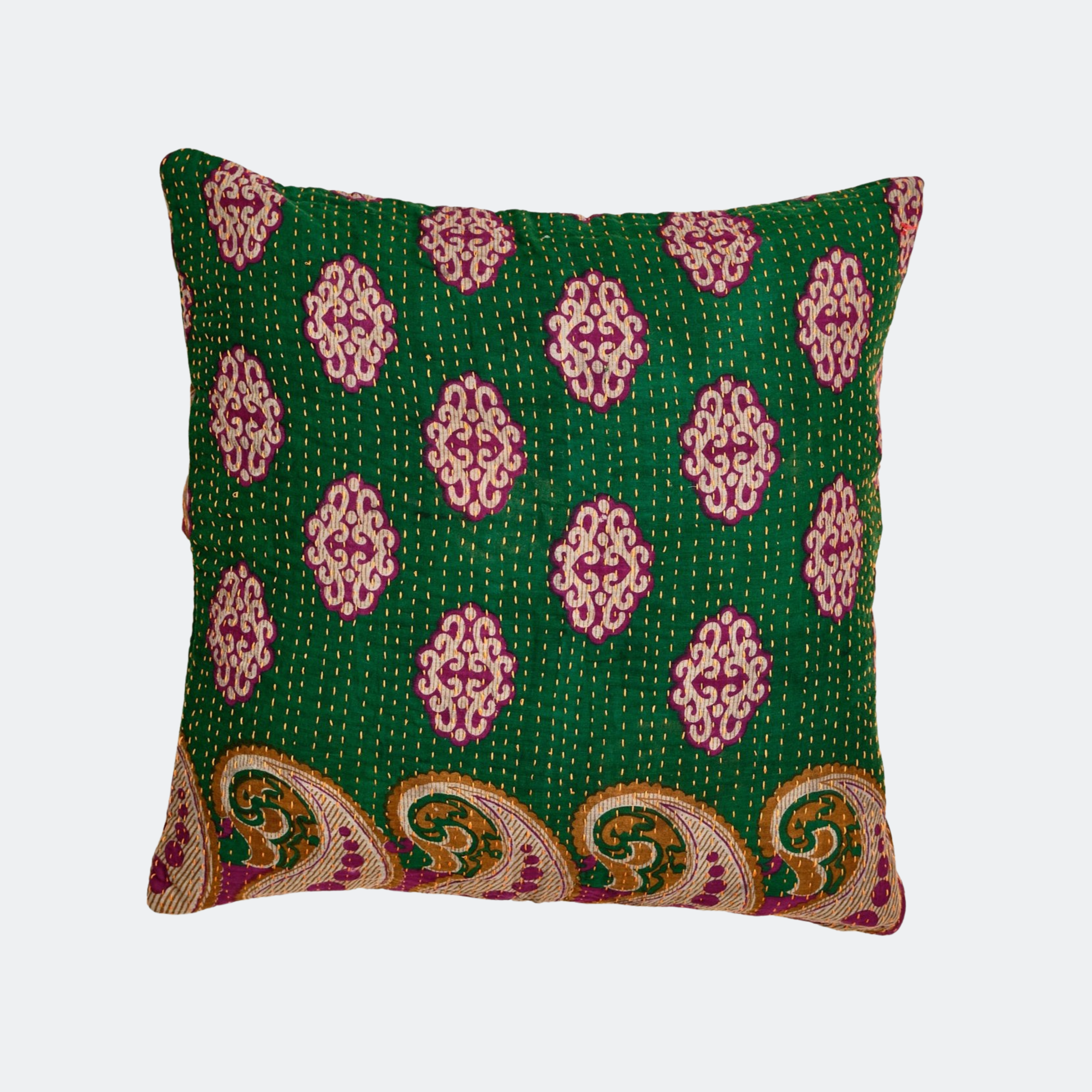 De mange smukke røde puder er syet med fire lag vintage sarier. De findes i bomuld og silke og er lavet i størrelserne: 30x50 cm, 40x60 cm, 40x40 cm, 50x50 cm og 60x60 cm.