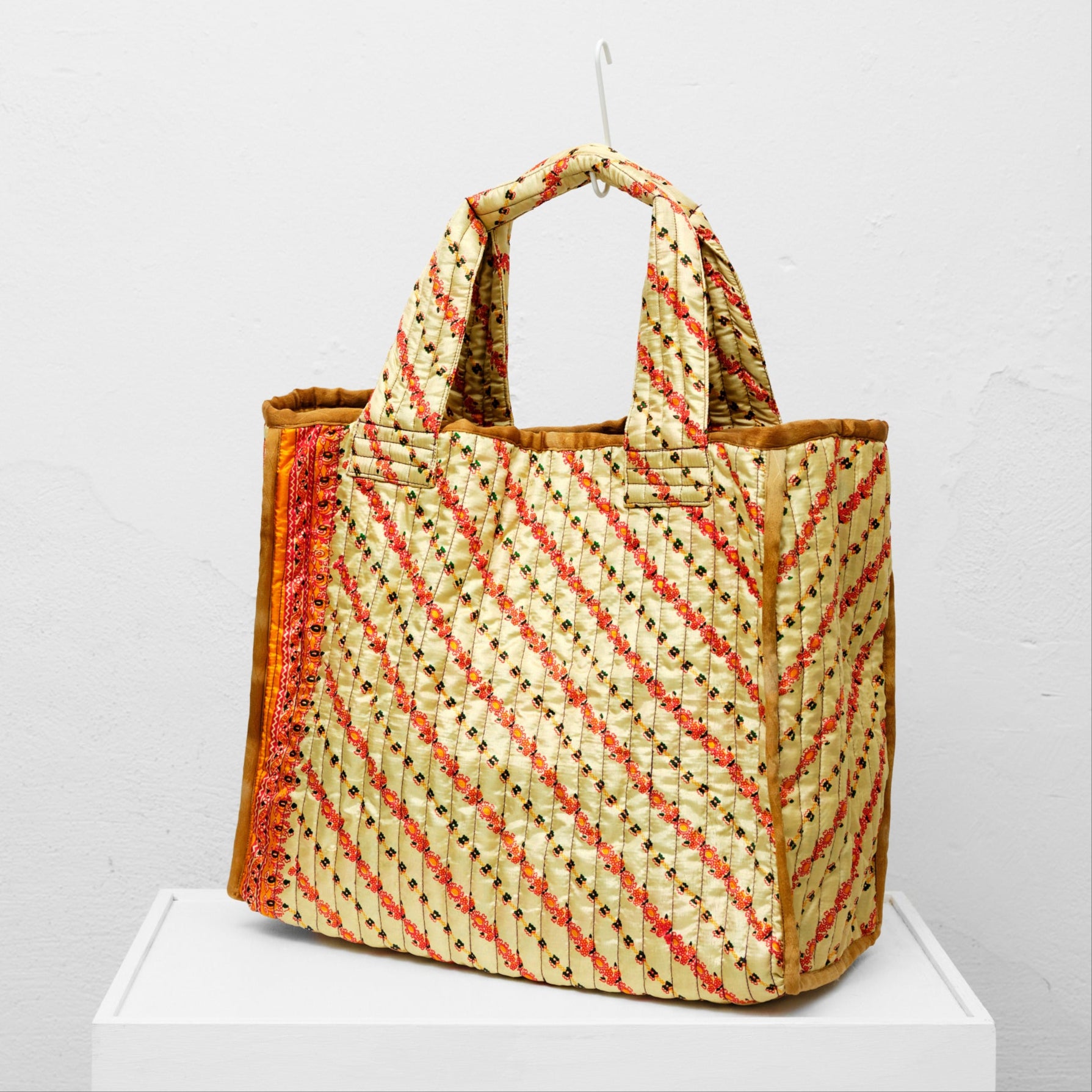 Sari-weekendtasken er vatteret med tre lag vintage silke- eller bomuldssarier. De er lavet med mønster både indeni og udenpå.