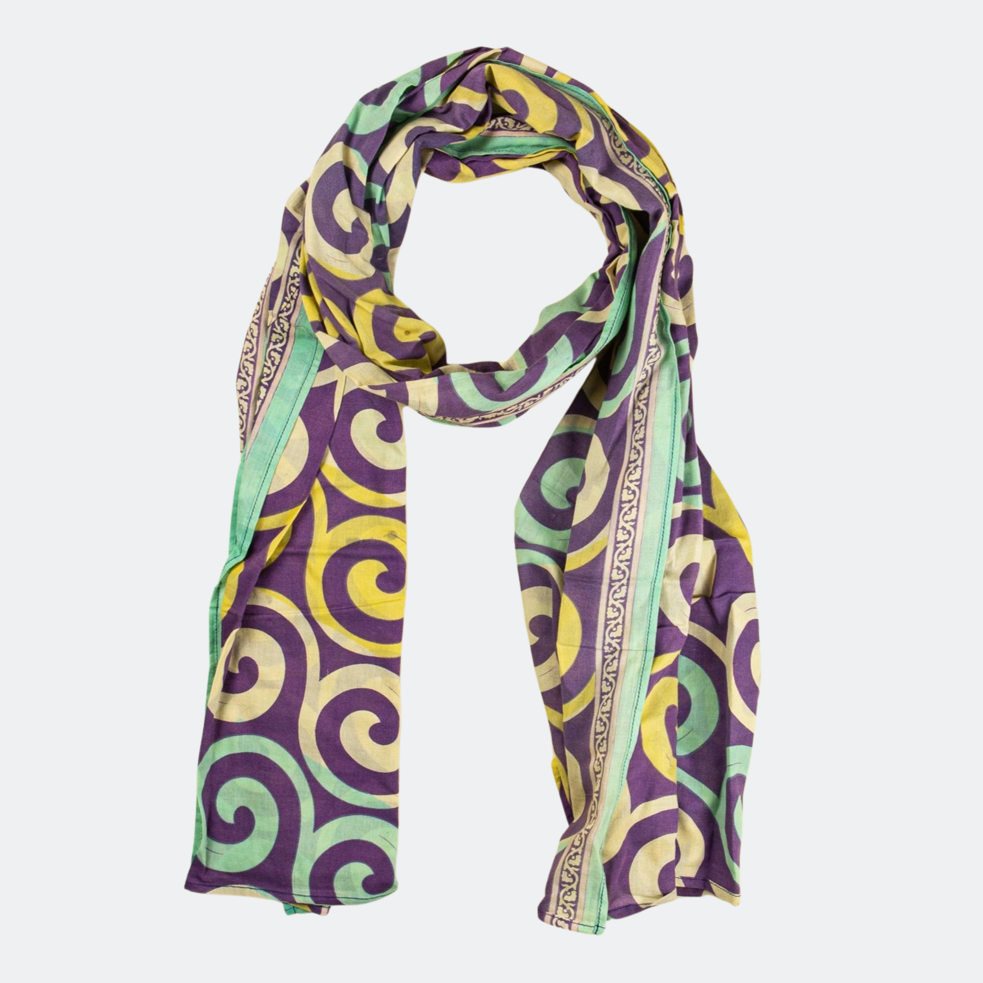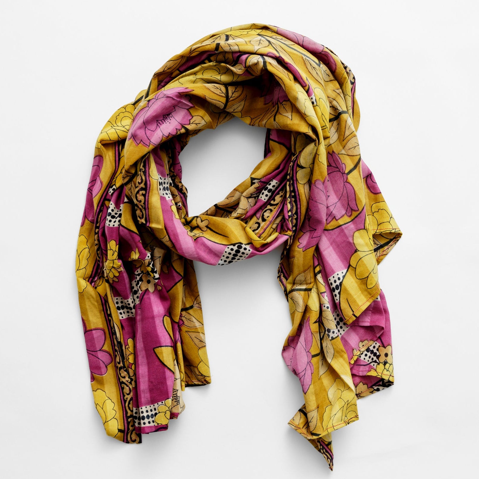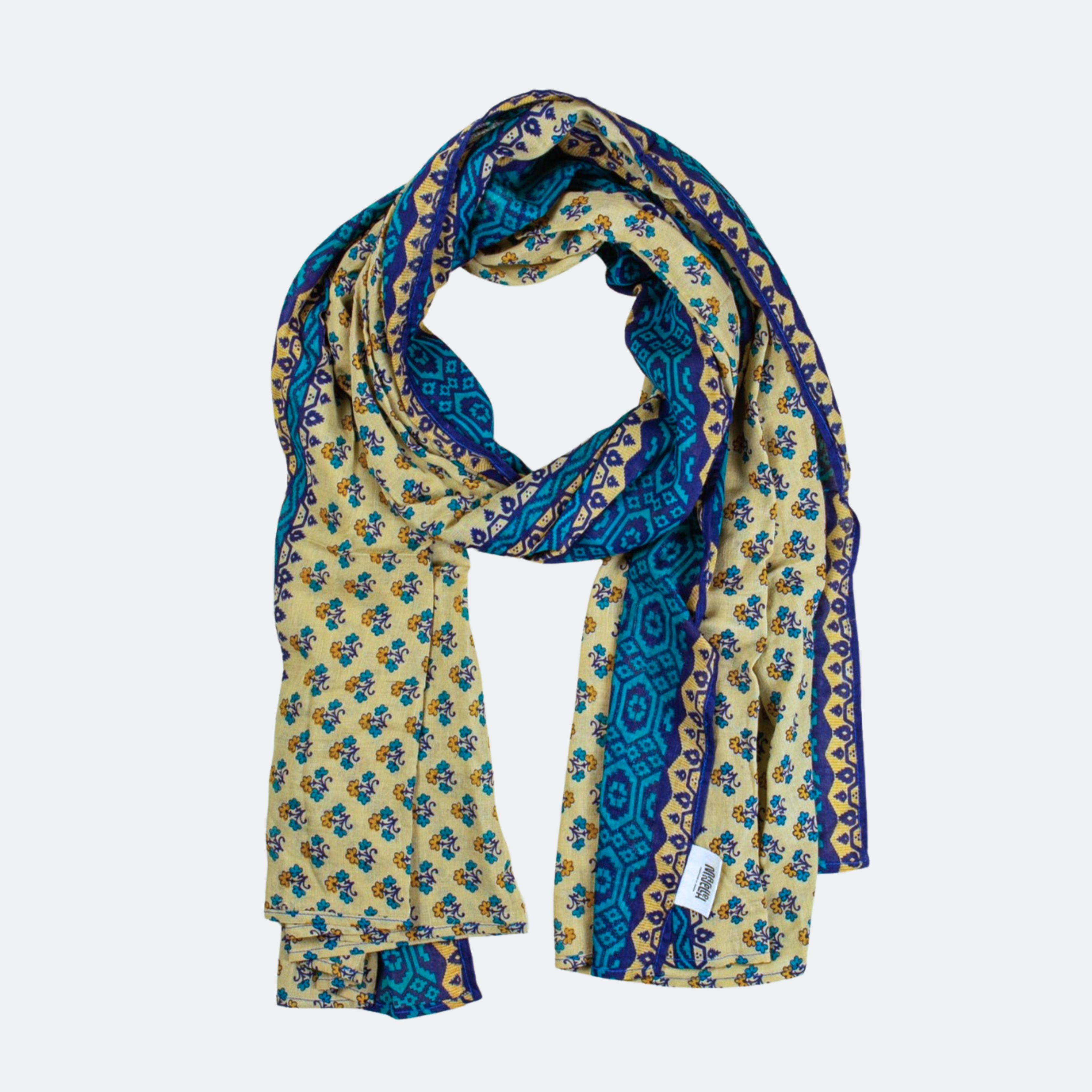 Tørklæderne er syet af vintage sarier. De findes i bomuld og silke i forskellige størrelser.