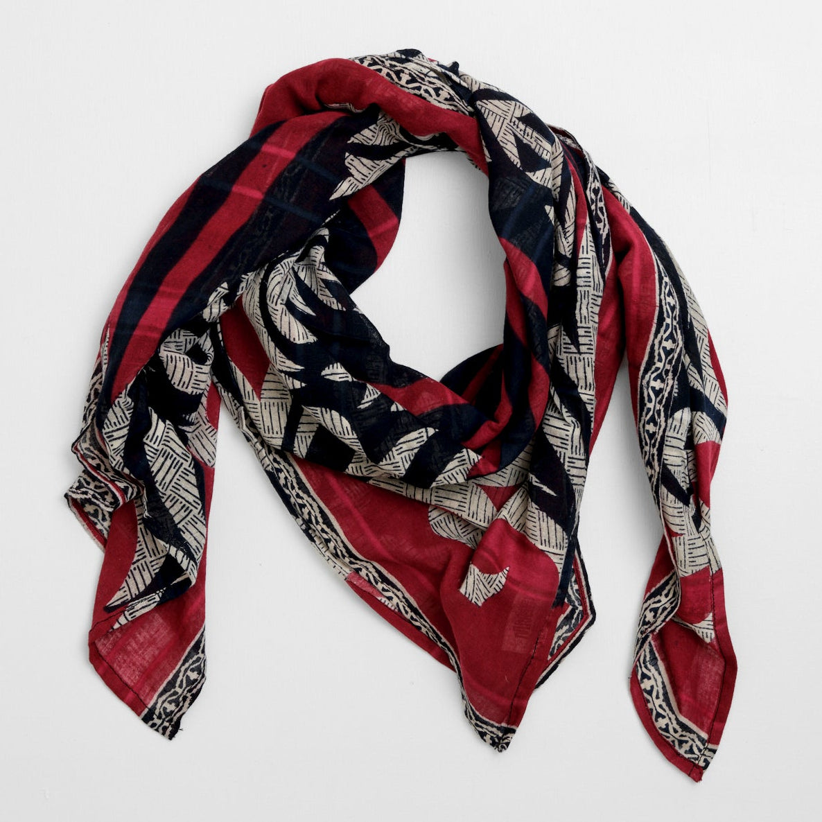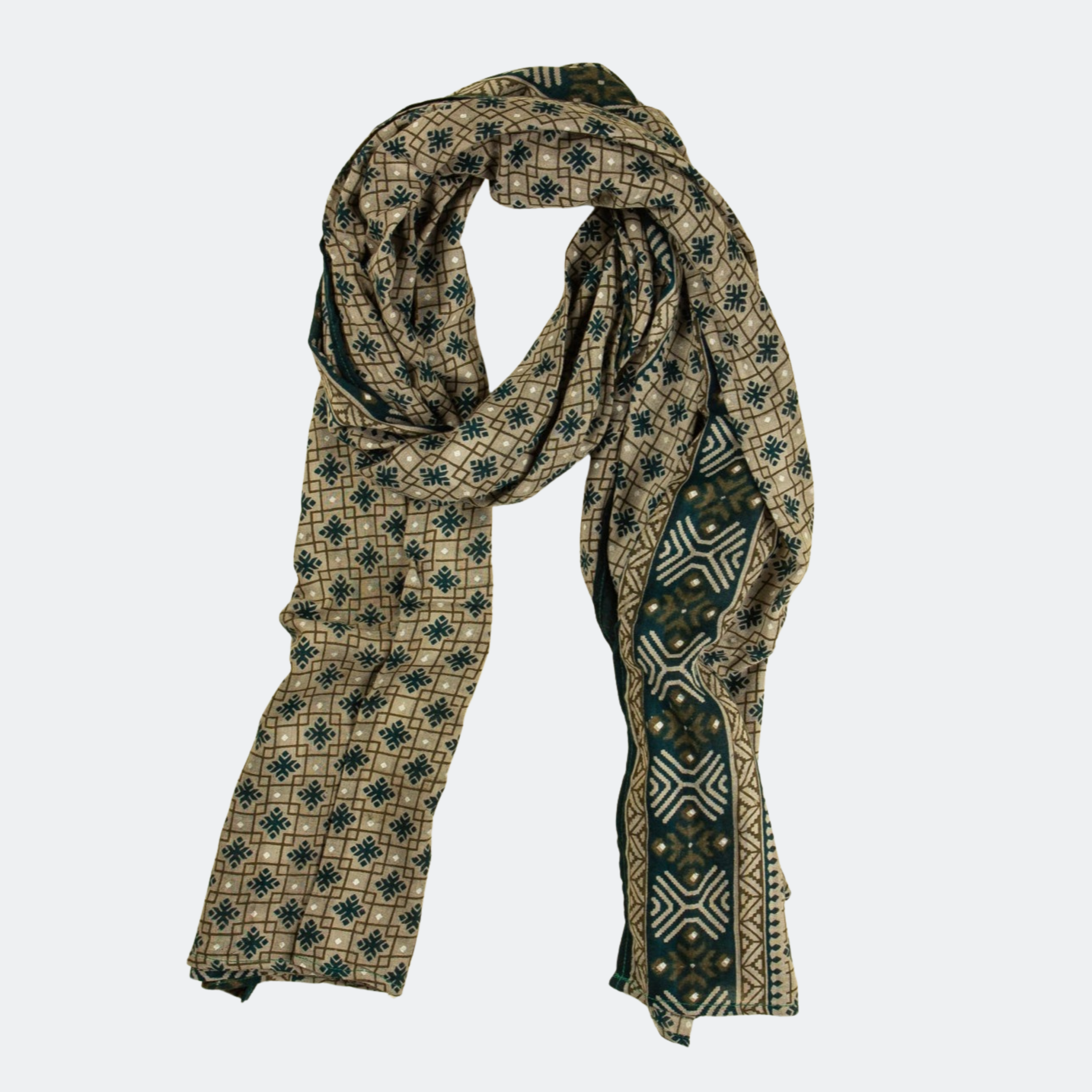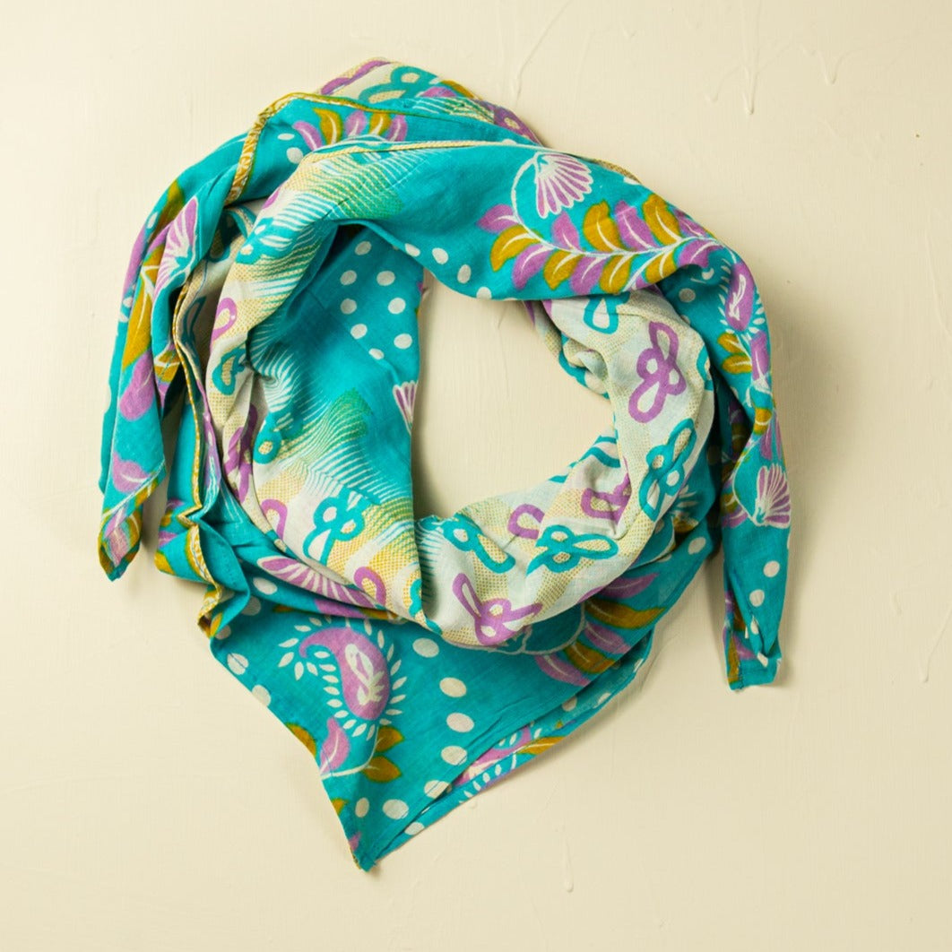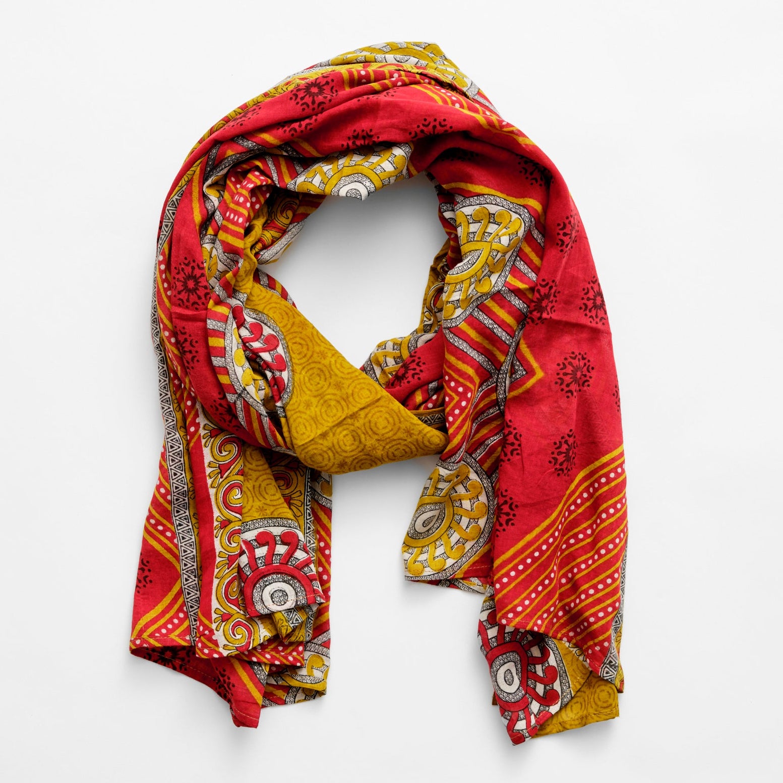 Tørklæderne er syet af vintage sarier. De findes i bomuld og silke i forskellige størrelser.
