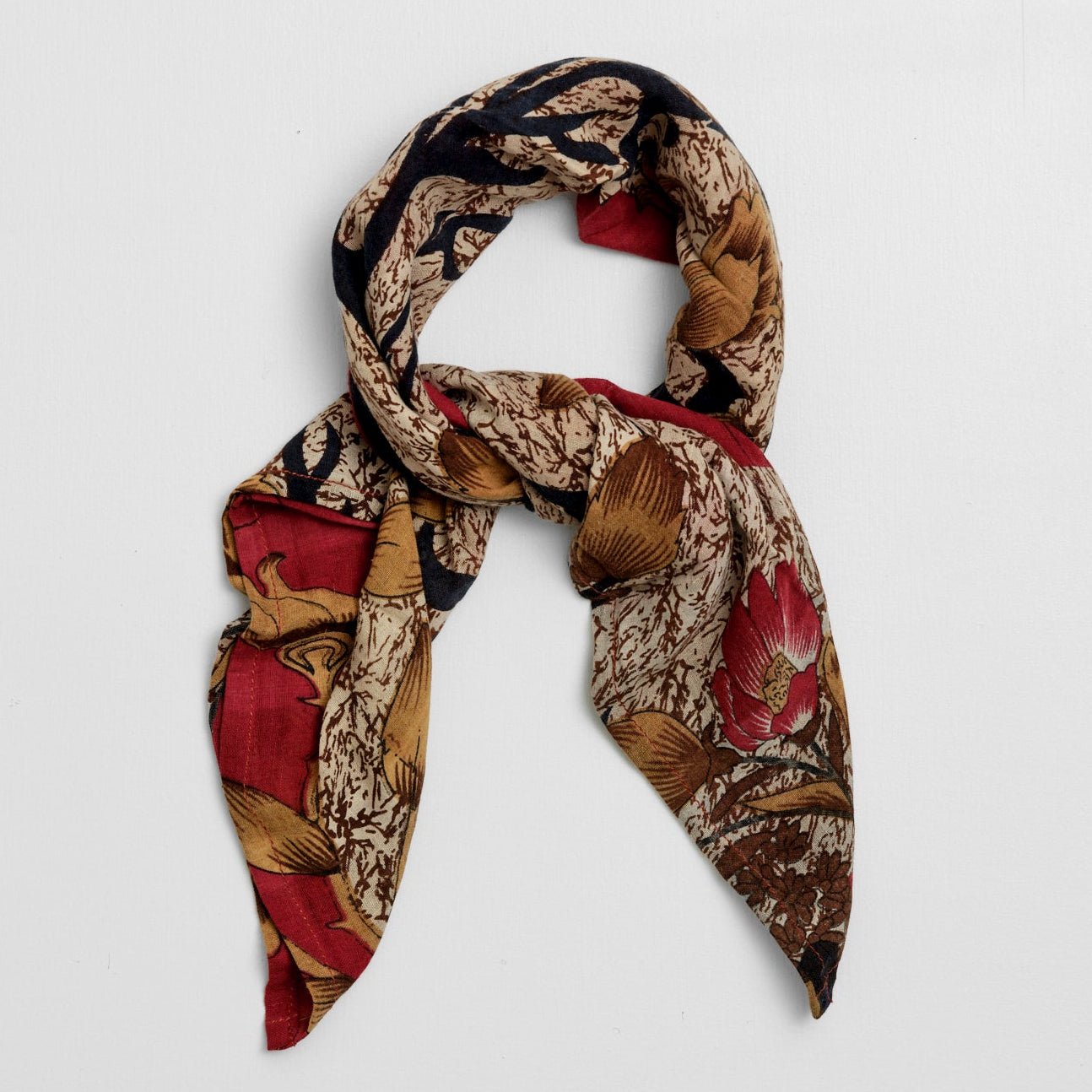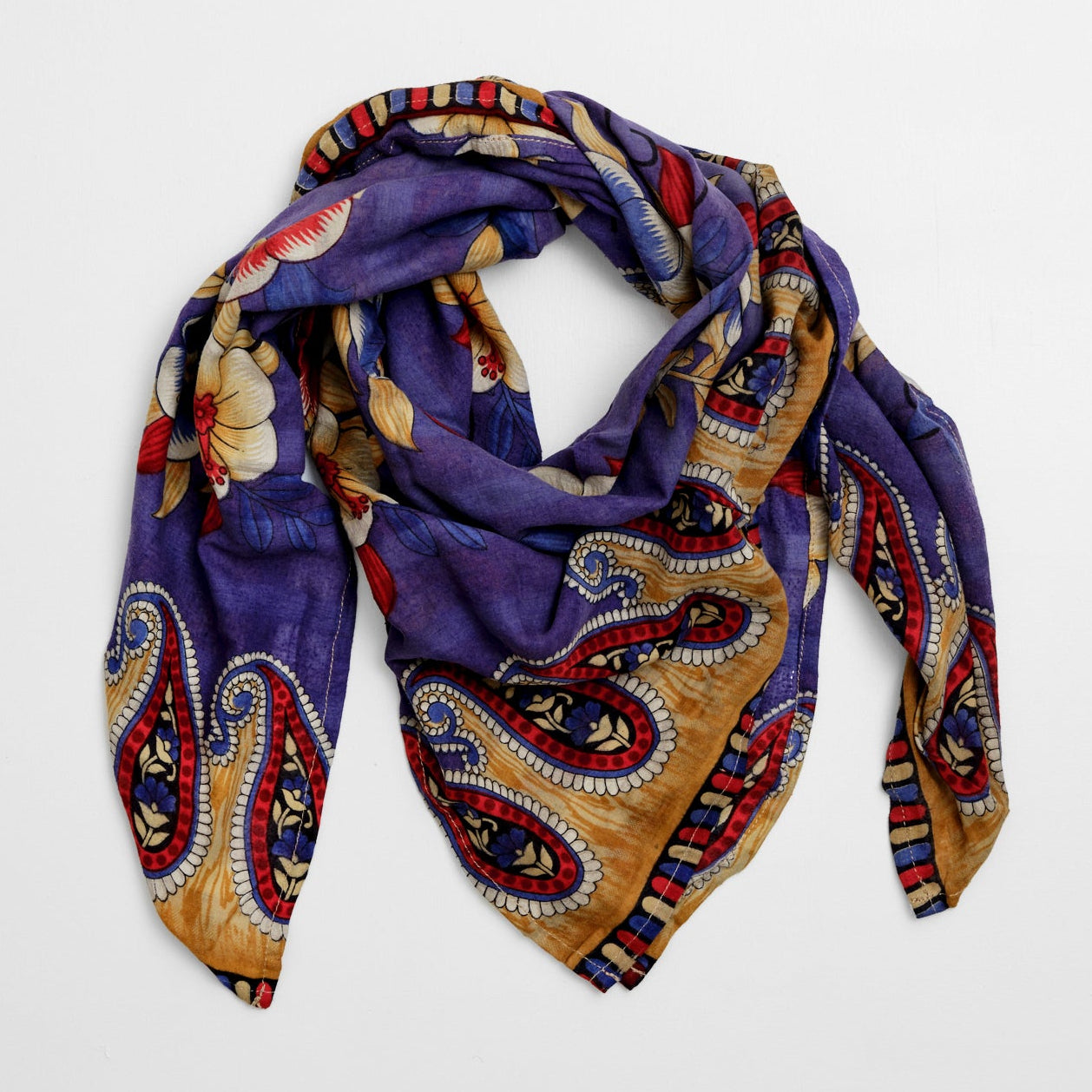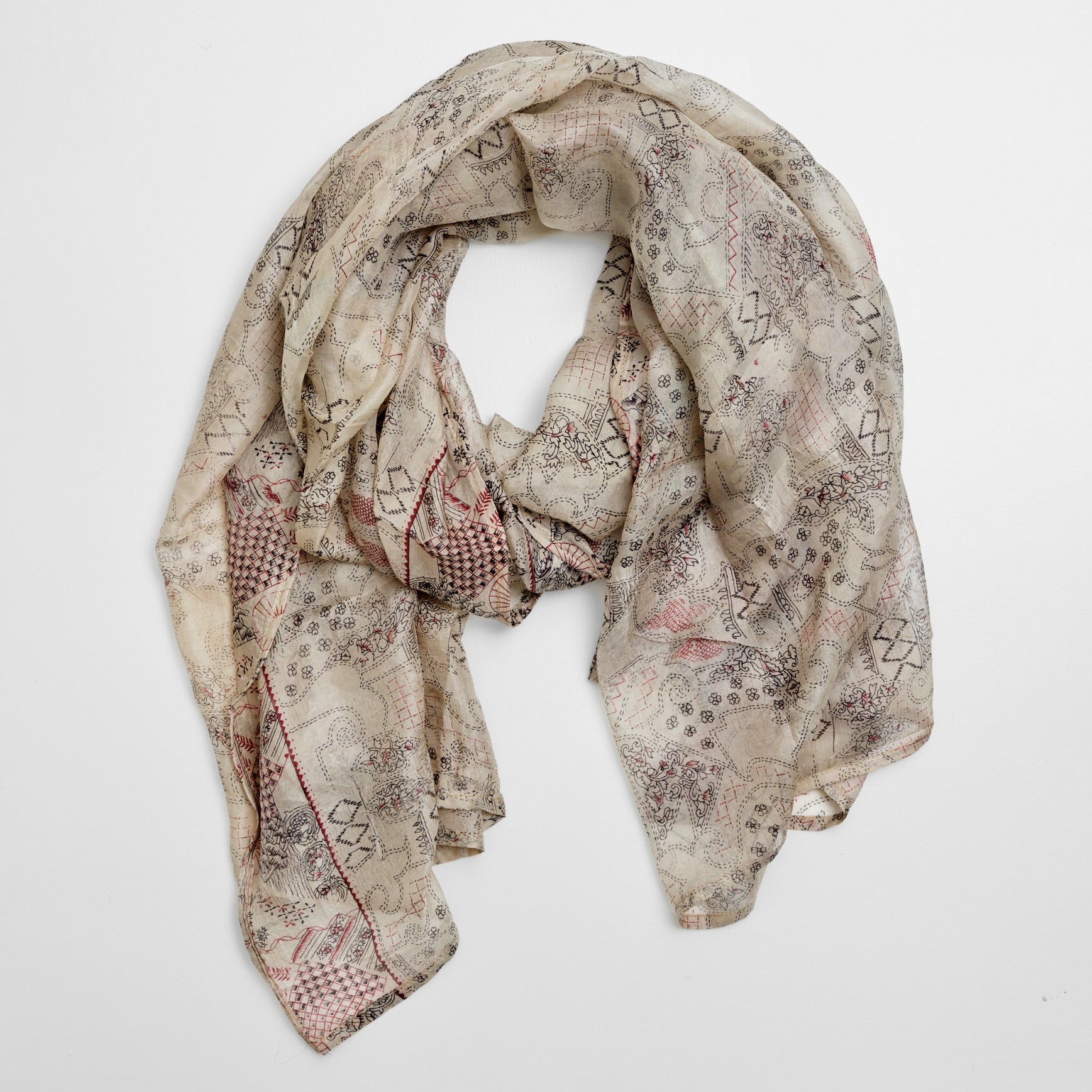 De smukke tørklæder er syet af vintage sarier, nøje udvalgt, istandsat og syet. De findes i bomuld og silke i forskellige størrelser.