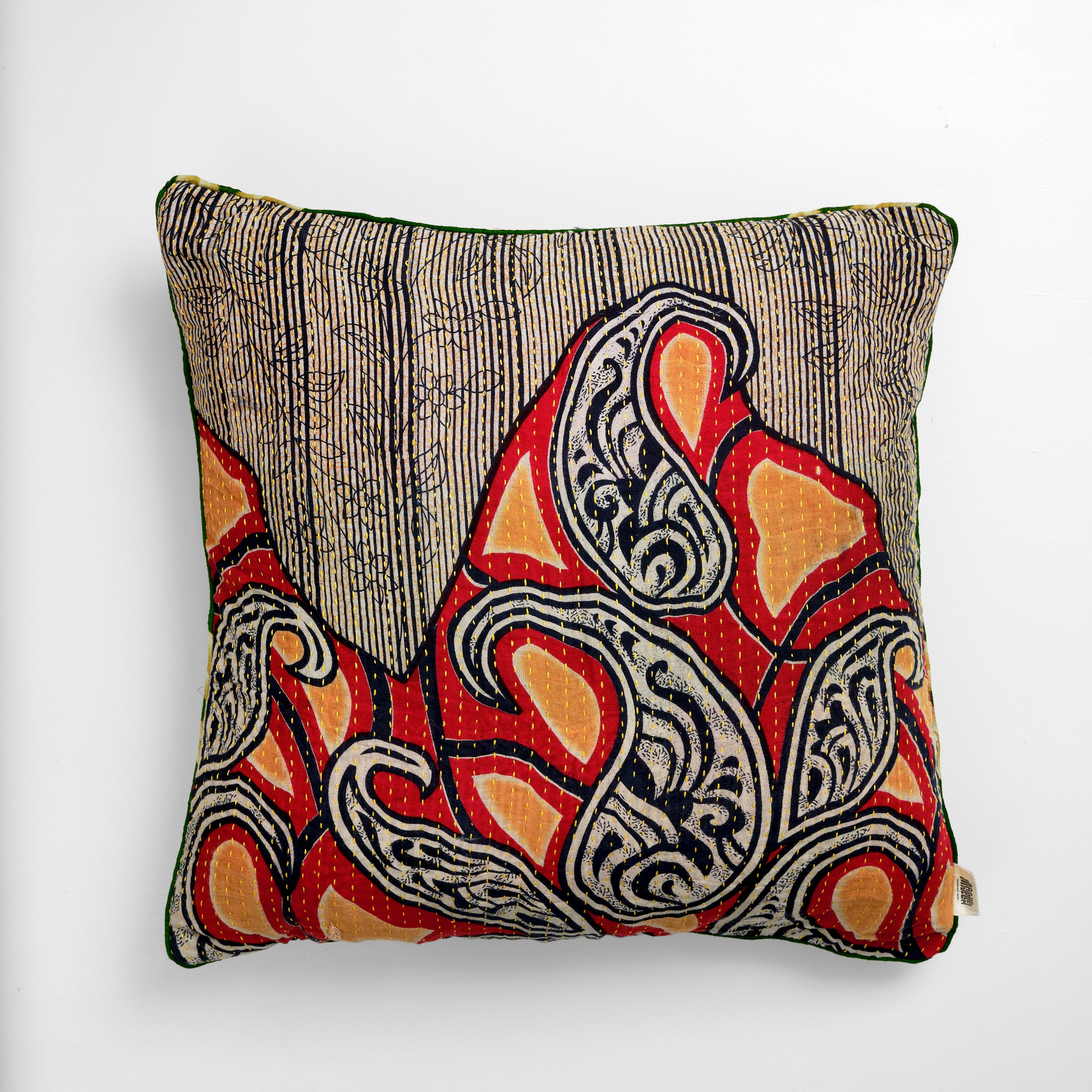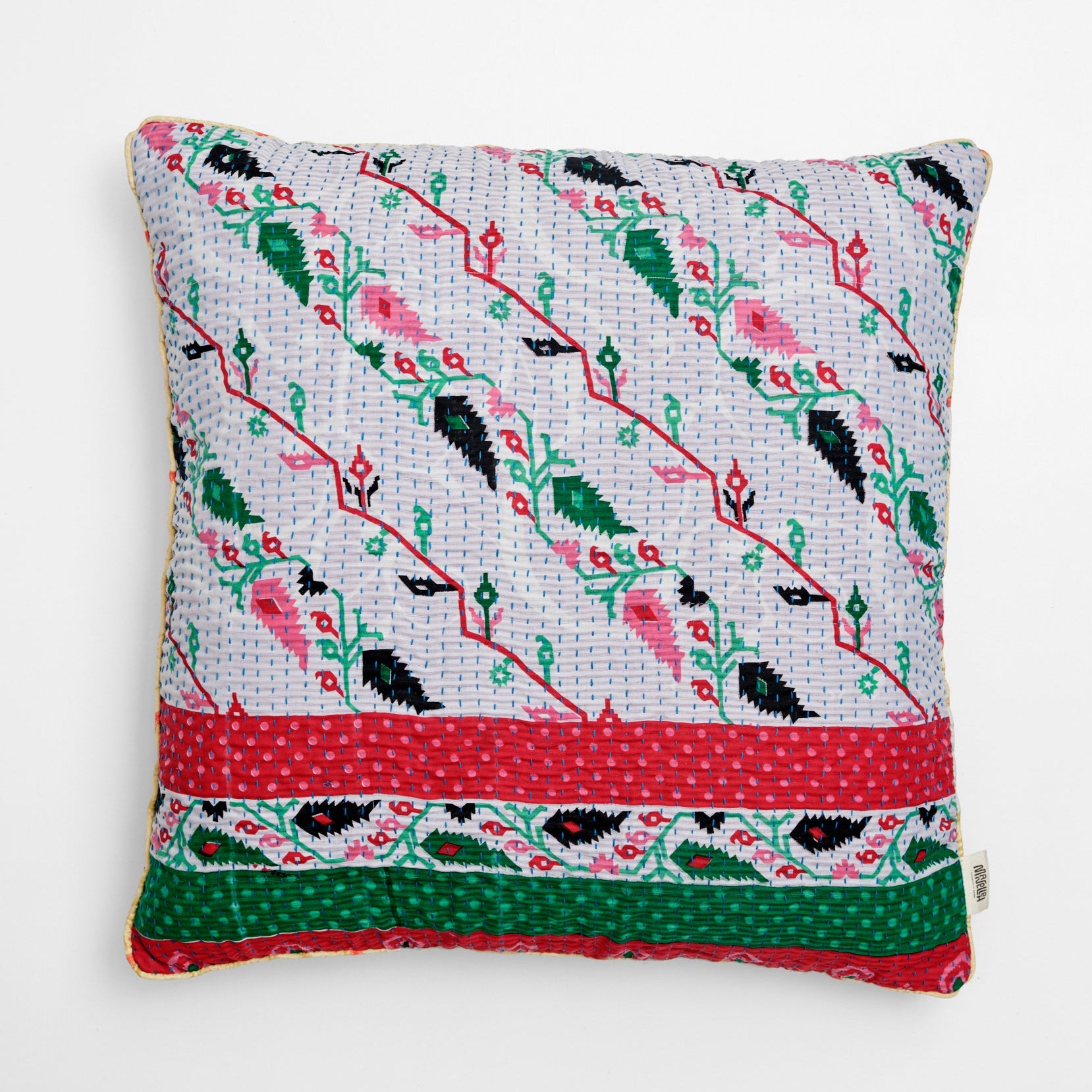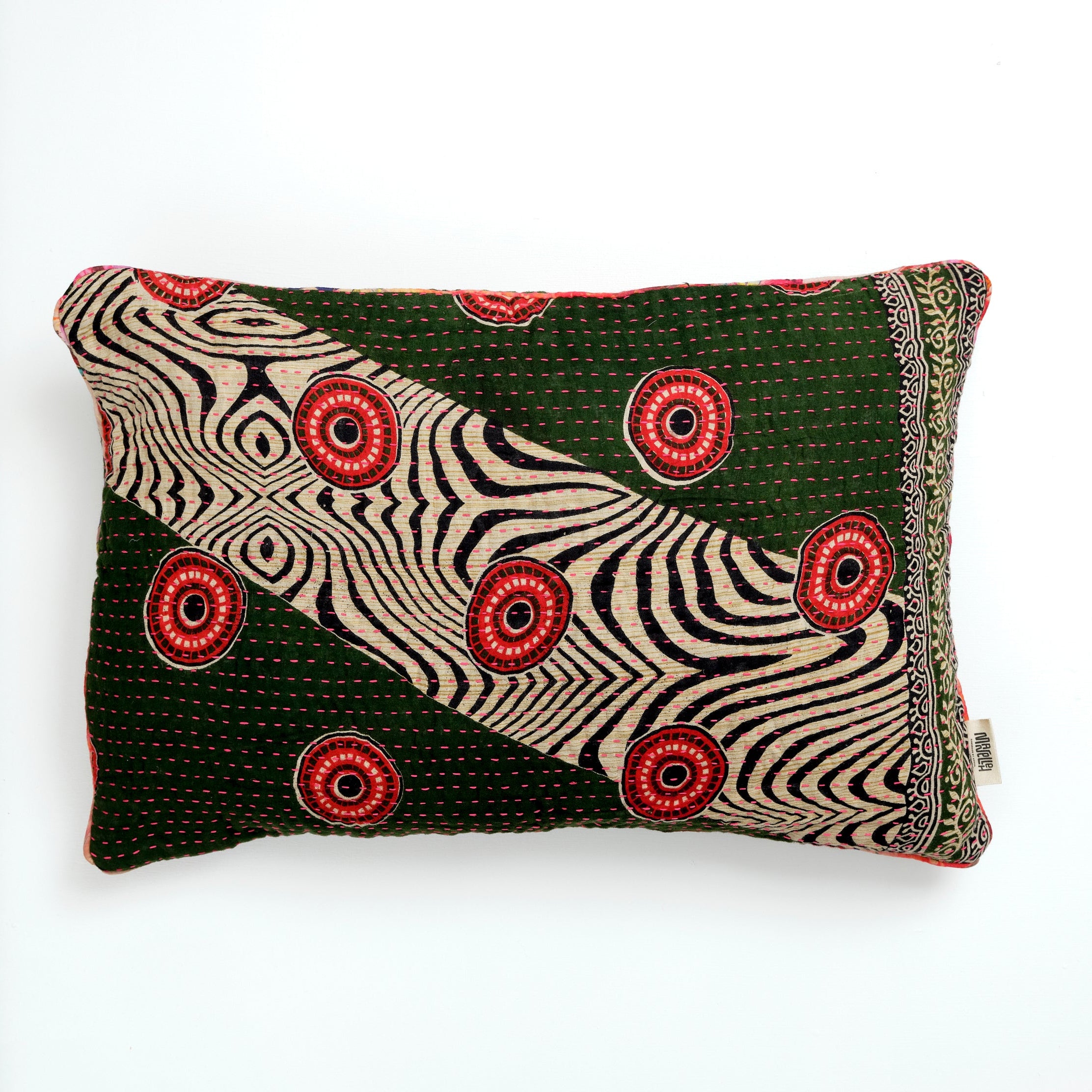 De mange smukke unika puder er syet med fire lag vintage sarier. De findes i bomuld og silke og er lavet i størrelserne: 30x50 cm, 40x60 cm, 40x40 cm, 50x50 cm og 60x60 cm.