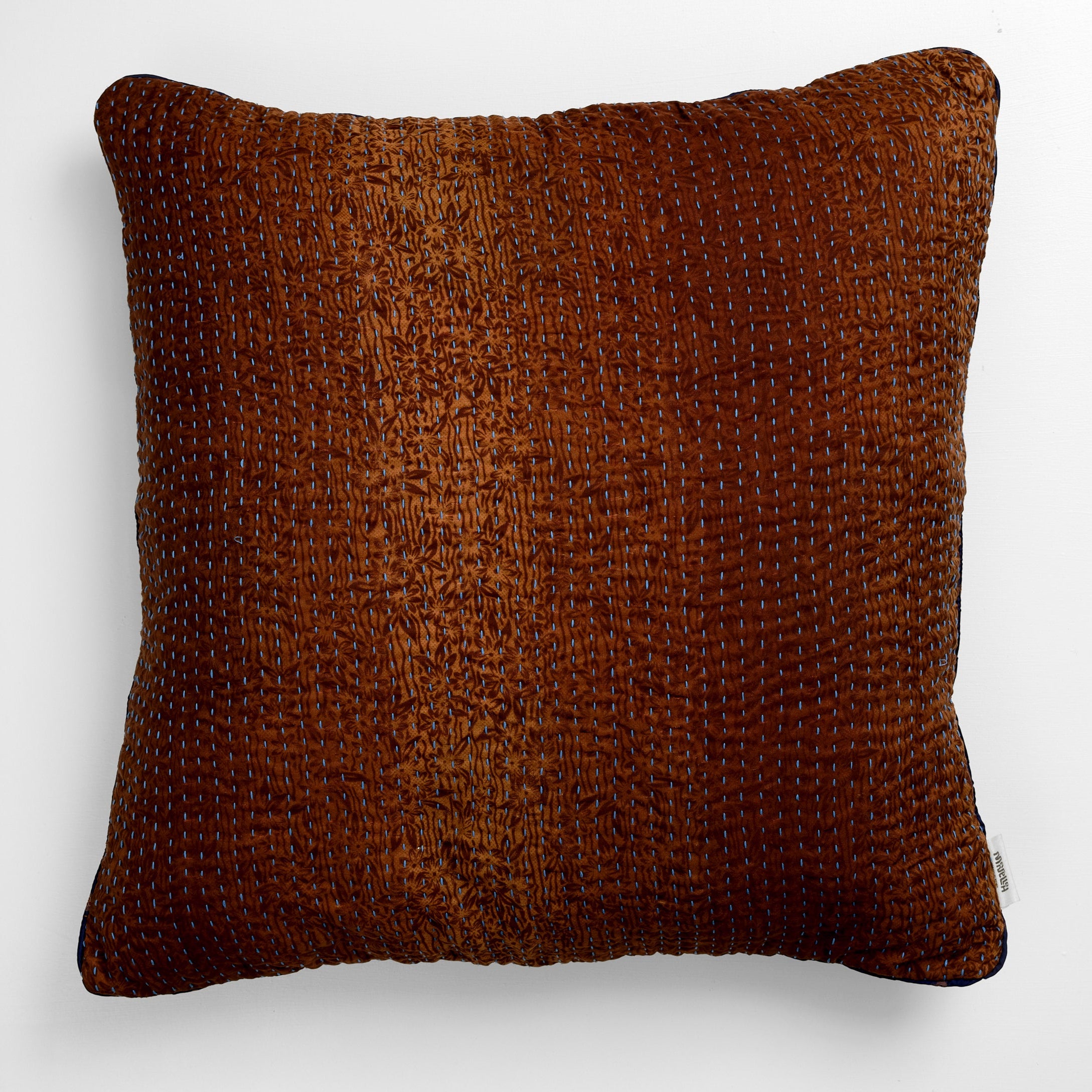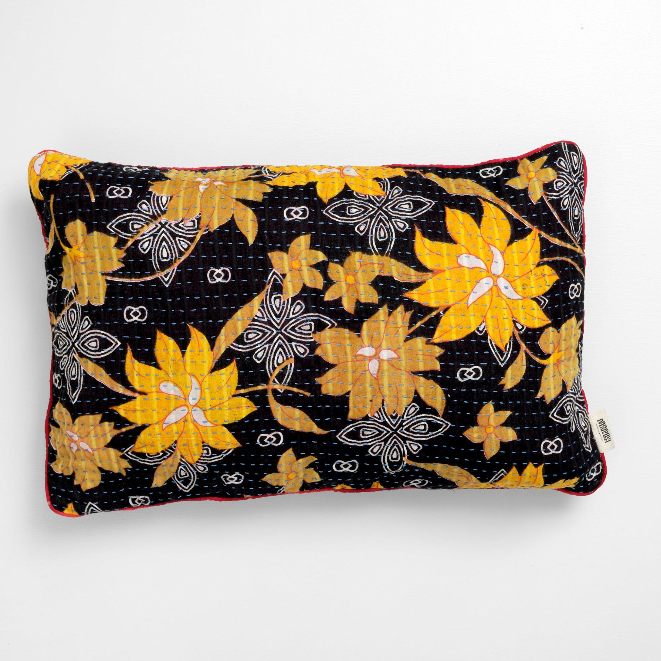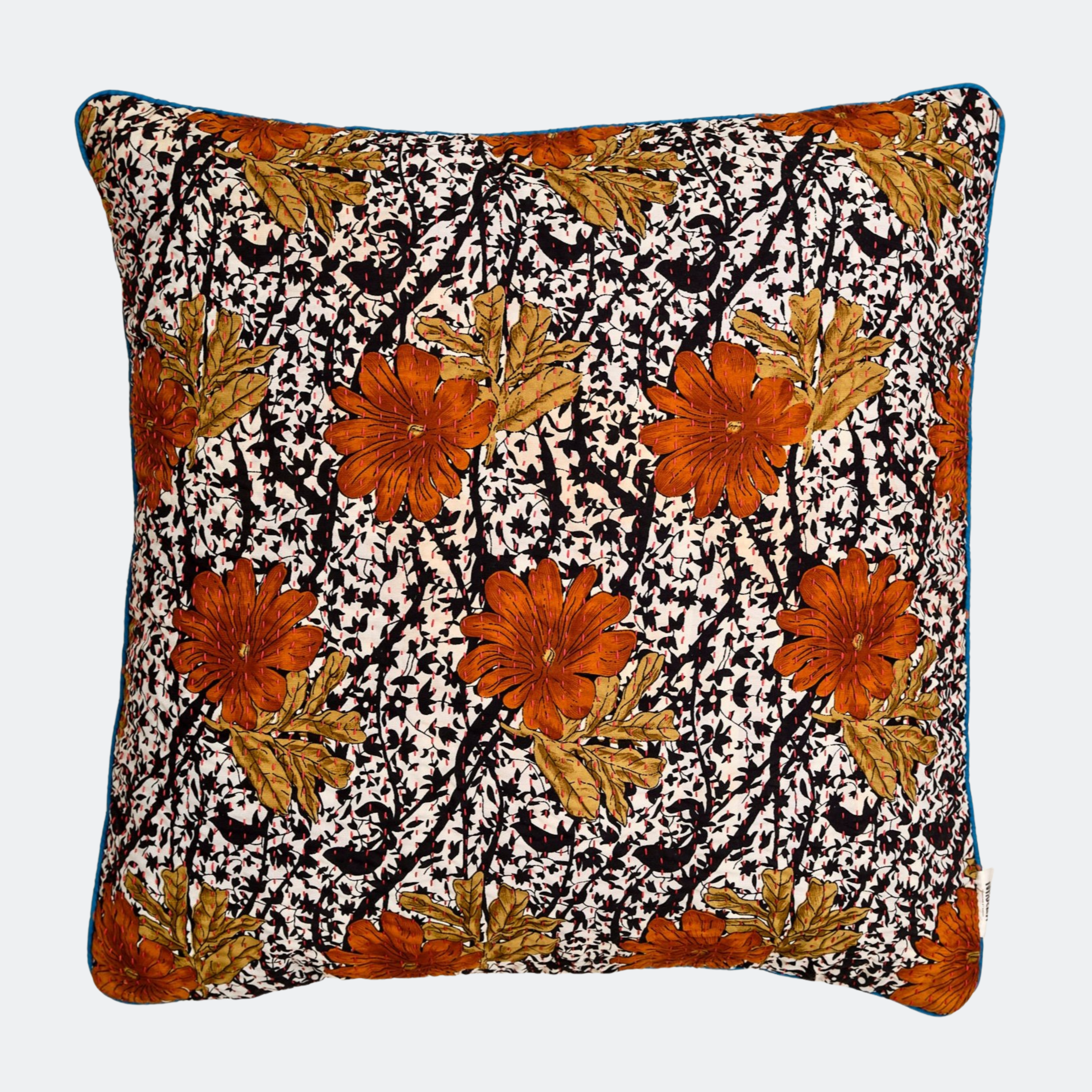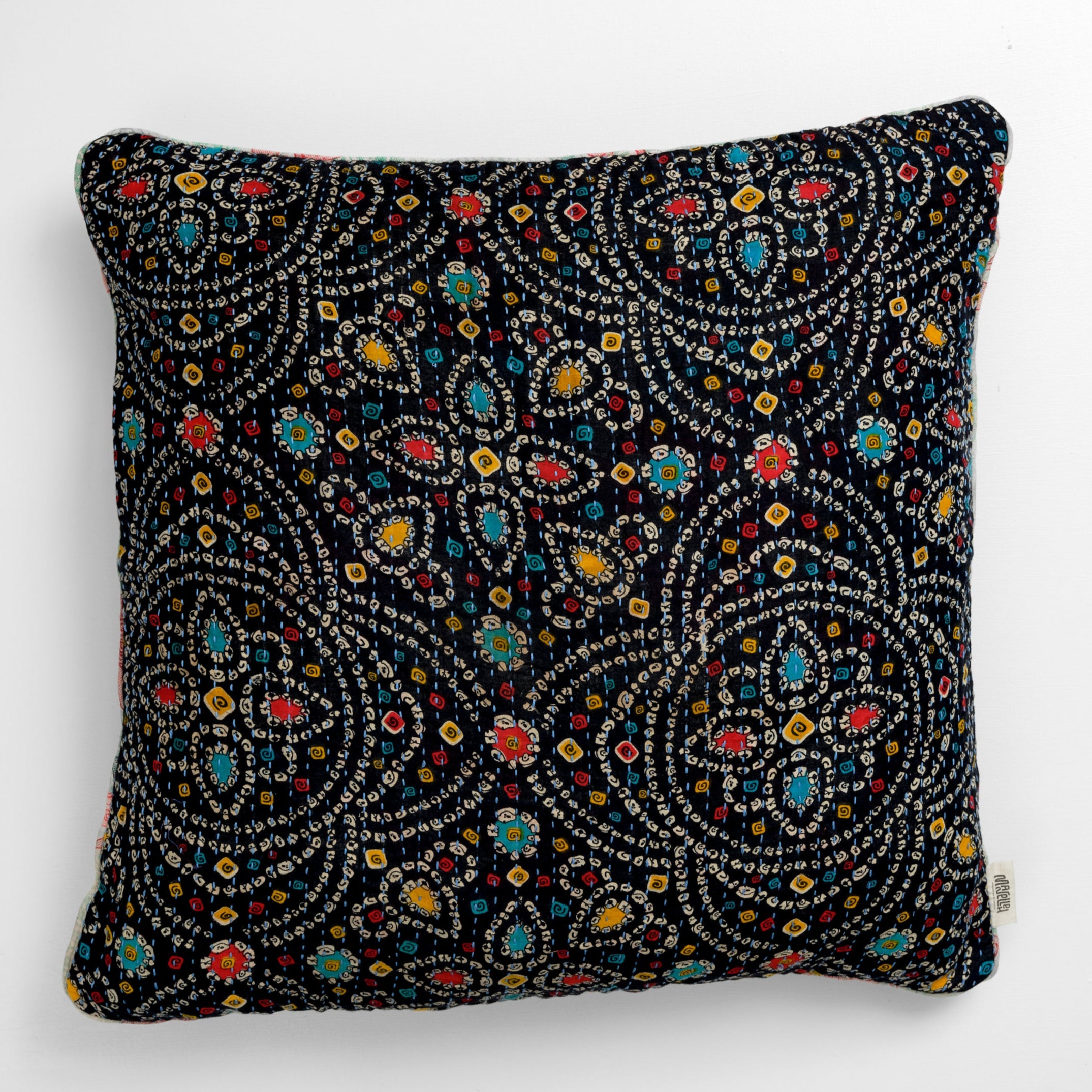 De mange smukke unika puder er syet med fire lag vintage sarier. De findes i bomuld og silke og er lavet i størrelserne: 30x50 cm, 40x60 cm, 40x40 cm, 50x50 cm og 60x60 cm.