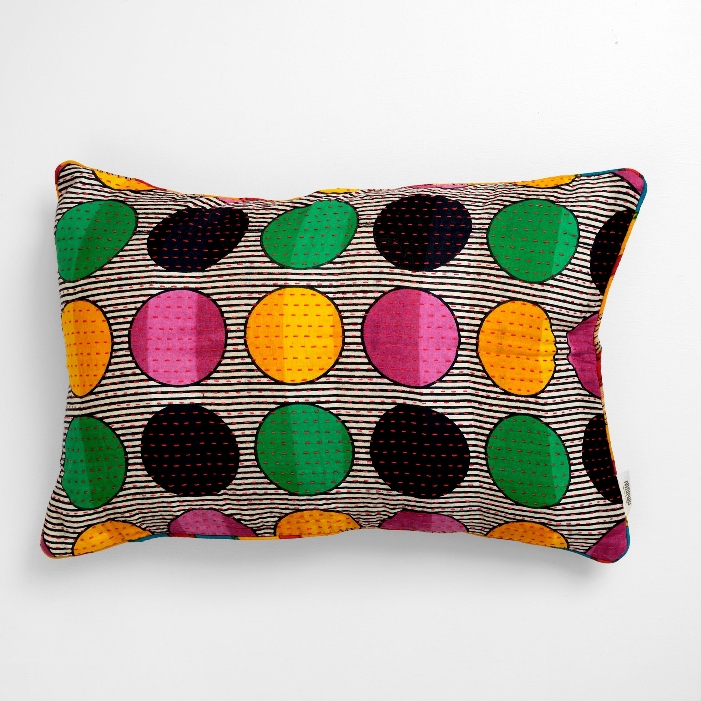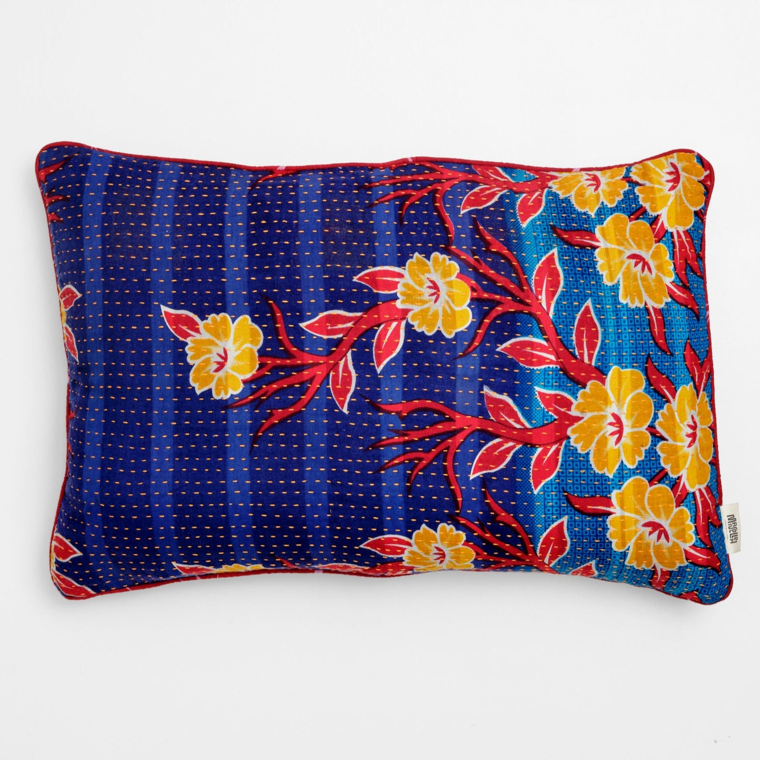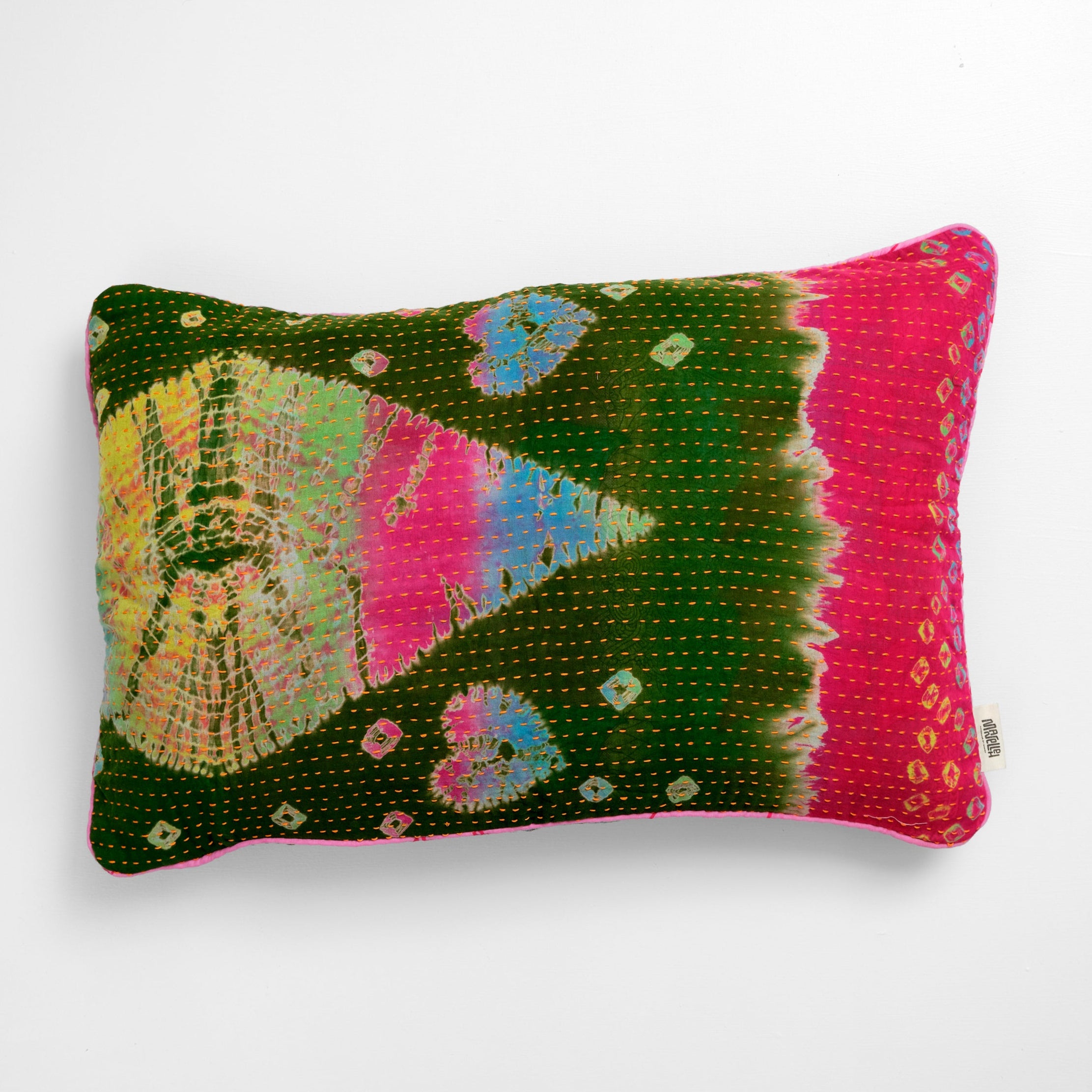 De mange smukke unika puder er syet med fire lag vintage sarier. De findes i bomuld og silke og er lavet i størrelserne: 30x50 cm, 40x60 cm, 40x40 cm, 50x50 cm og 60x60 cm.