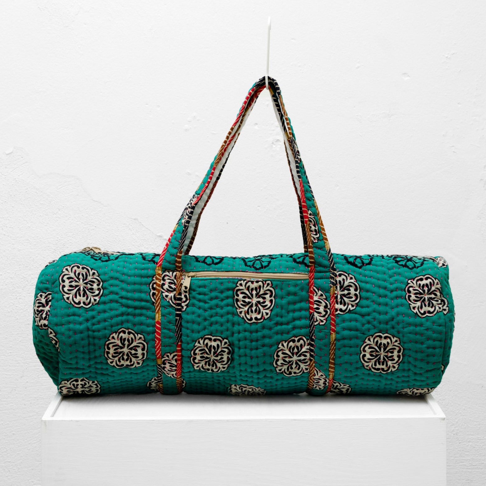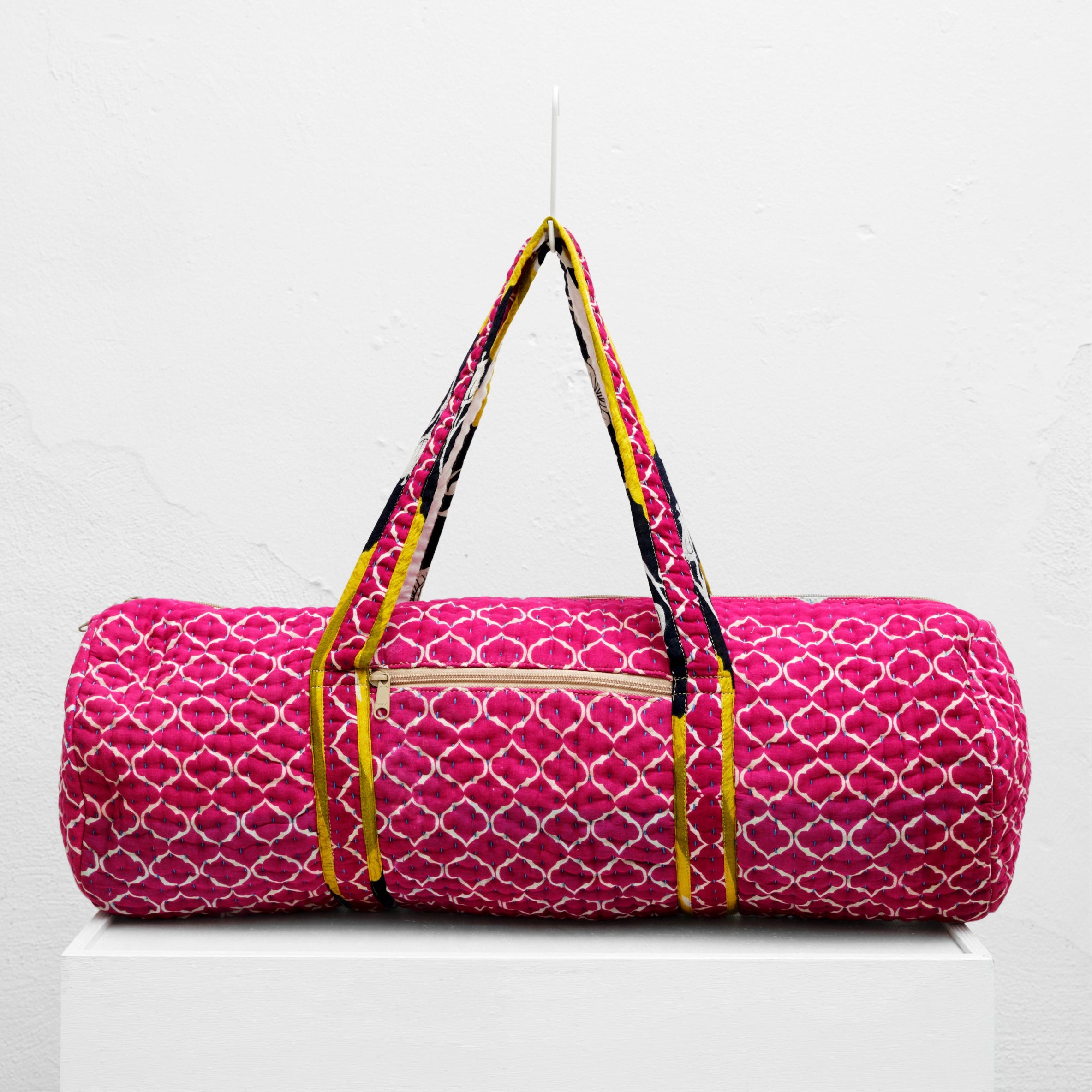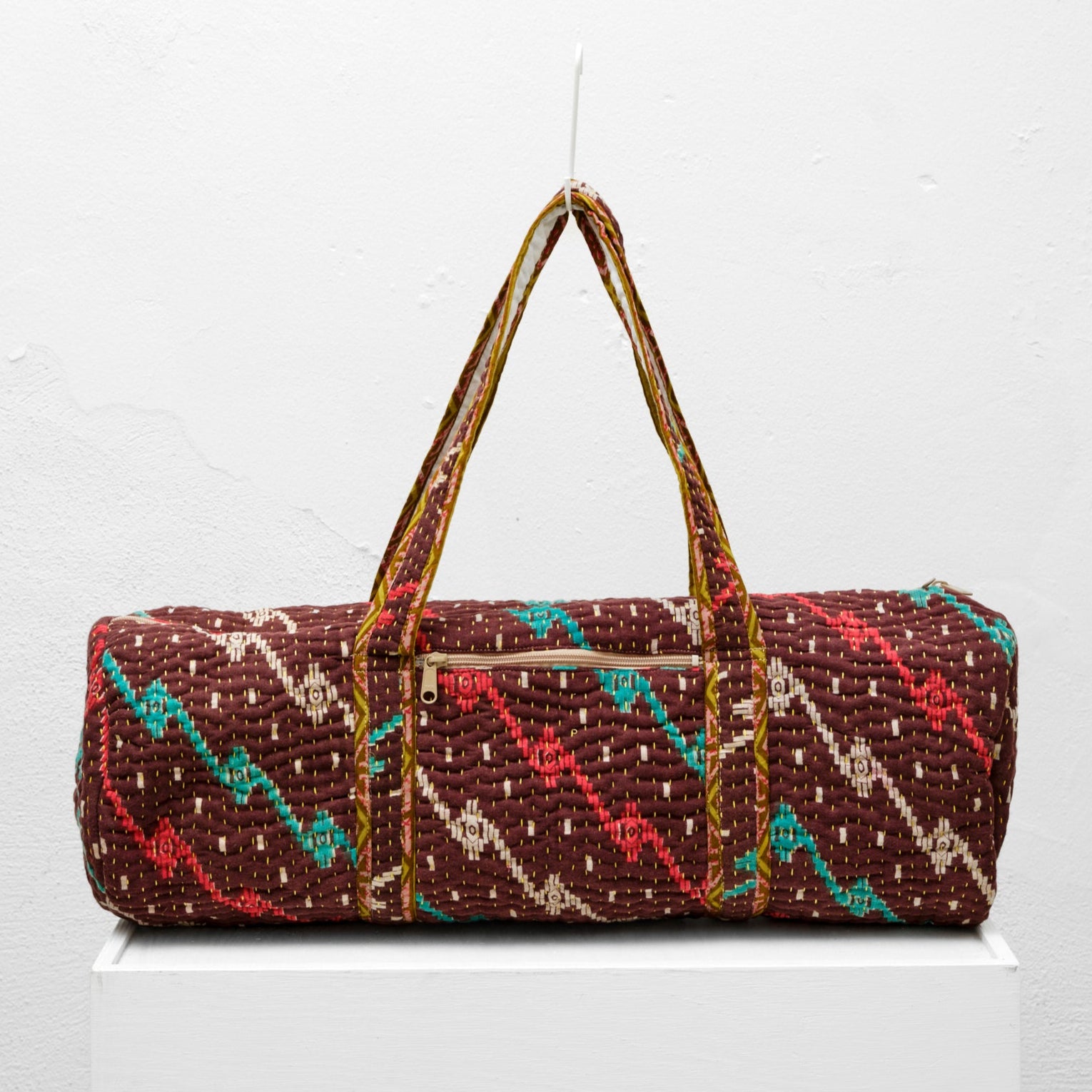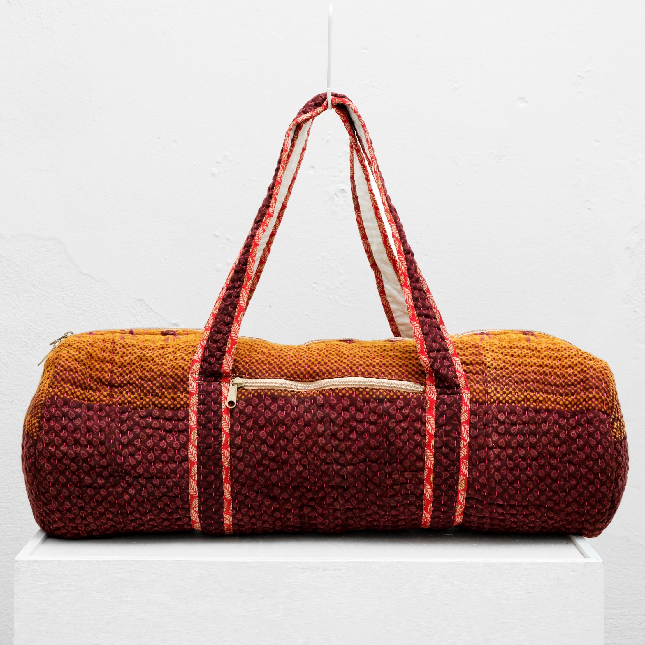 Vores yogatasker er lavet af håndvævet jutestof og kan rumme både yogamåtte og -tæppe. Den har justerbar hank og lommer ude og inde.