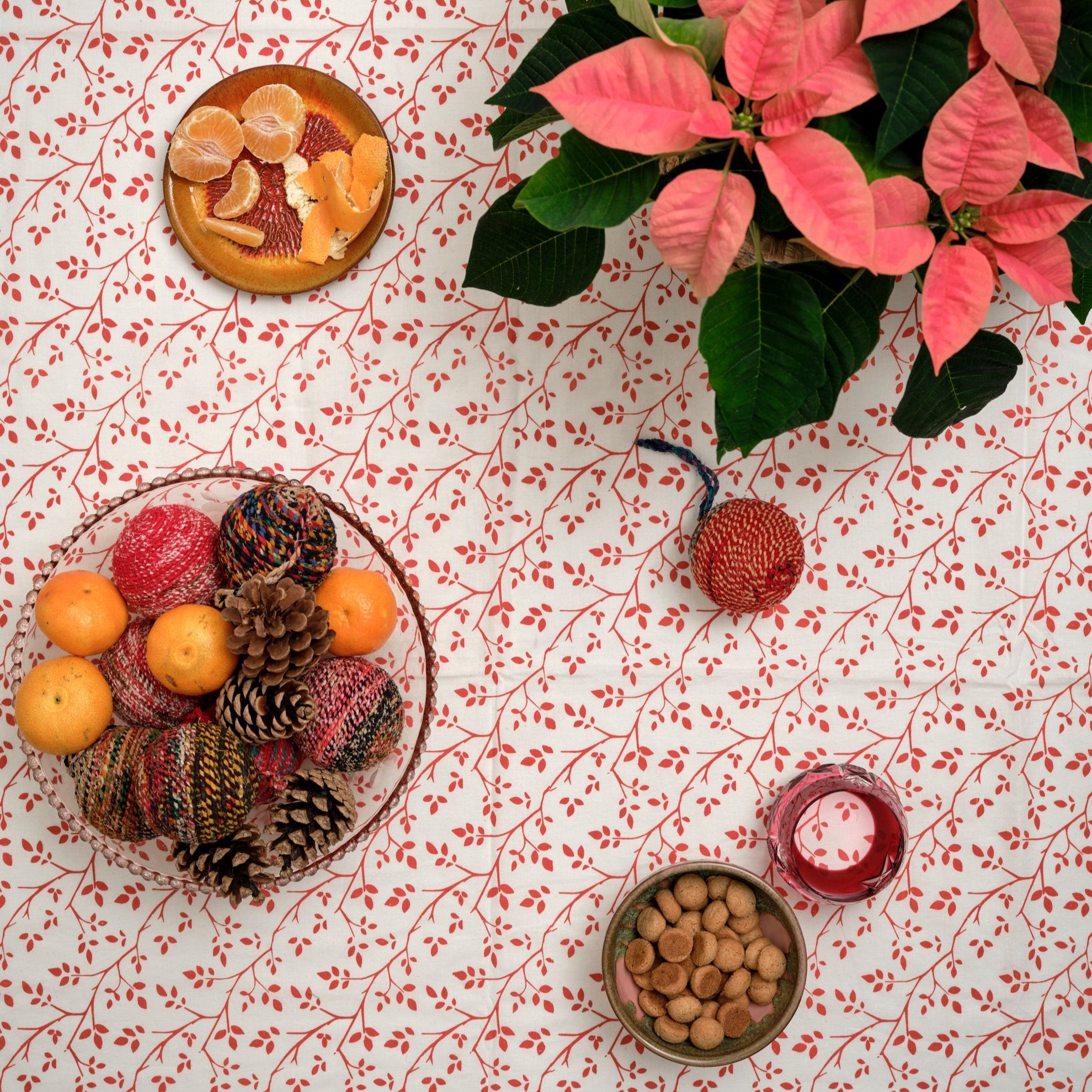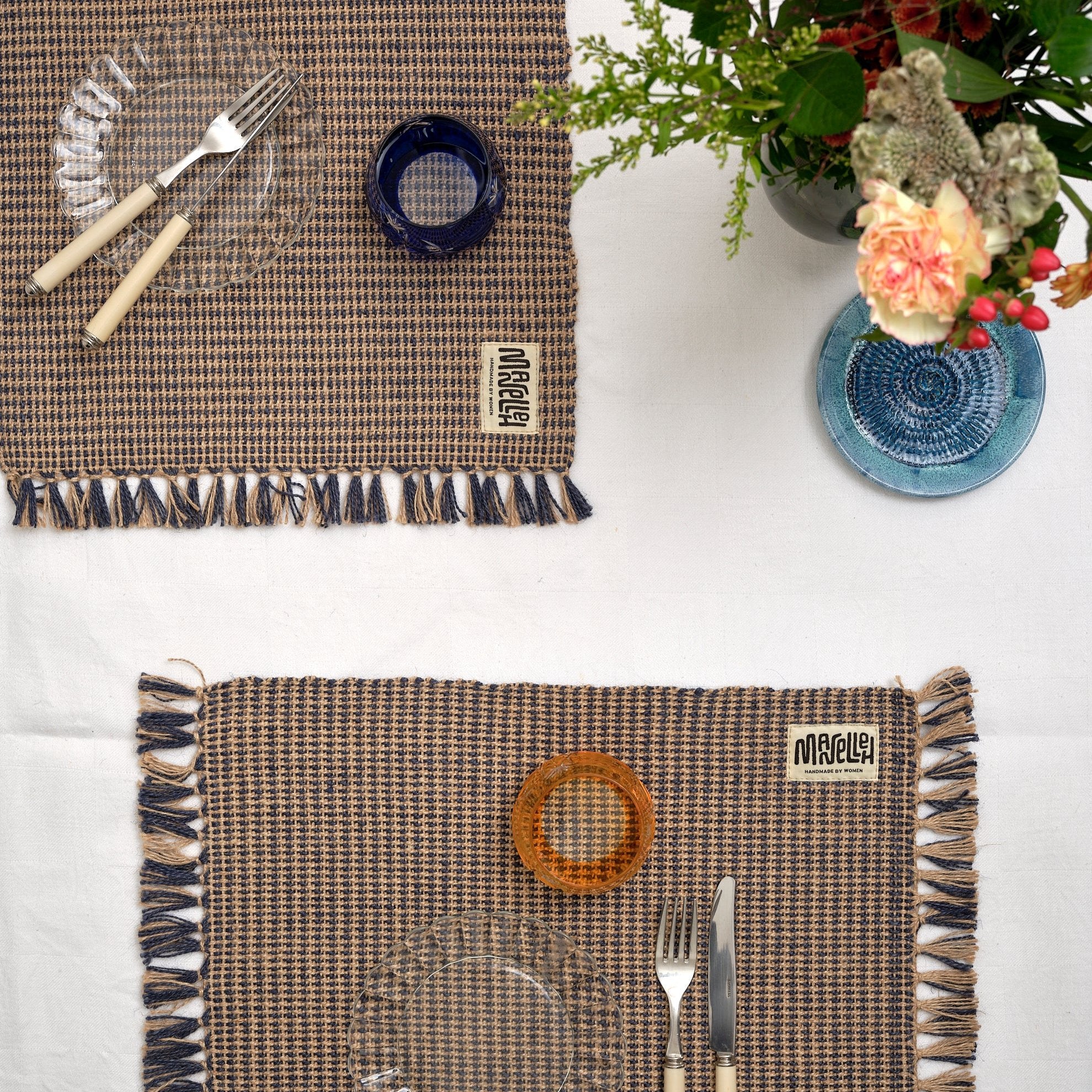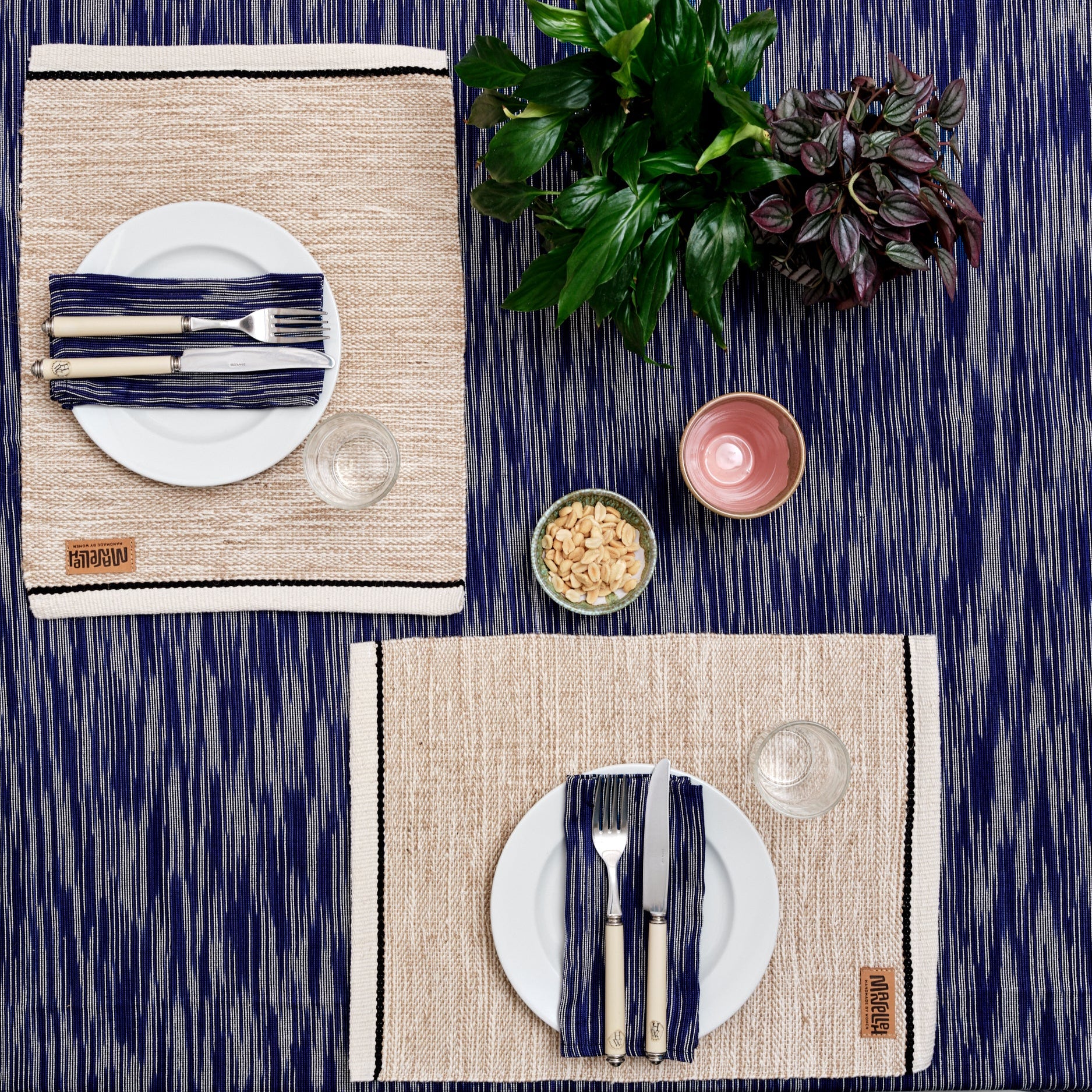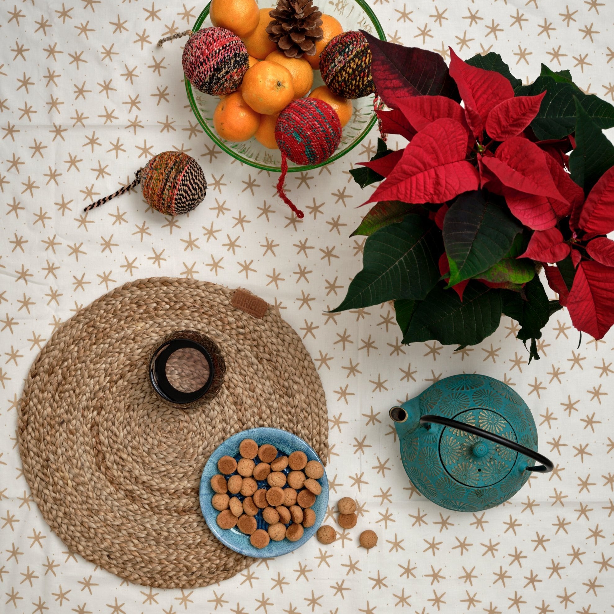 The collection includes, among other things, tablecloths and napkins in GOTS certified organic cotton, round jute placemats and tea caps made from vintage saris.