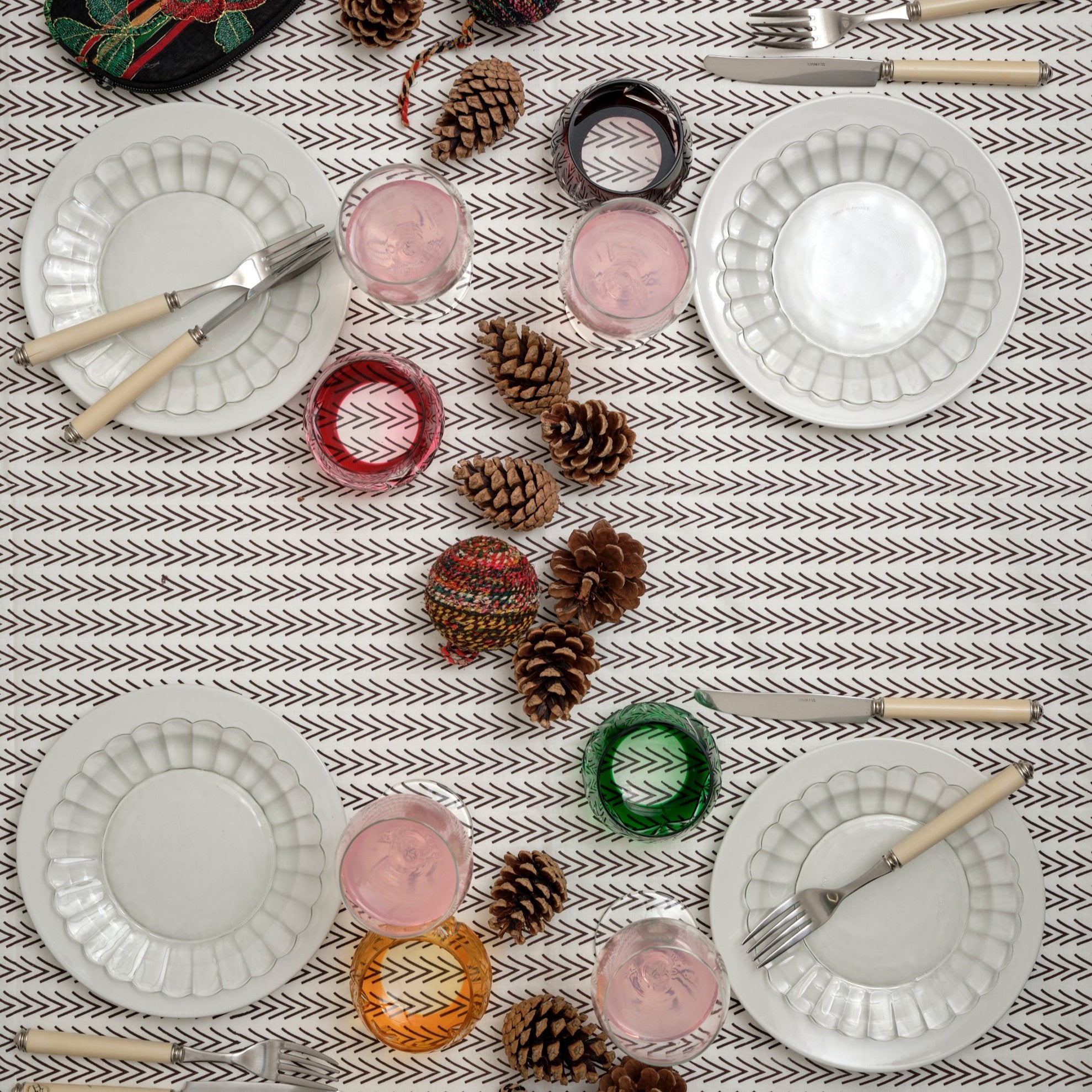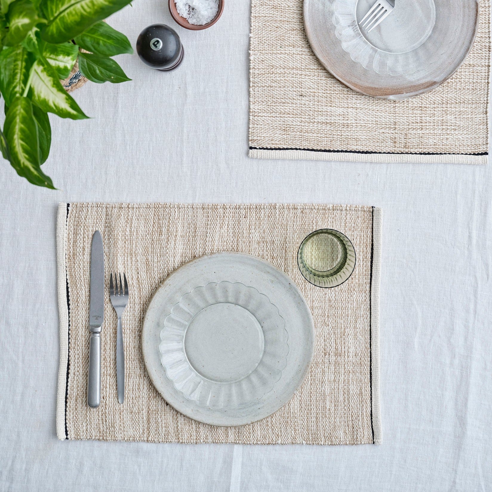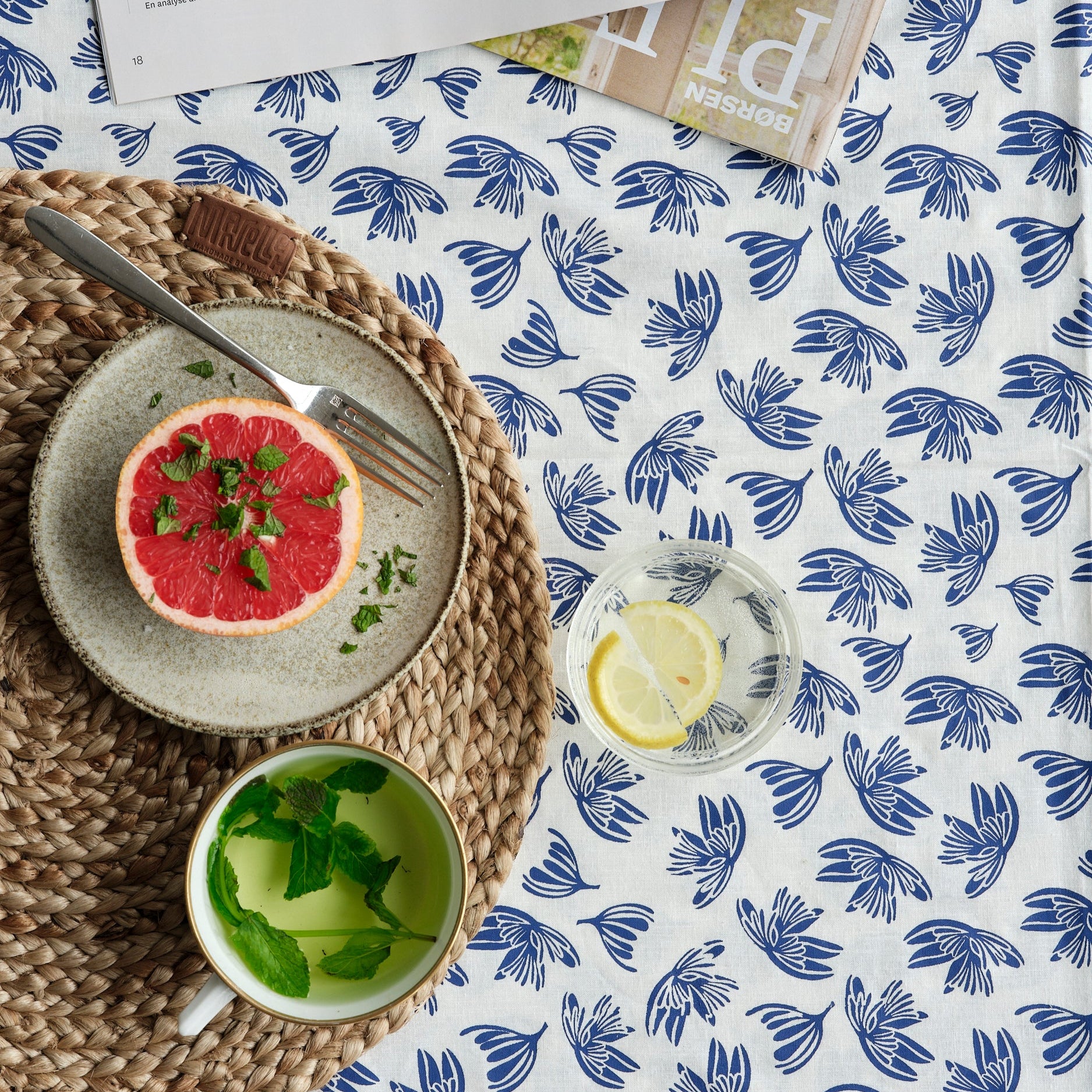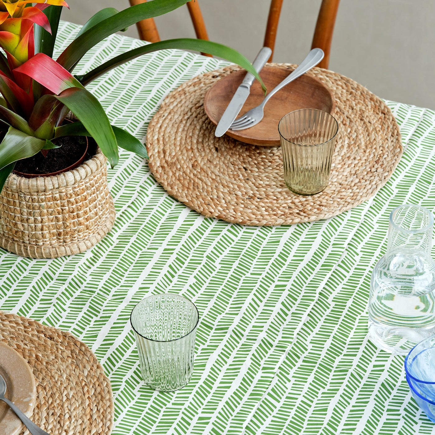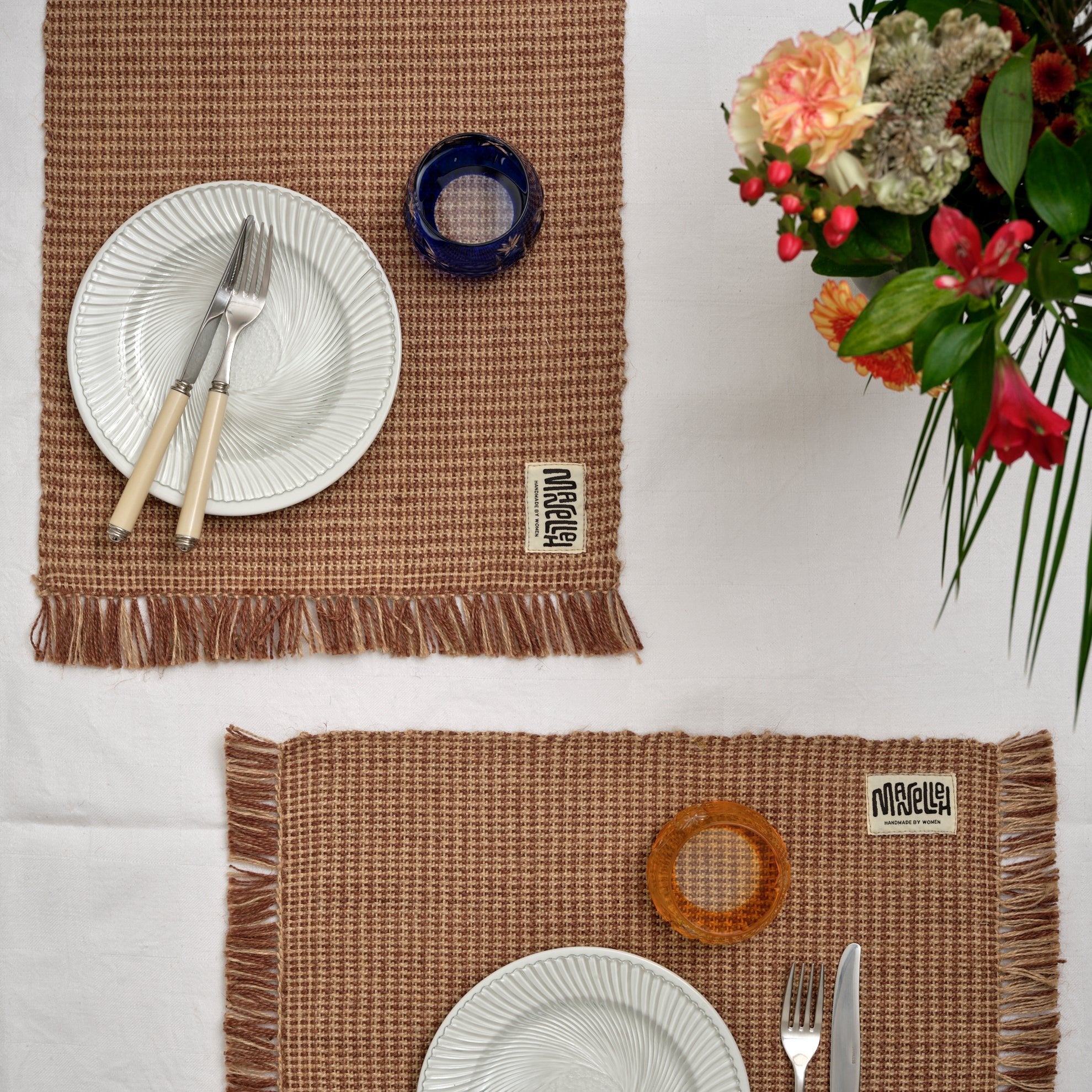 The collection includes, among other things, tablecloths and napkins in GOTS certified organic cotton, round jute placemats and tea caps made from vintage saris.