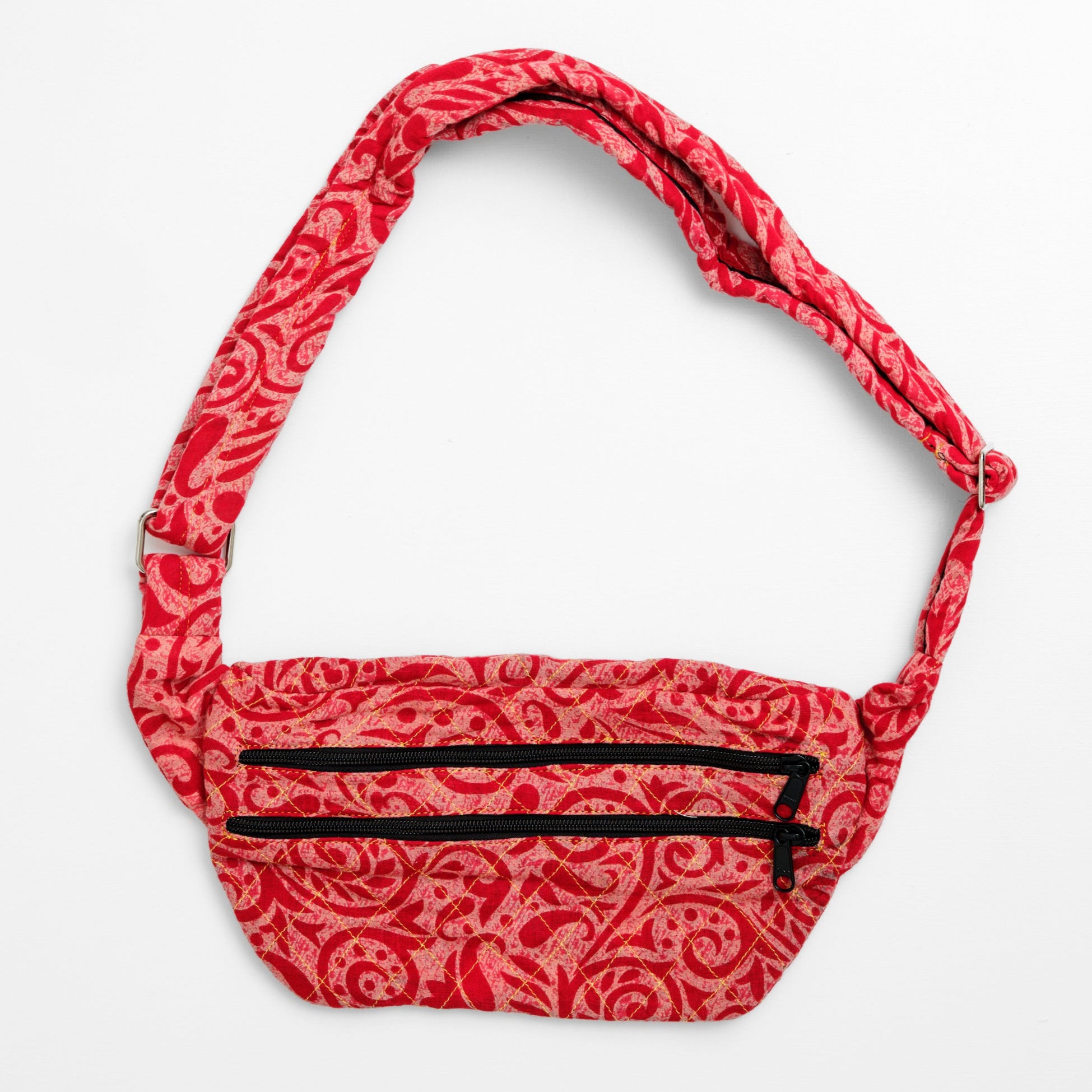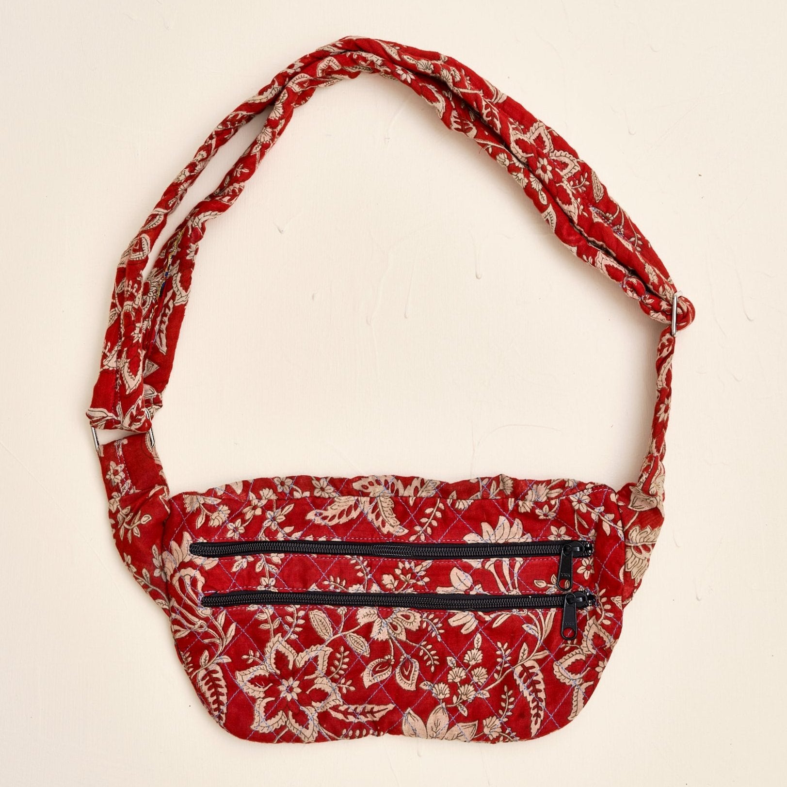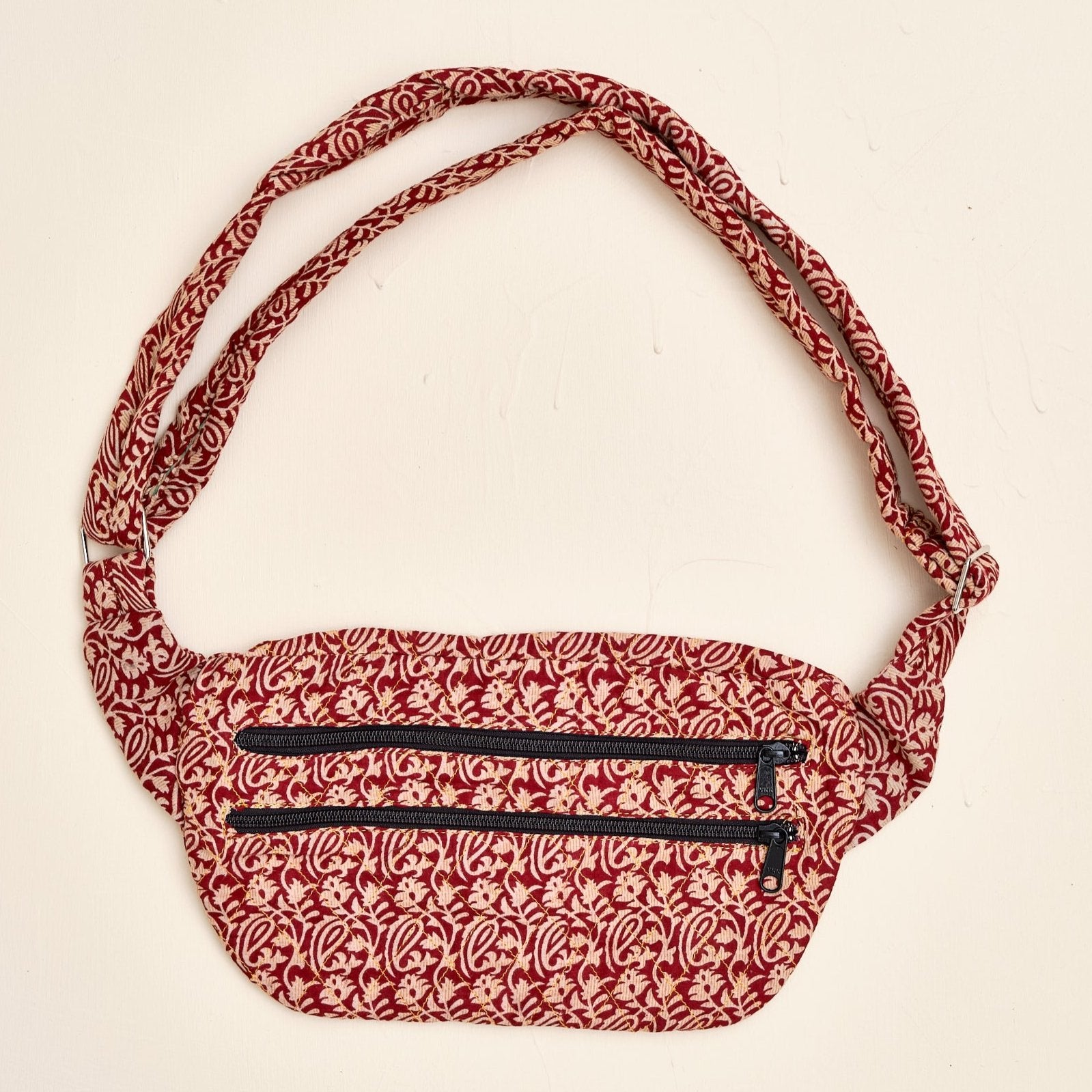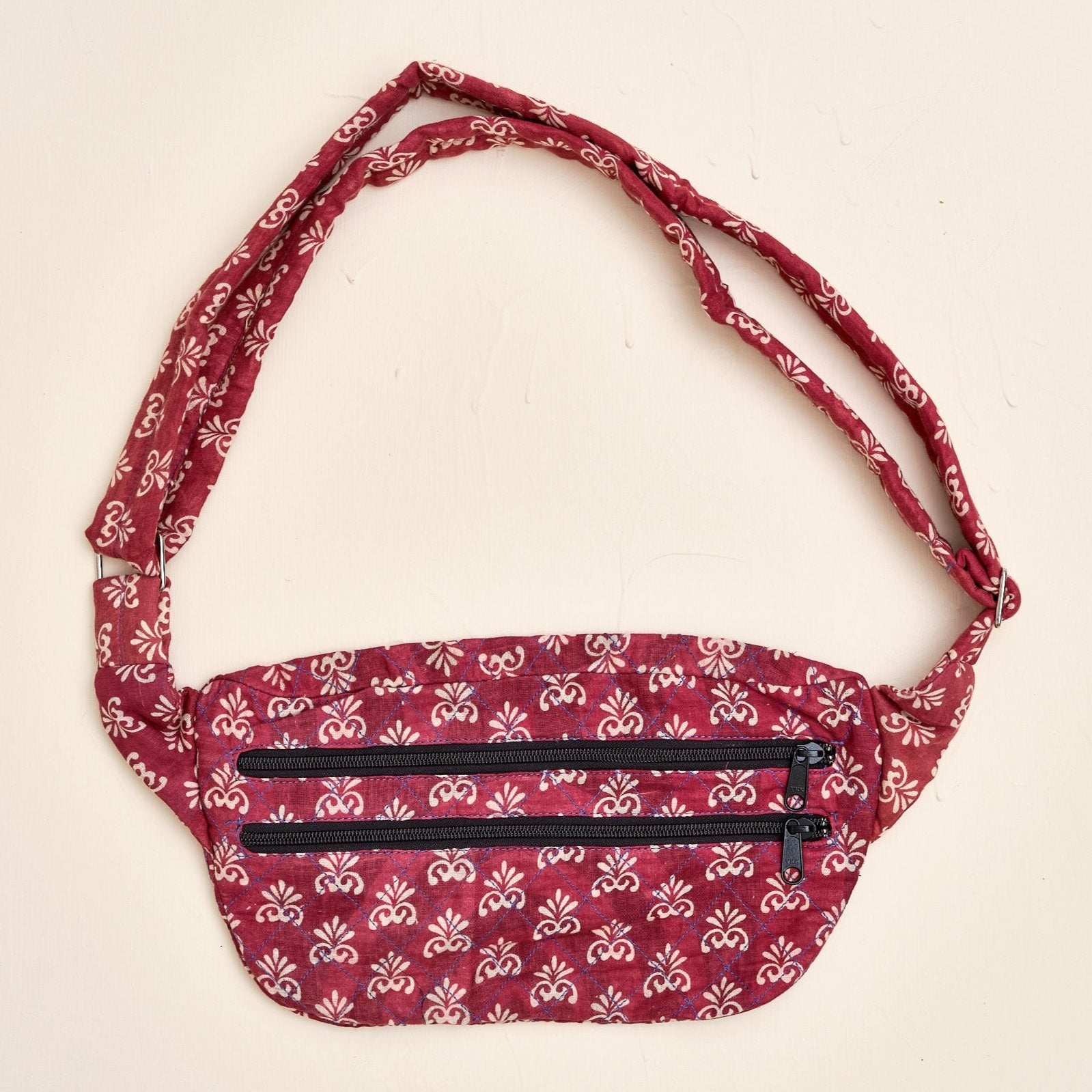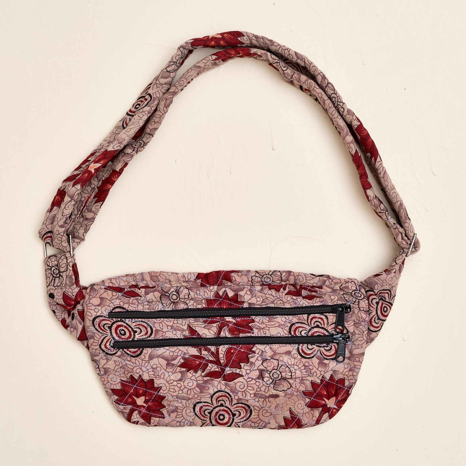 Our belt bags are made from vintage cotton sarees. It has an adjustable strap and internal and external pockets.