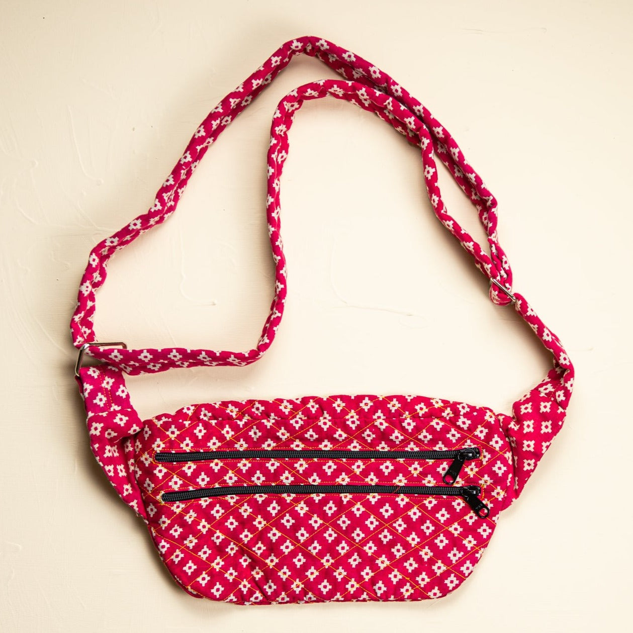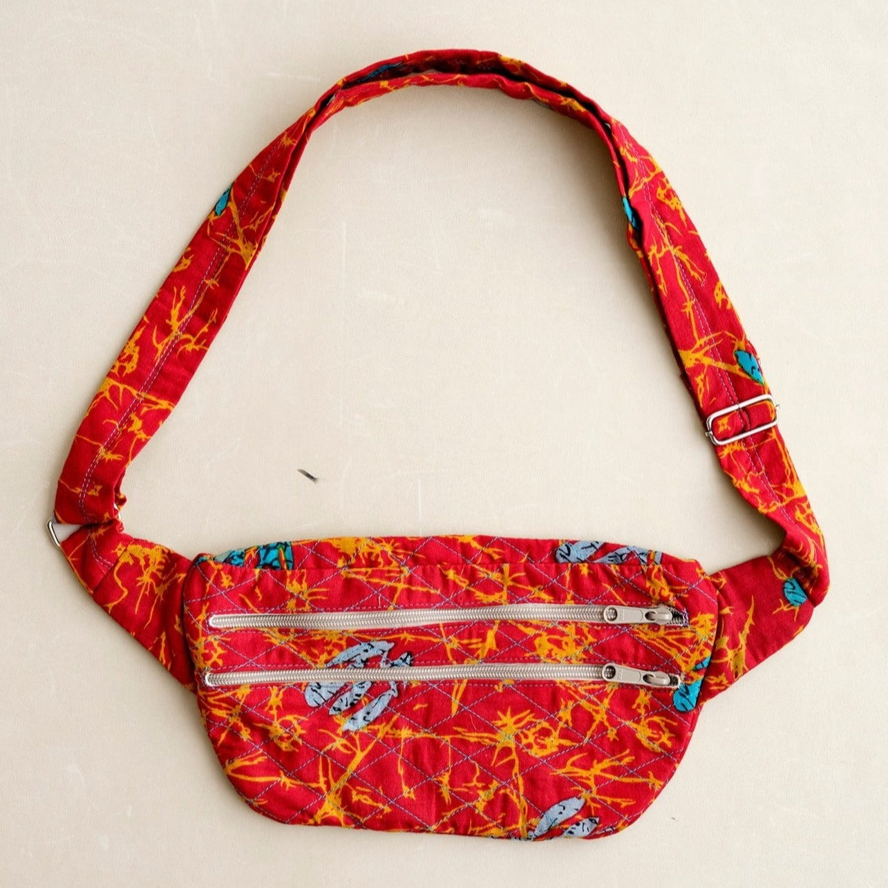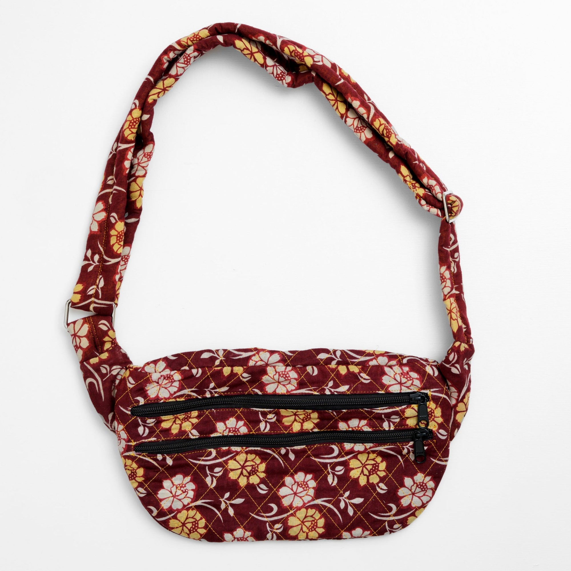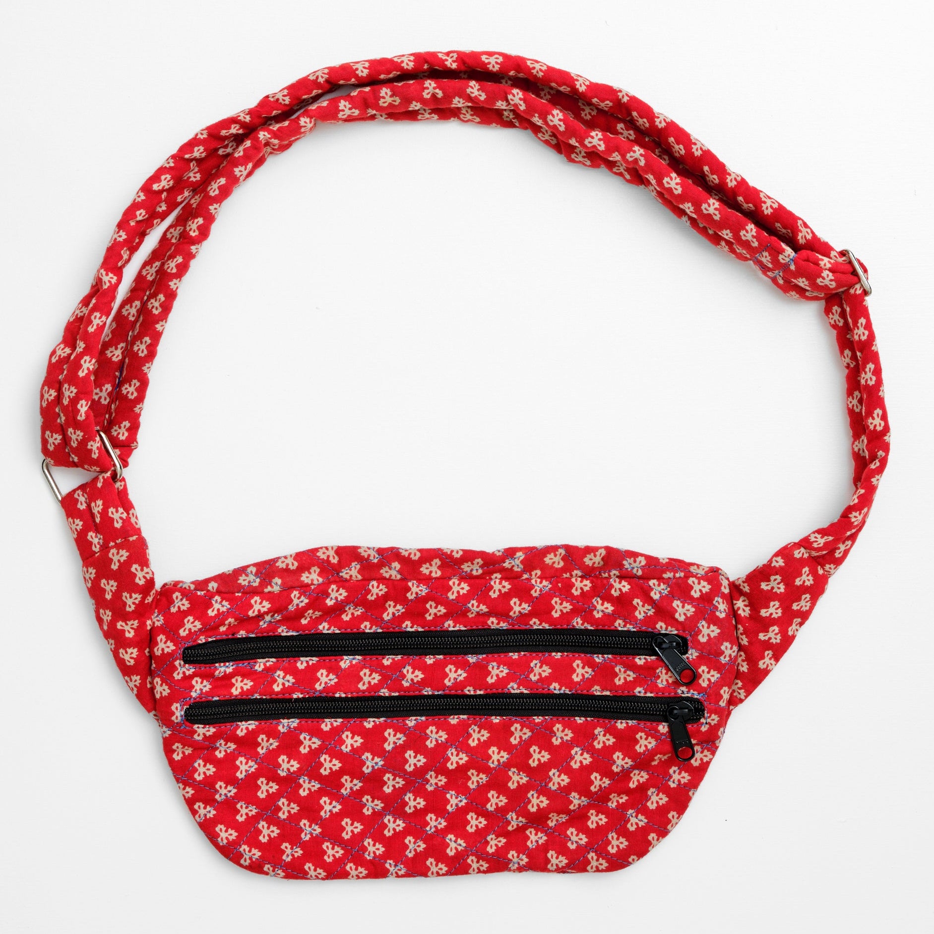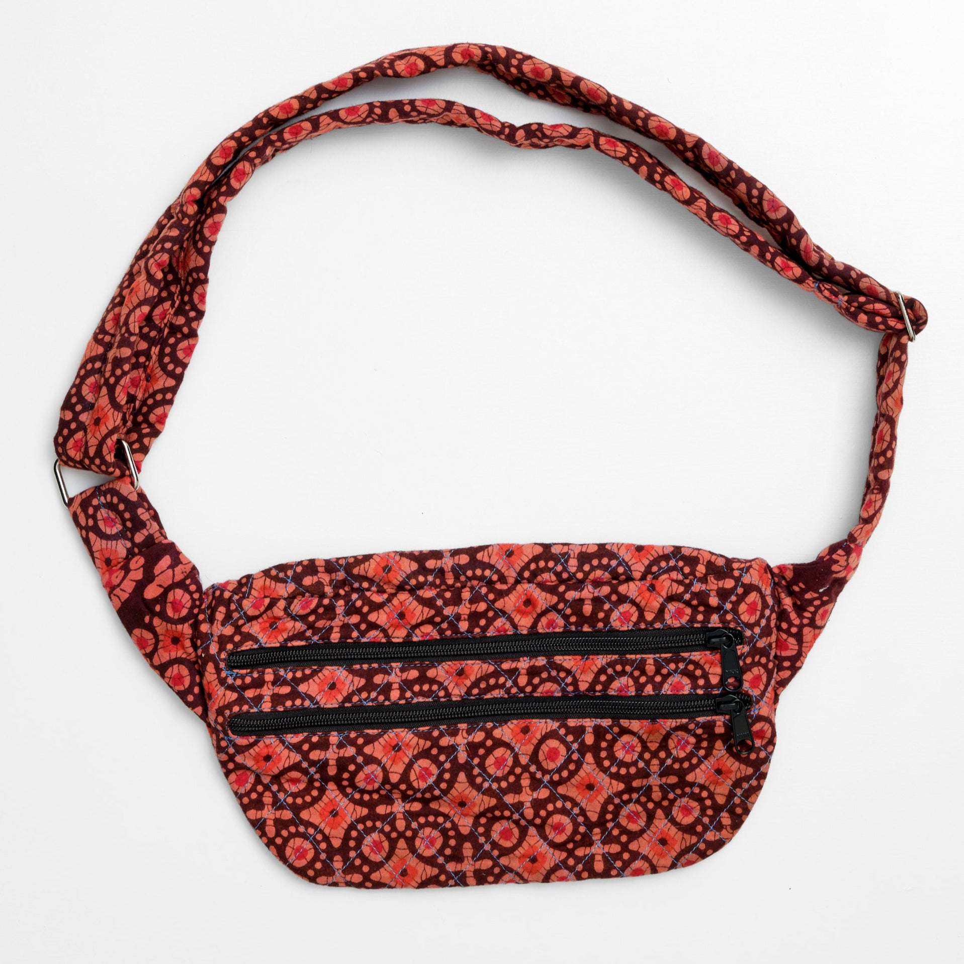 Our belt bags are made from vintage cotton sarees. It has an adjustable strap and internal and external pockets.