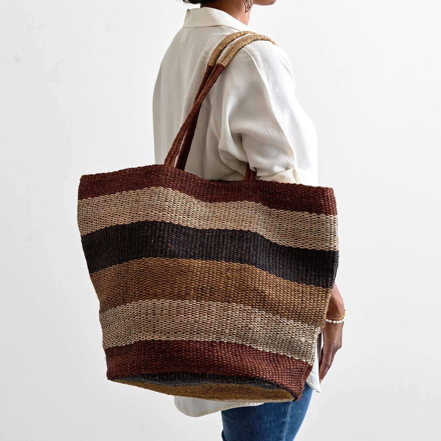 Each jute weekend bag is made from hand-woven jute fabric. The fabric is naturally dyed, handwoven and finally sewn into bags.