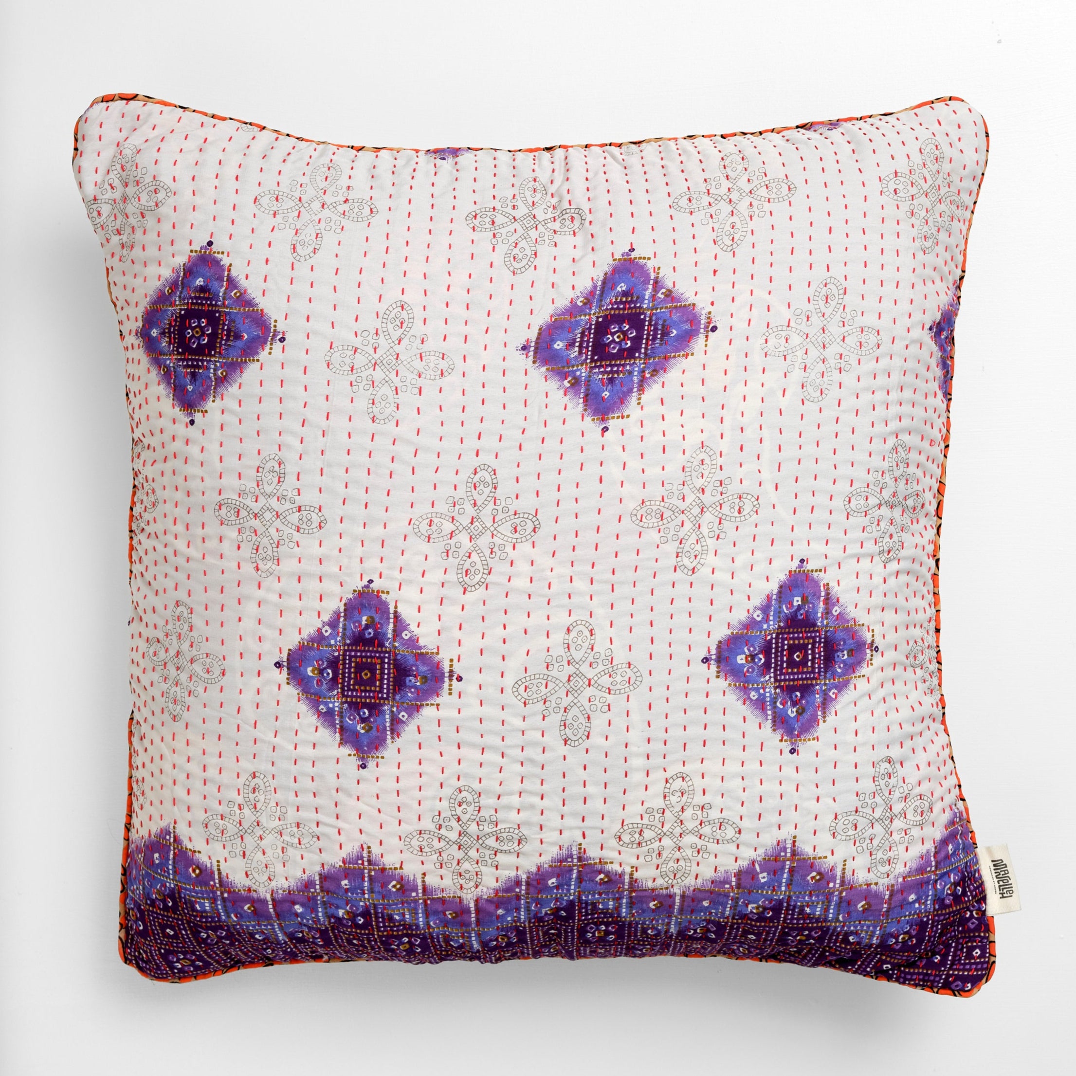 A large cushion measures 60x60 cm. The many beautiful cushions are stitched with four layers of vintage saris and are available in both cotton and silk.