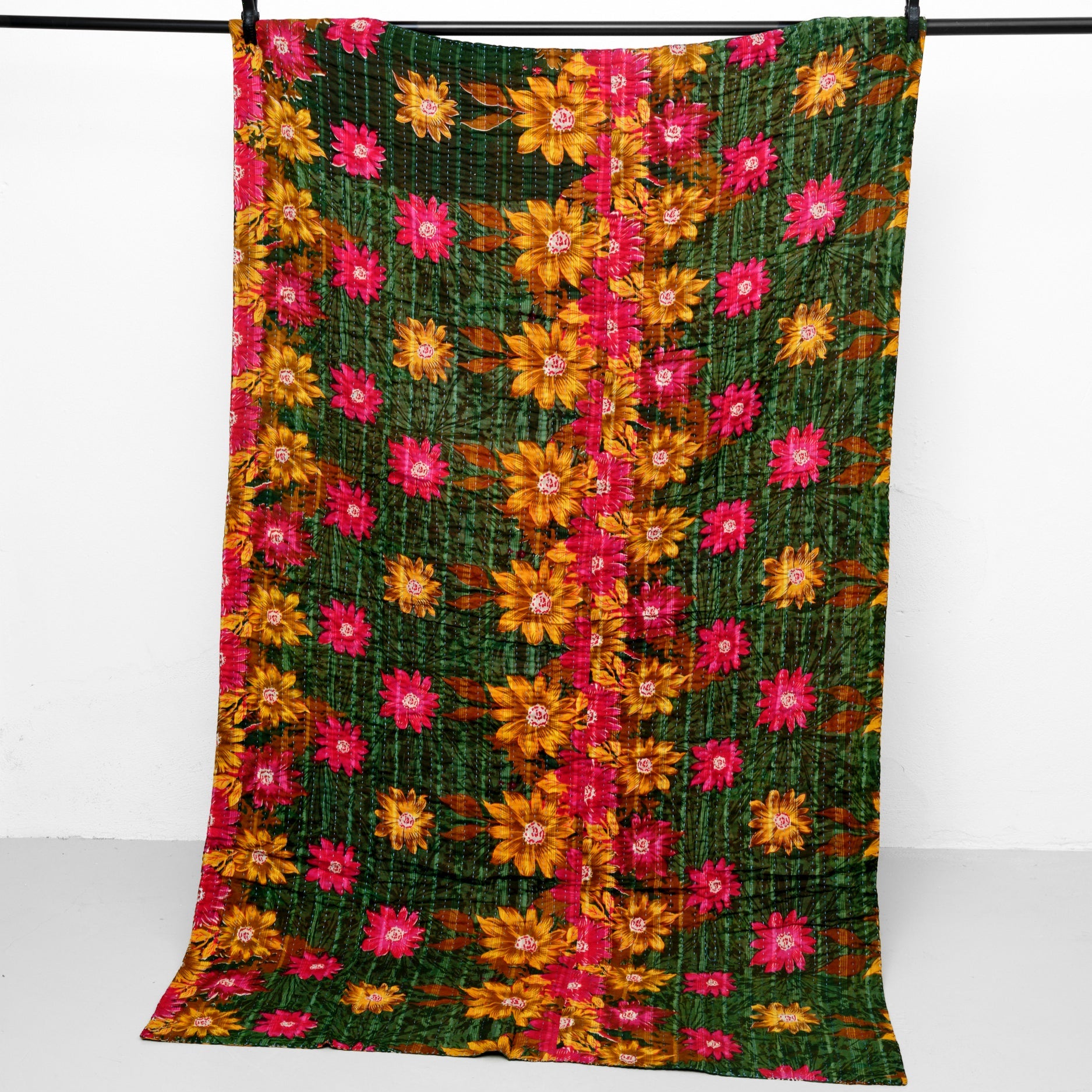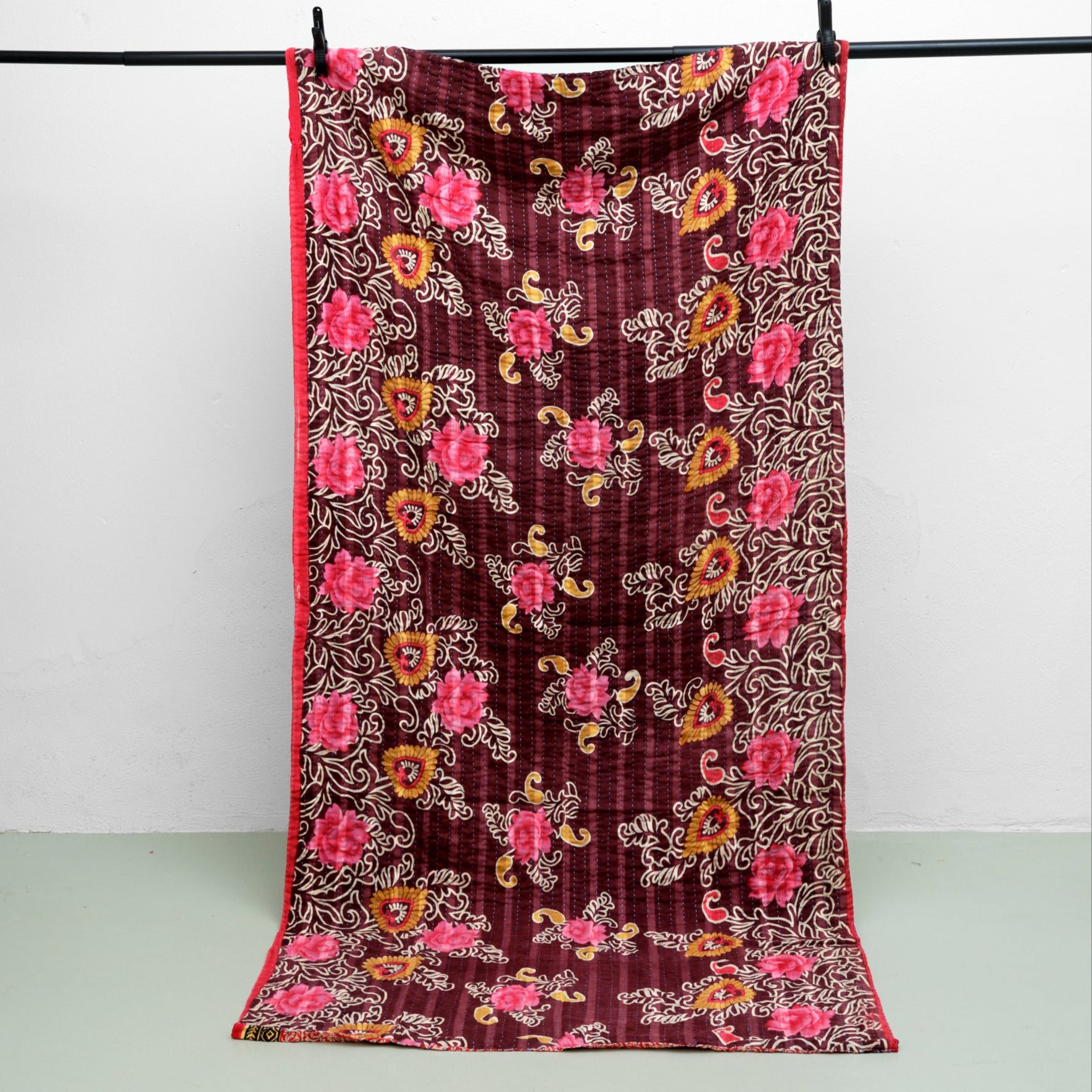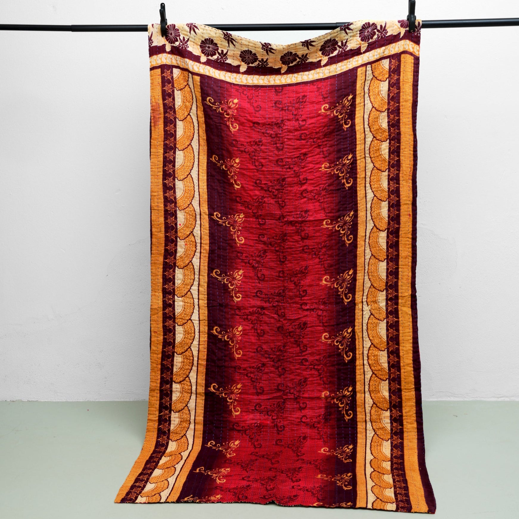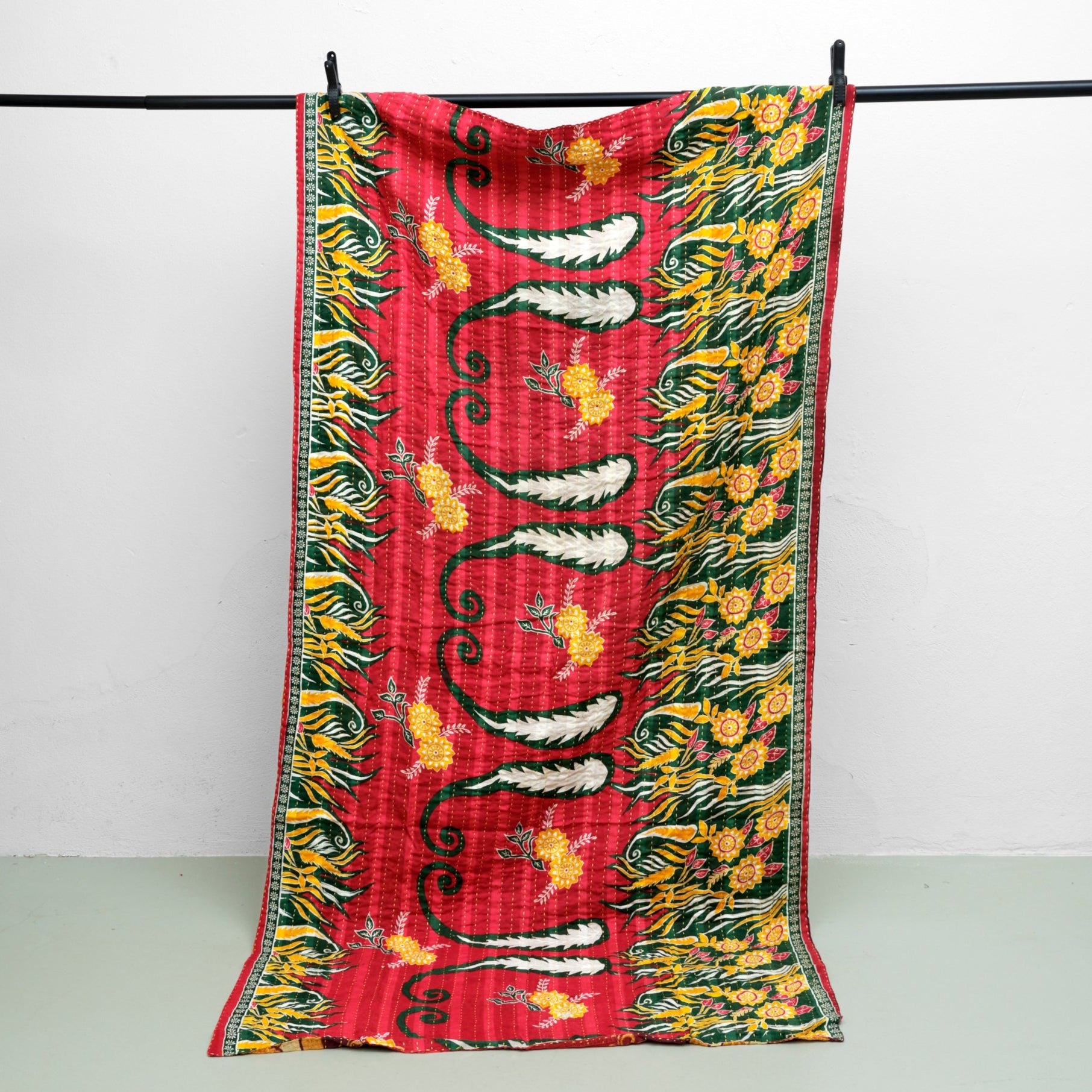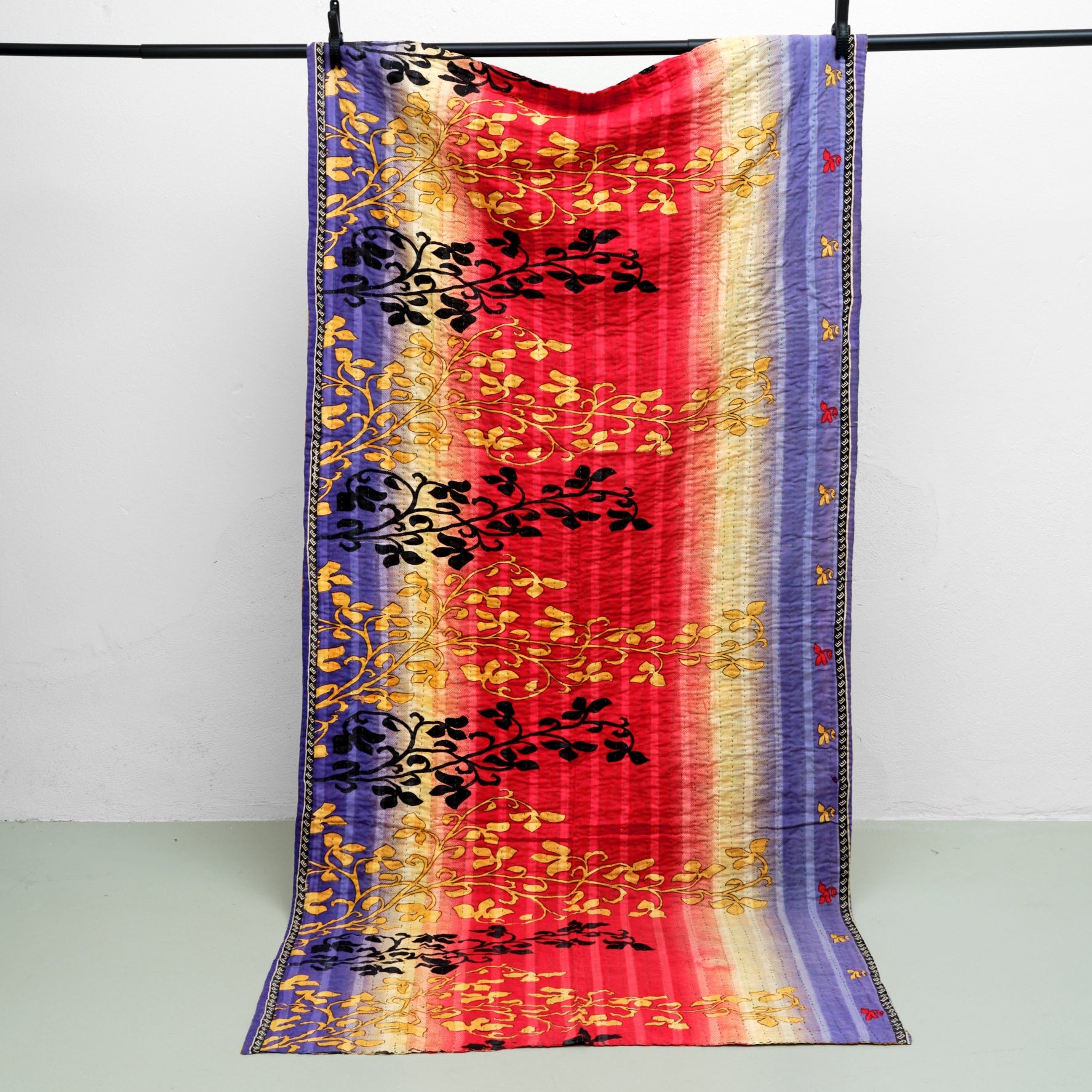 The many unique kantha blankets are hand-stitched with four layers of vintage cotton saris. The blankets are available in many different sizes, and each blanket is unique.