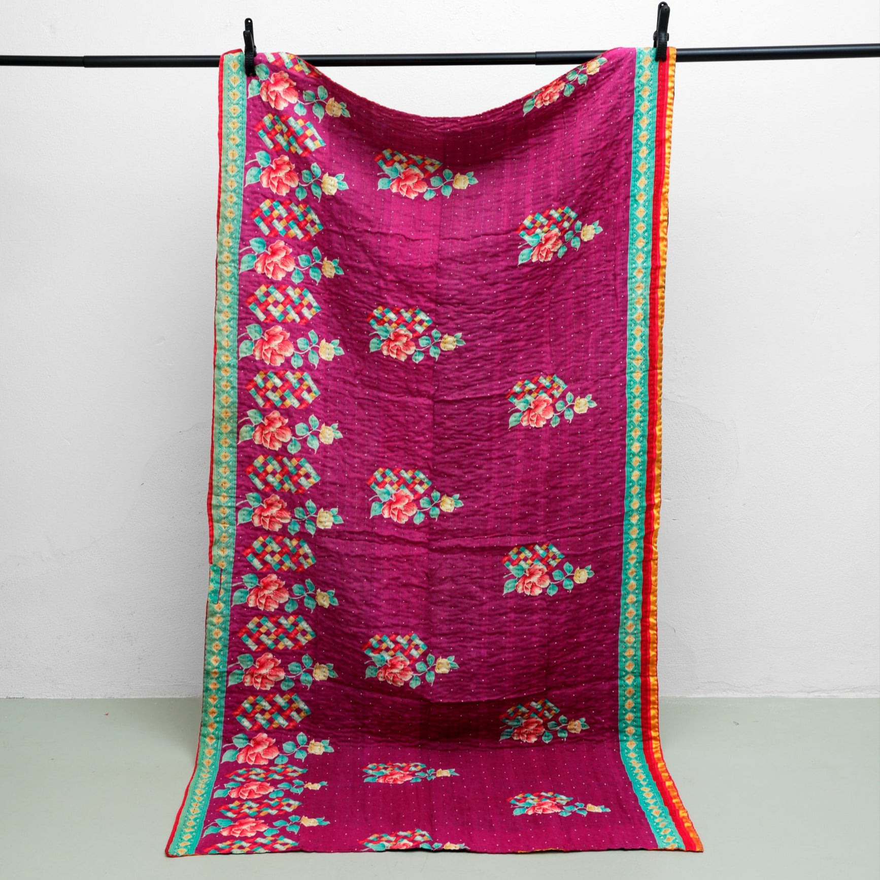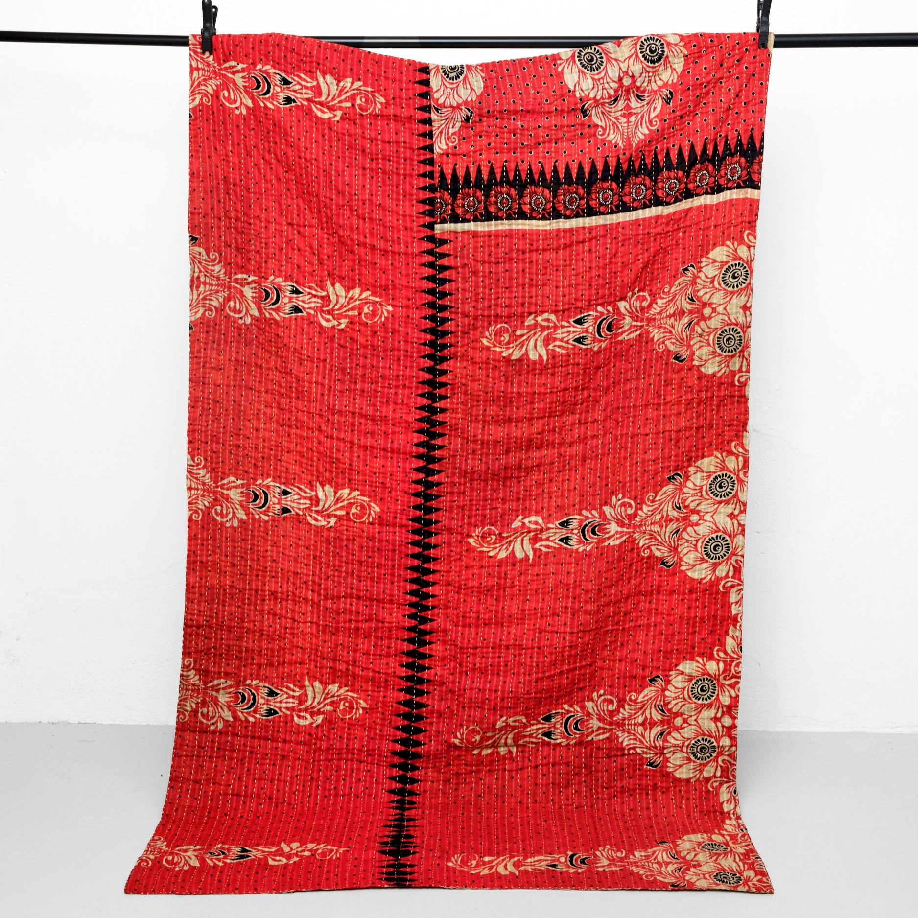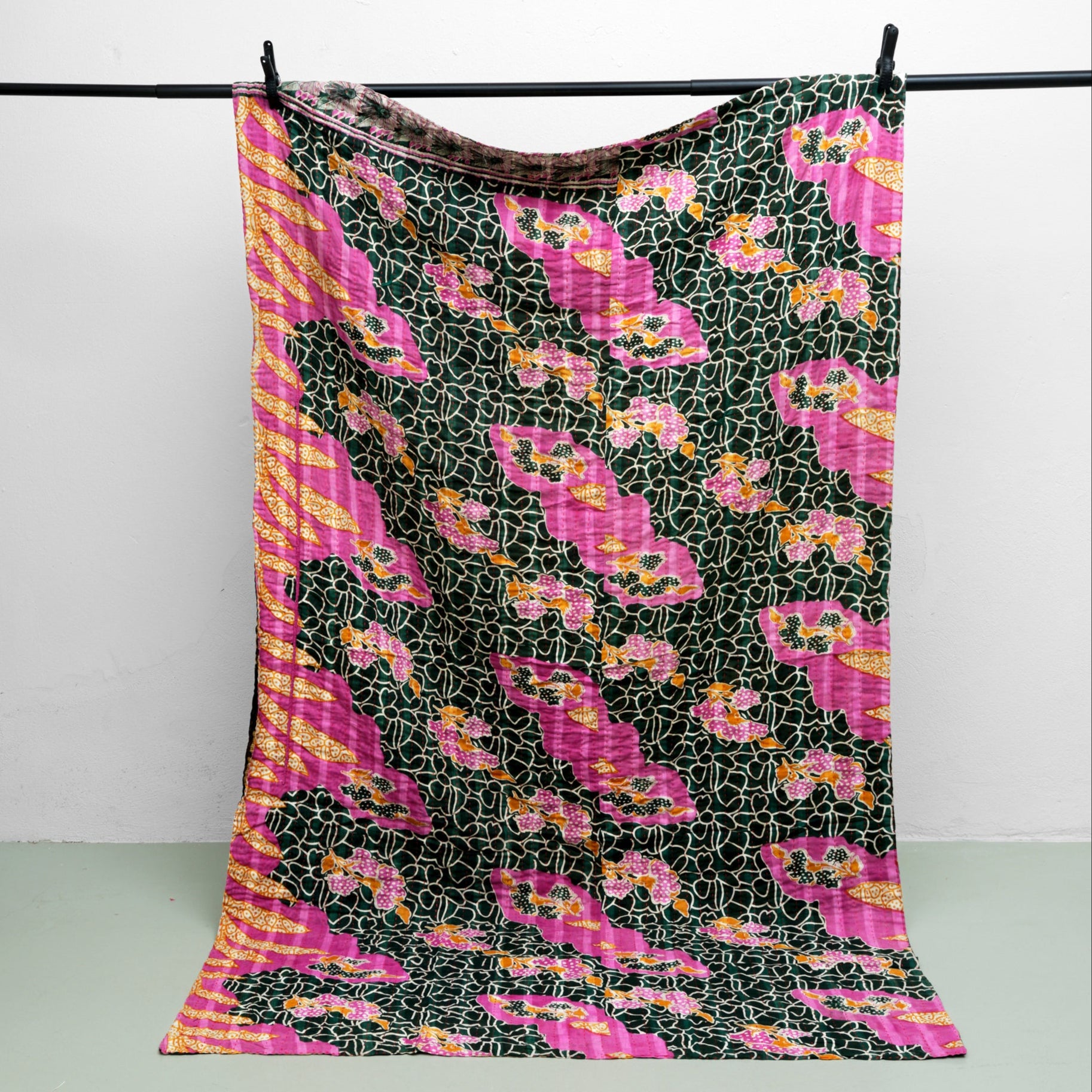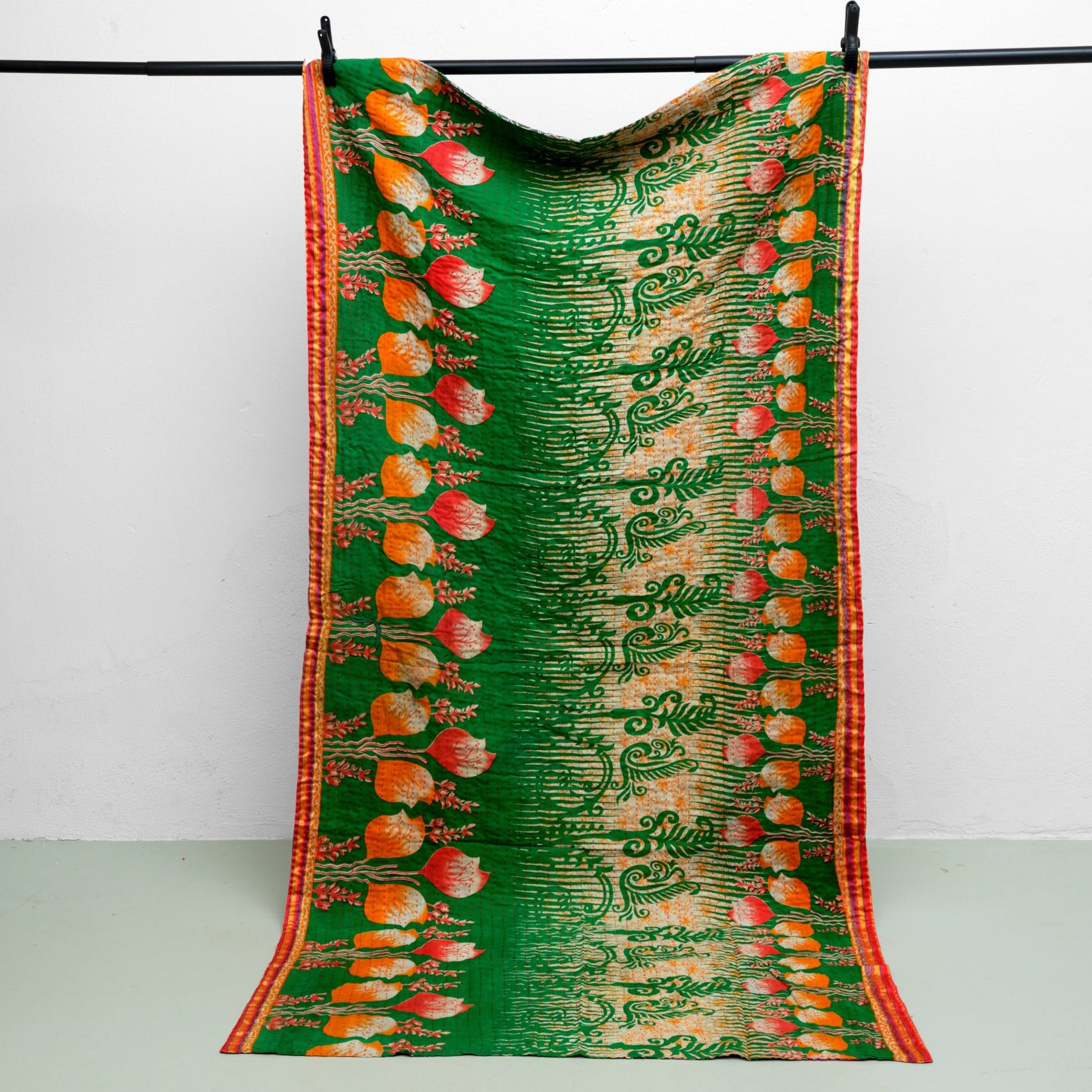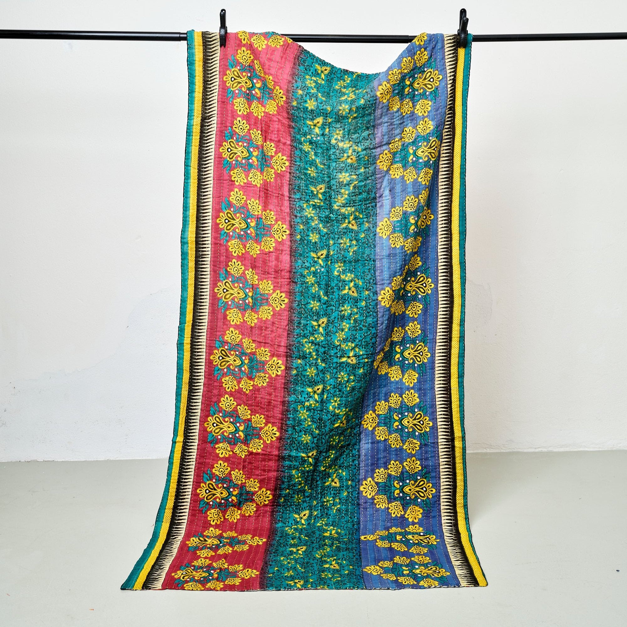 The many unique kantha blankets are hand-stitched with four layers of vintage cotton saris. The blankets are available in many different sizes, and each blanket is unique.