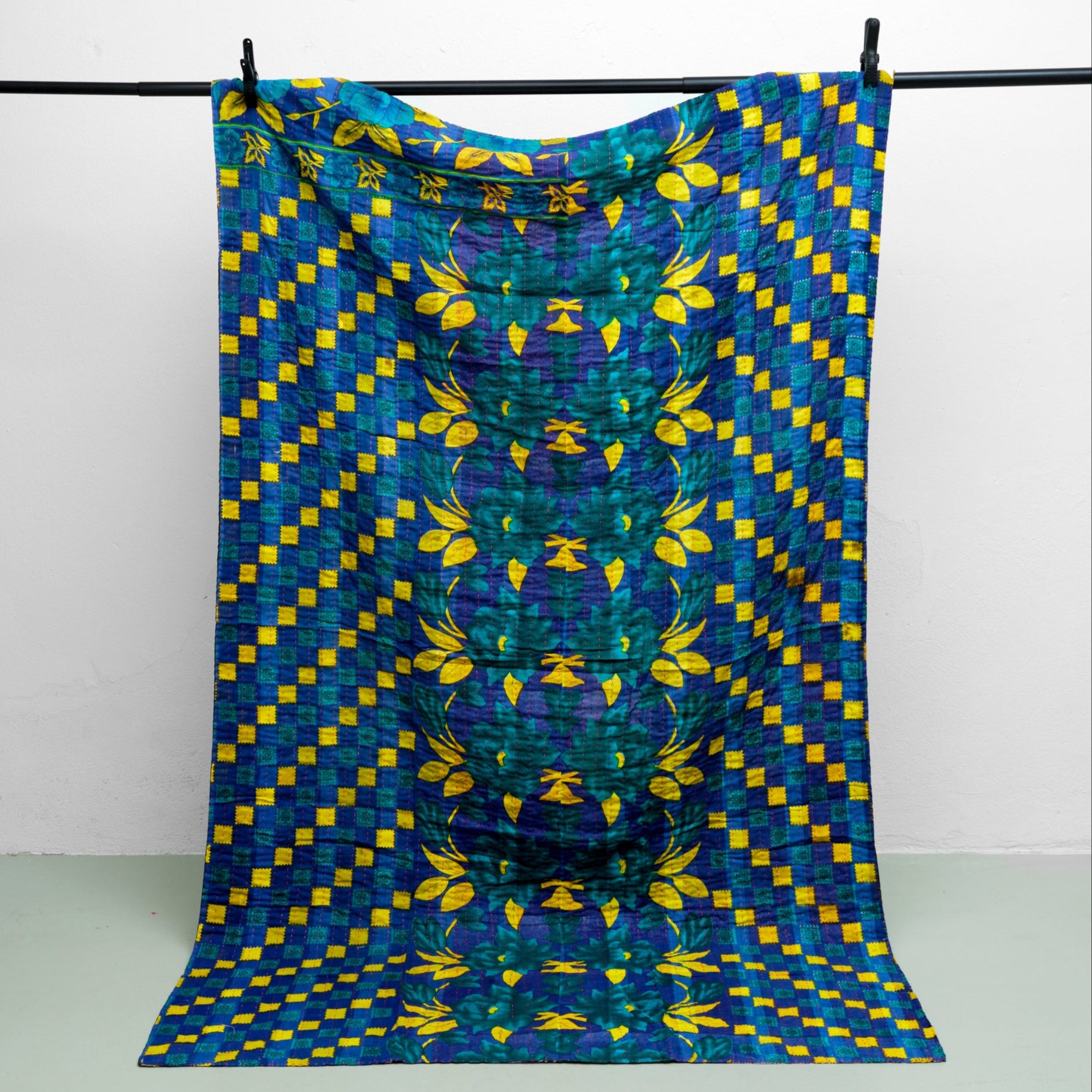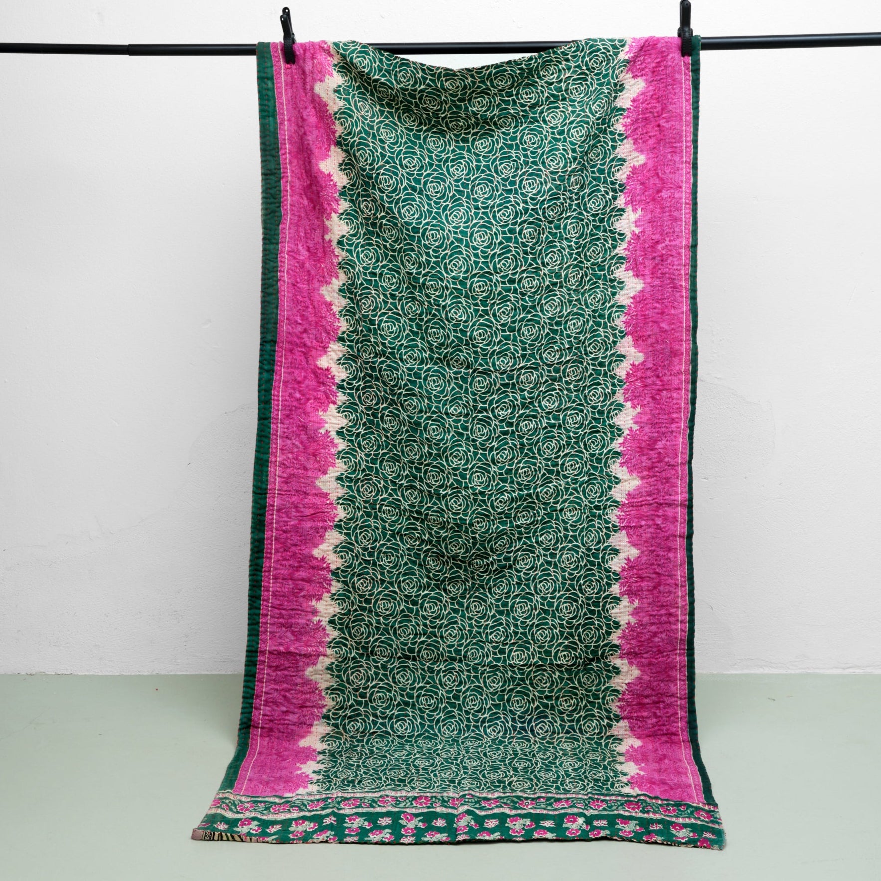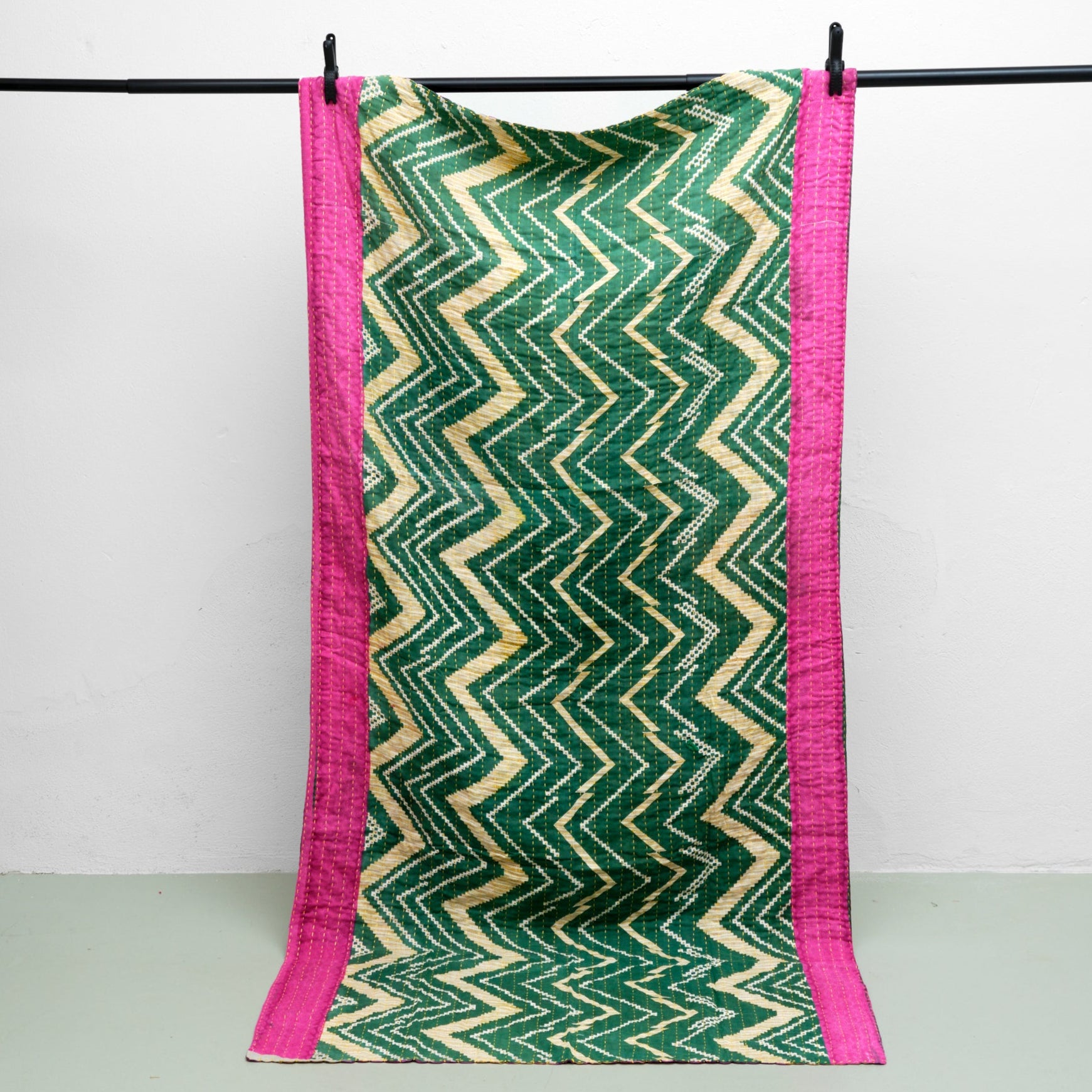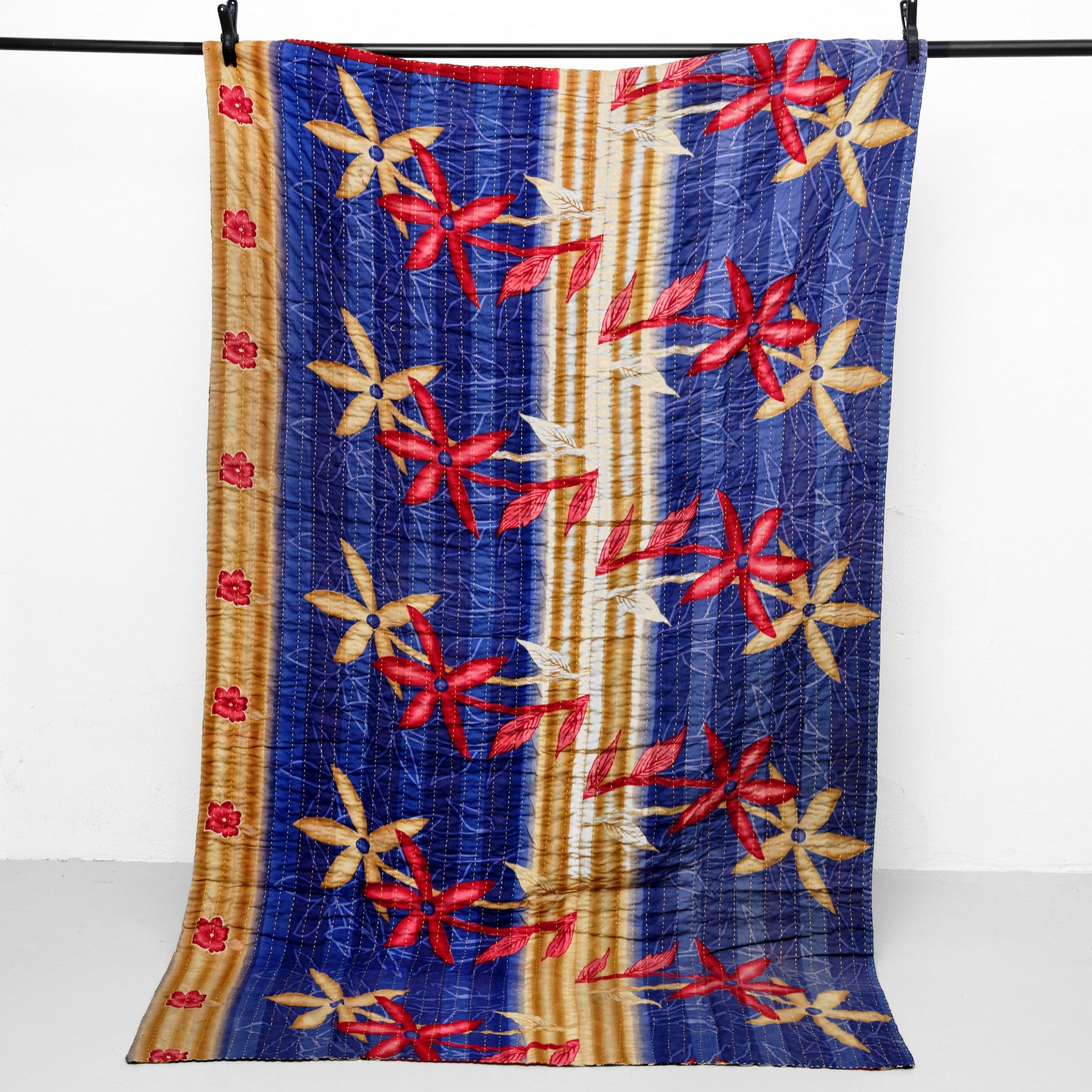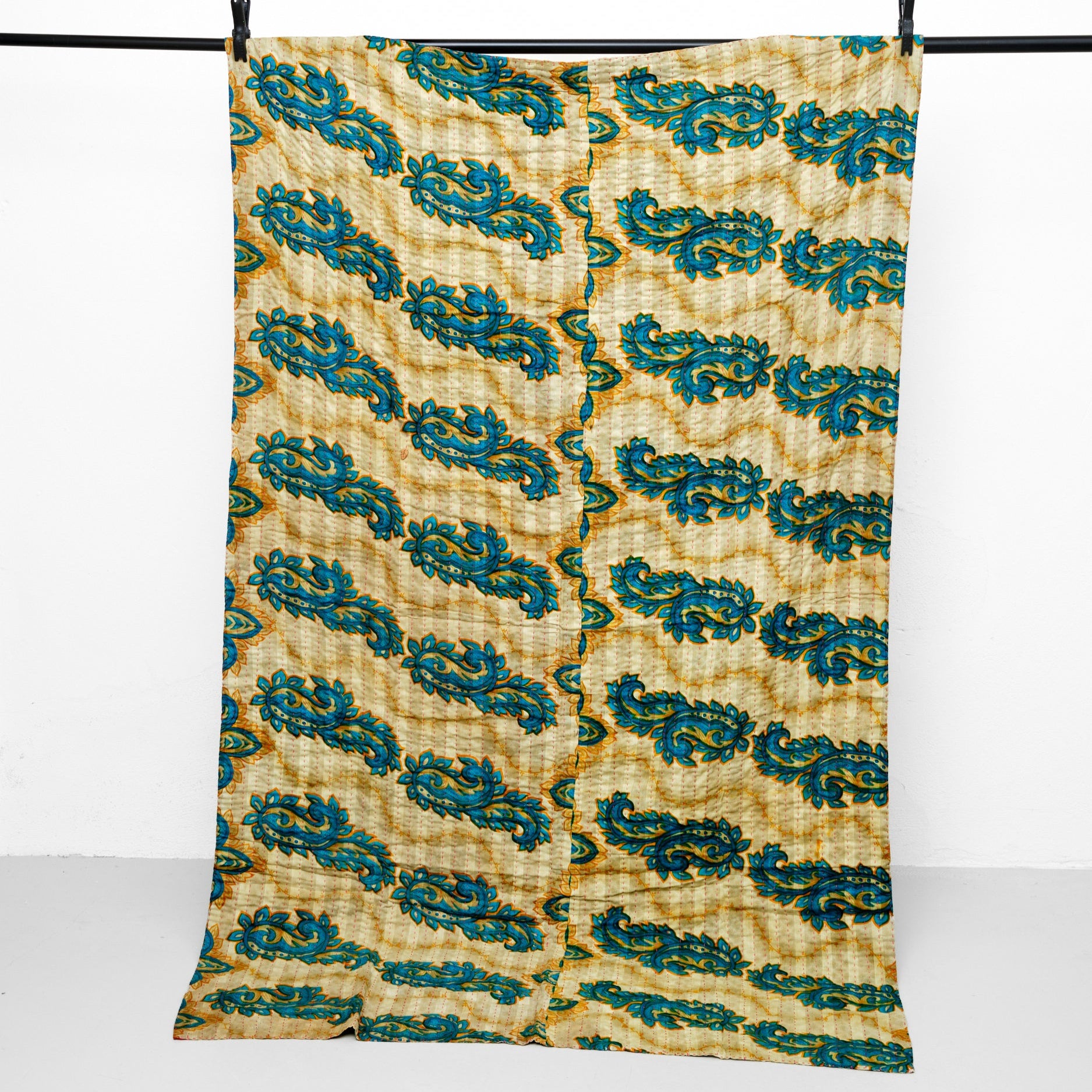 The many unique kantha blankets are hand-stitched with four layers of vintage cotton saris. The blankets are available in many different sizes, and each blanket is unique.