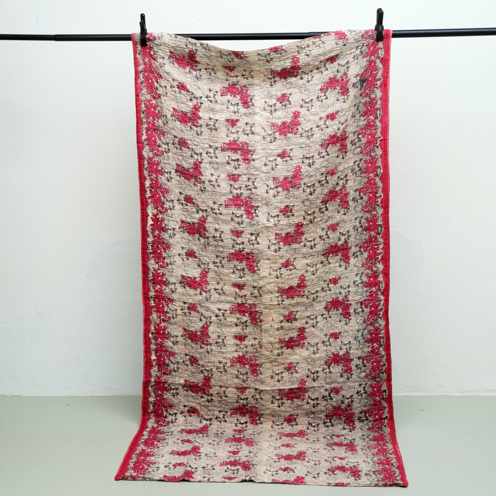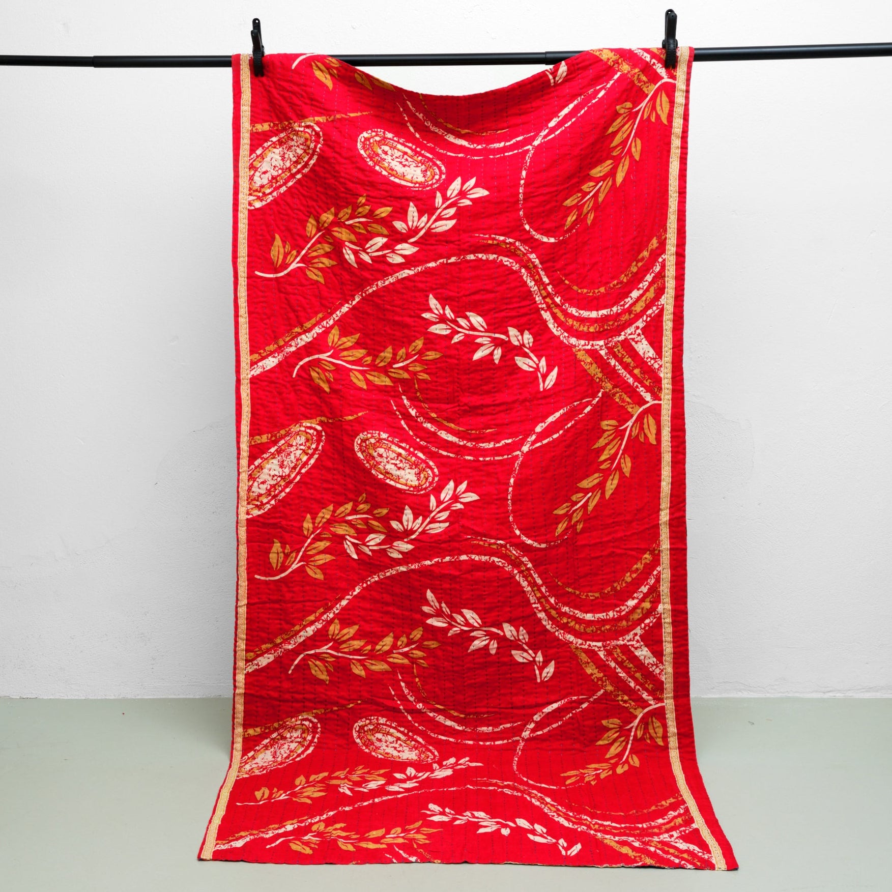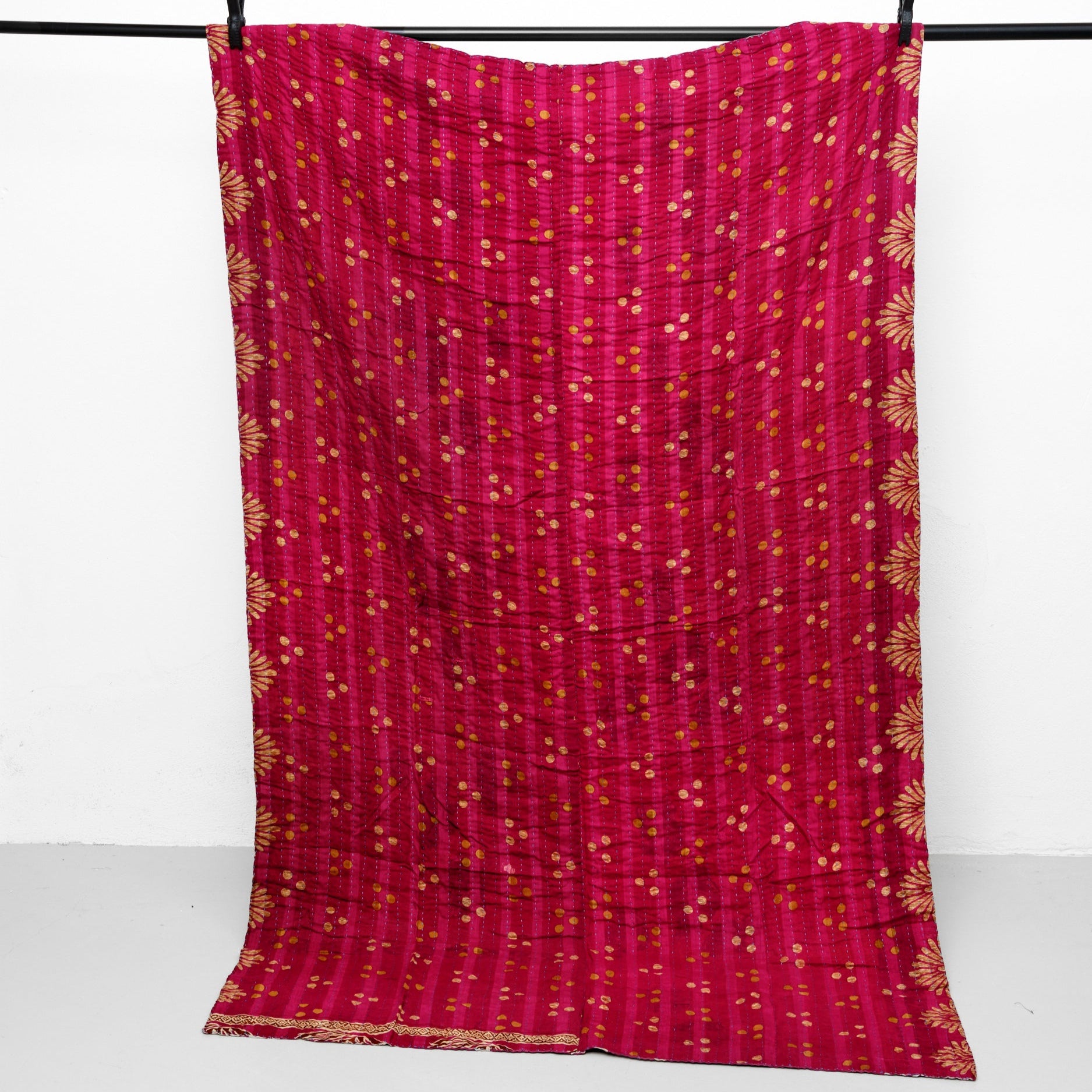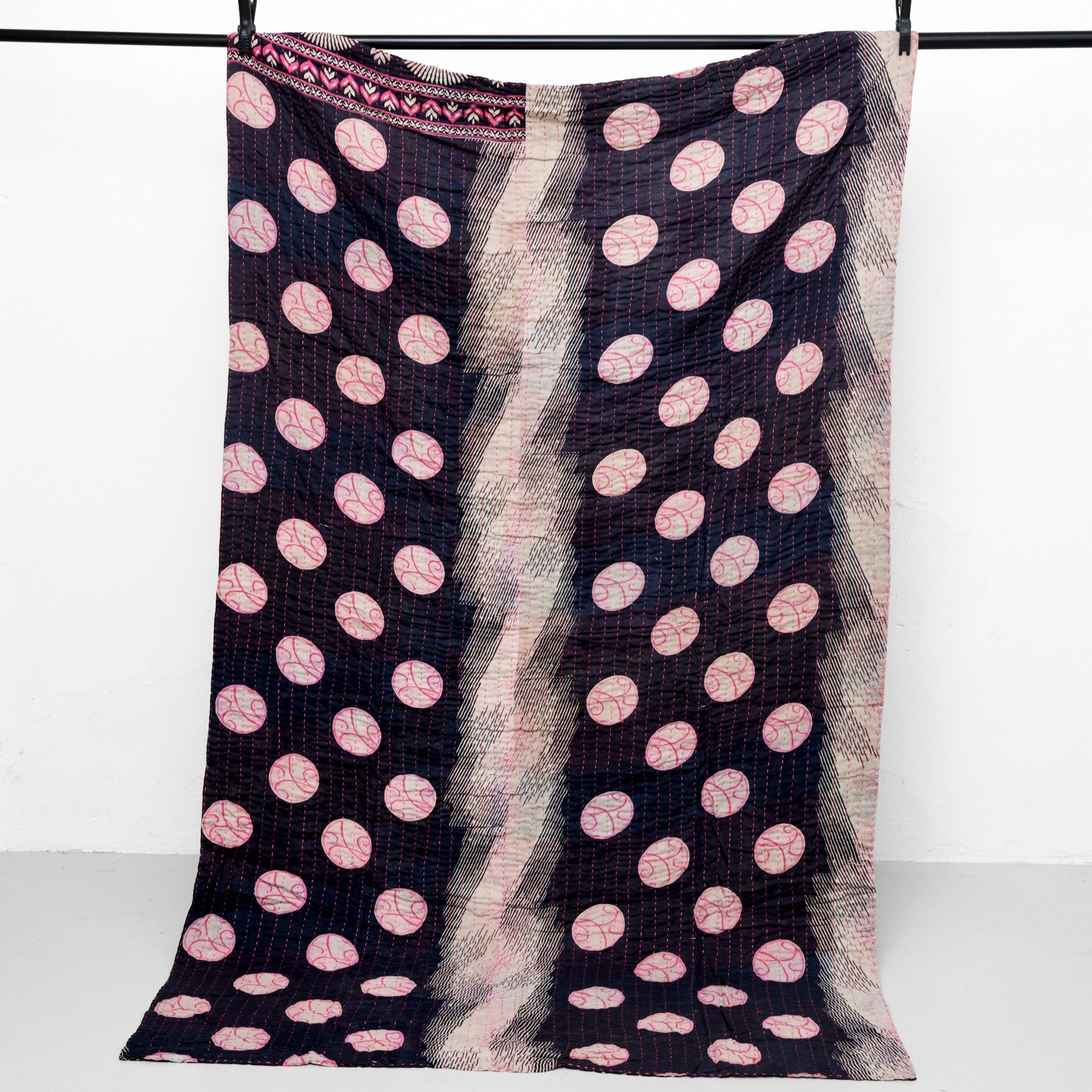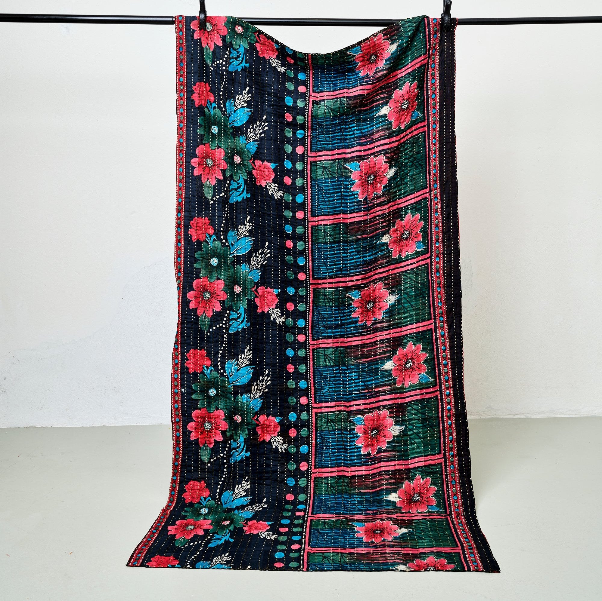 The many unique kantha blankets are hand-stitched with four layers of vintage cotton saris. The blankets are available in many different sizes, and each blanket is unique.