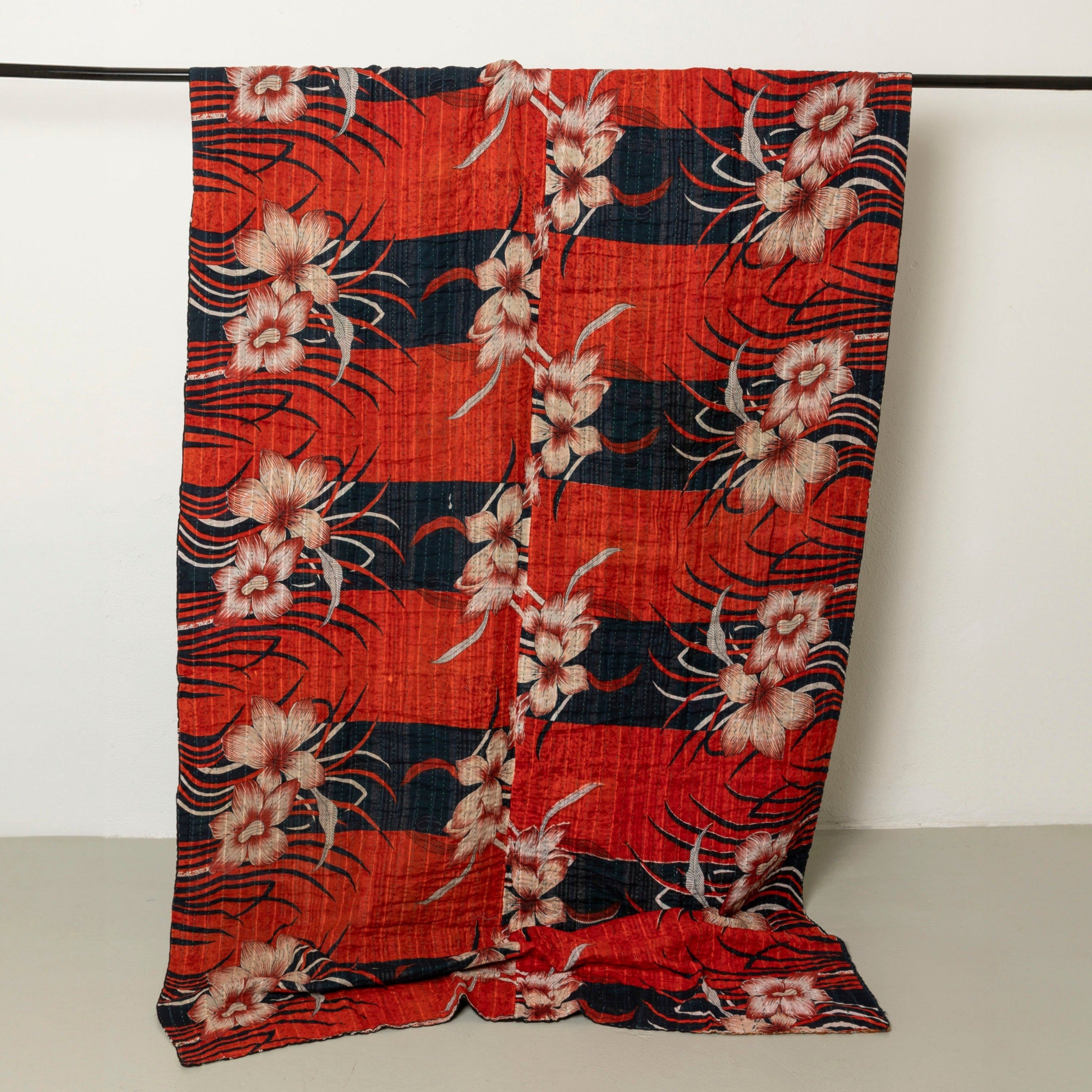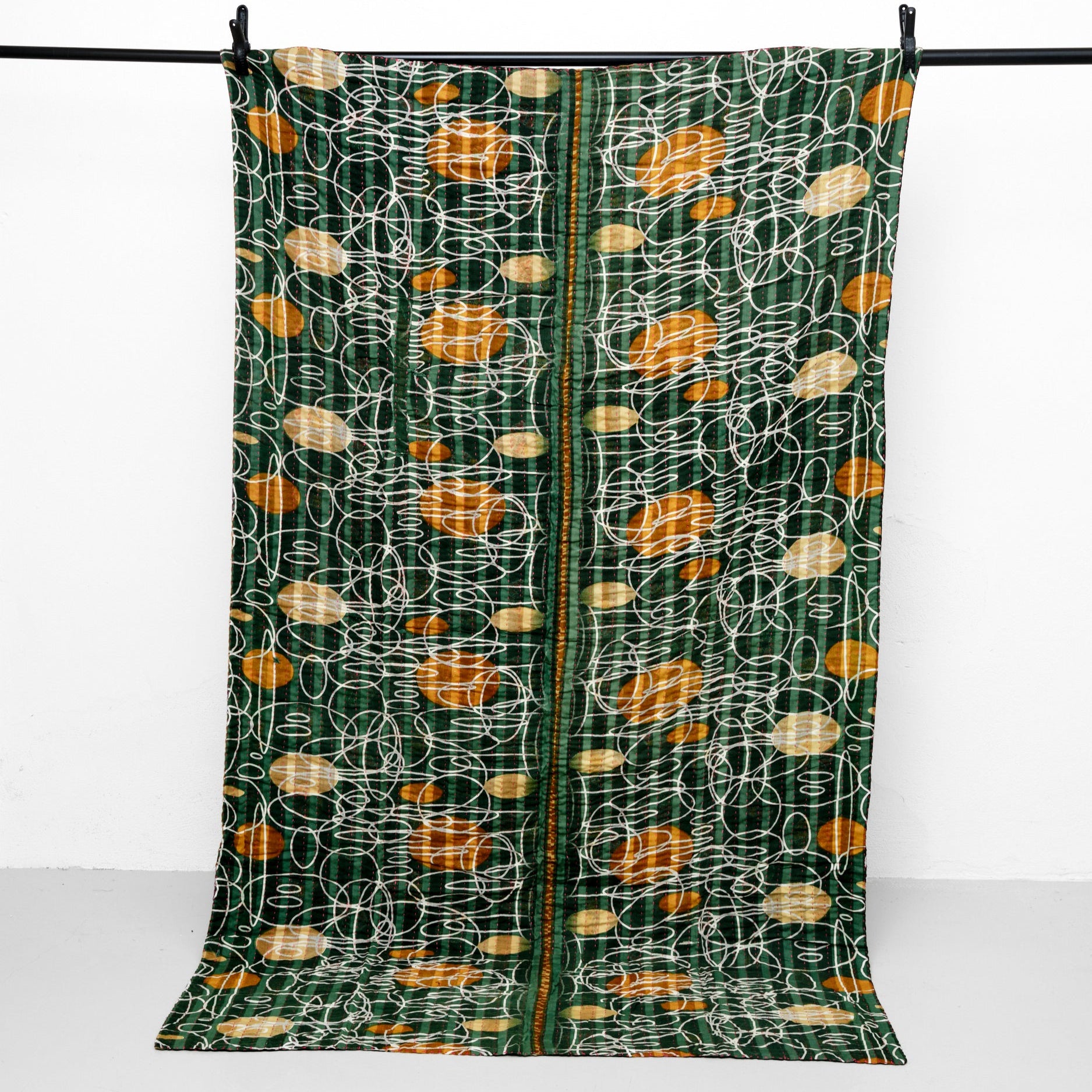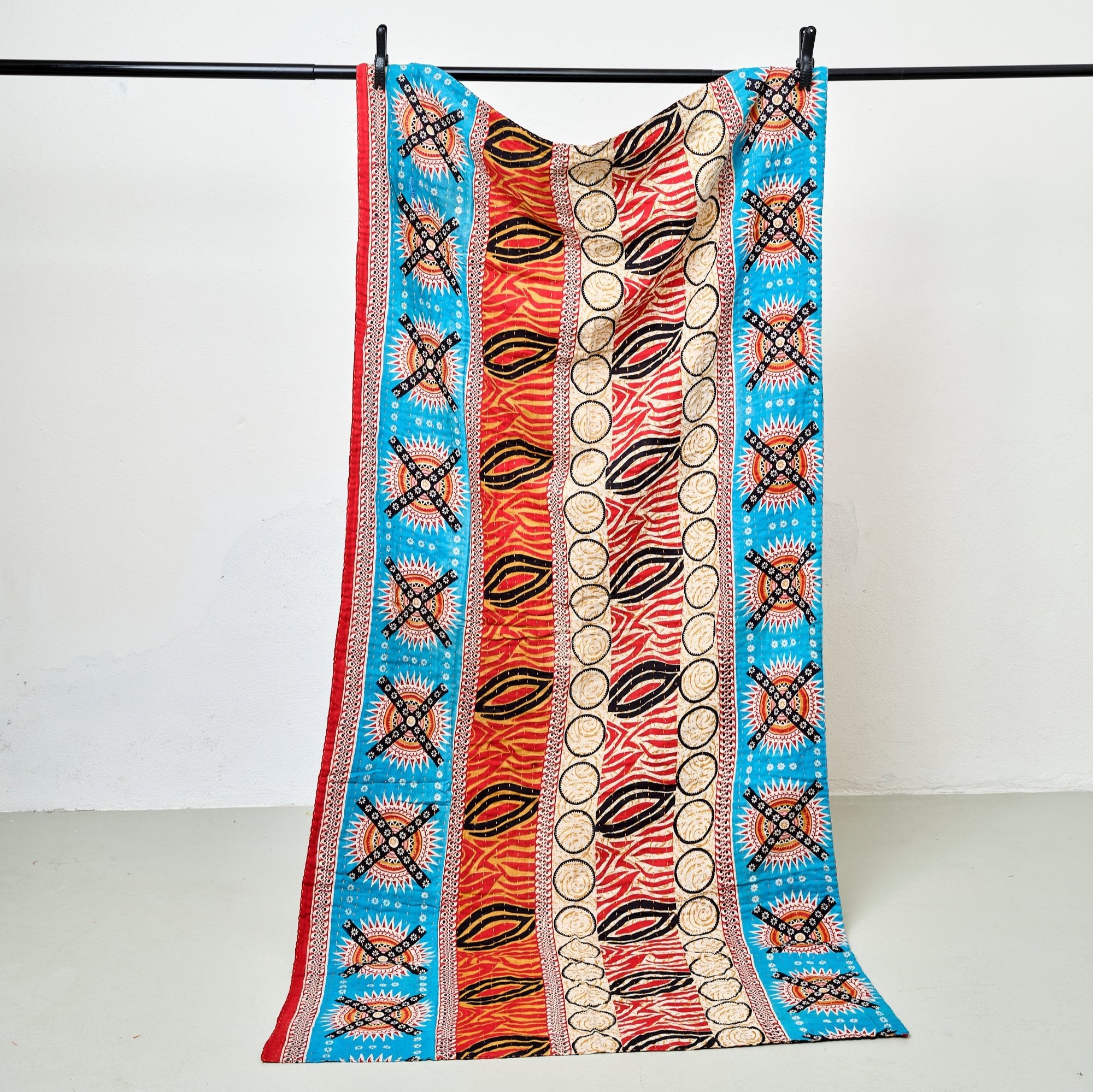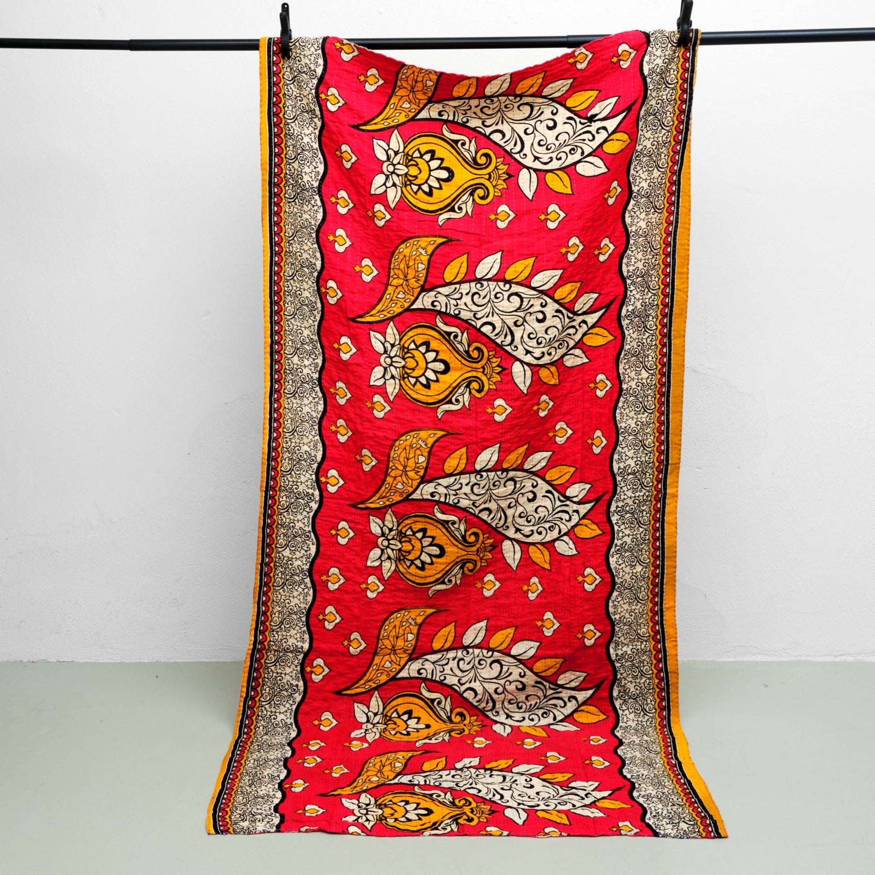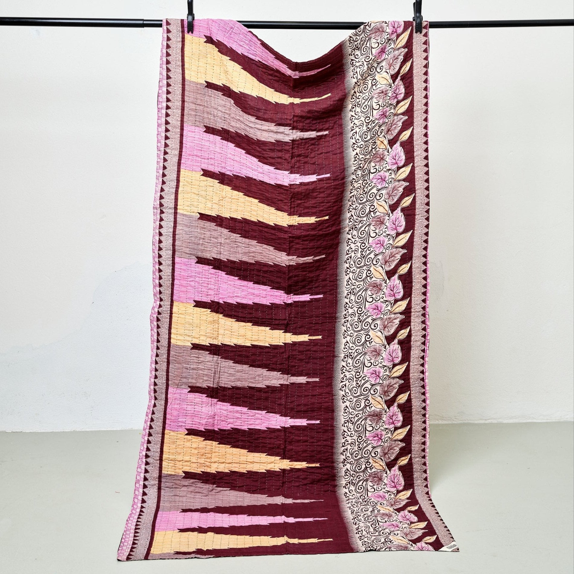 The many unique kantha blankets are hand-stitched with four layers of vintage cotton saris. The blankets are available in many different sizes, and each blanket is unique.