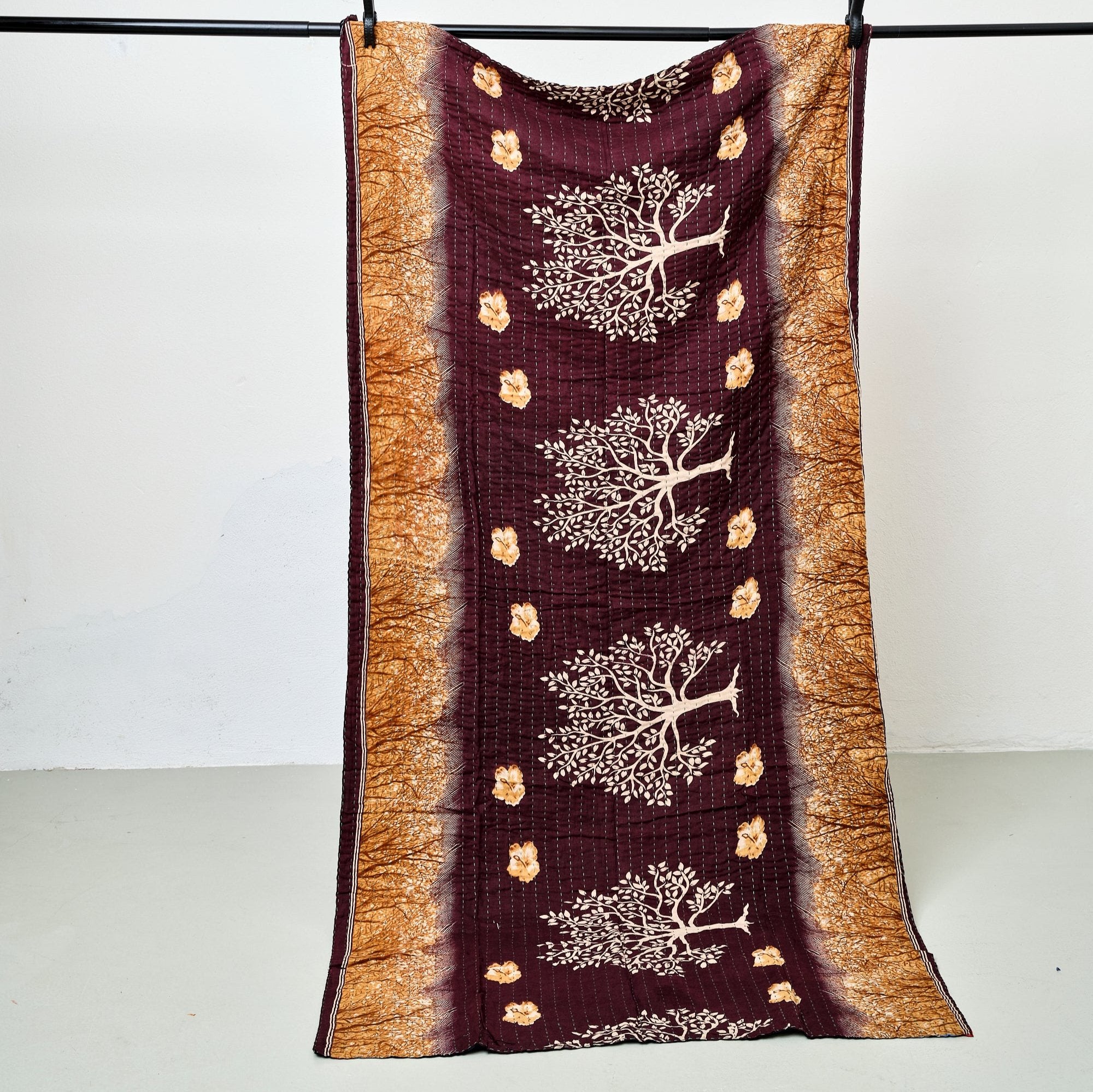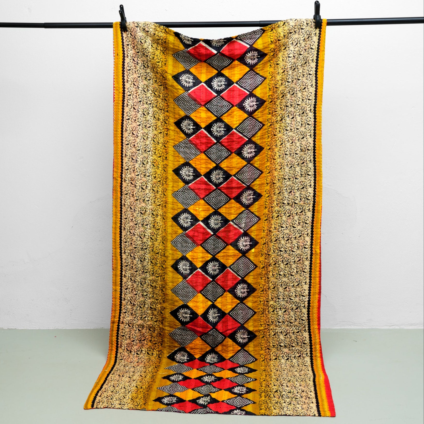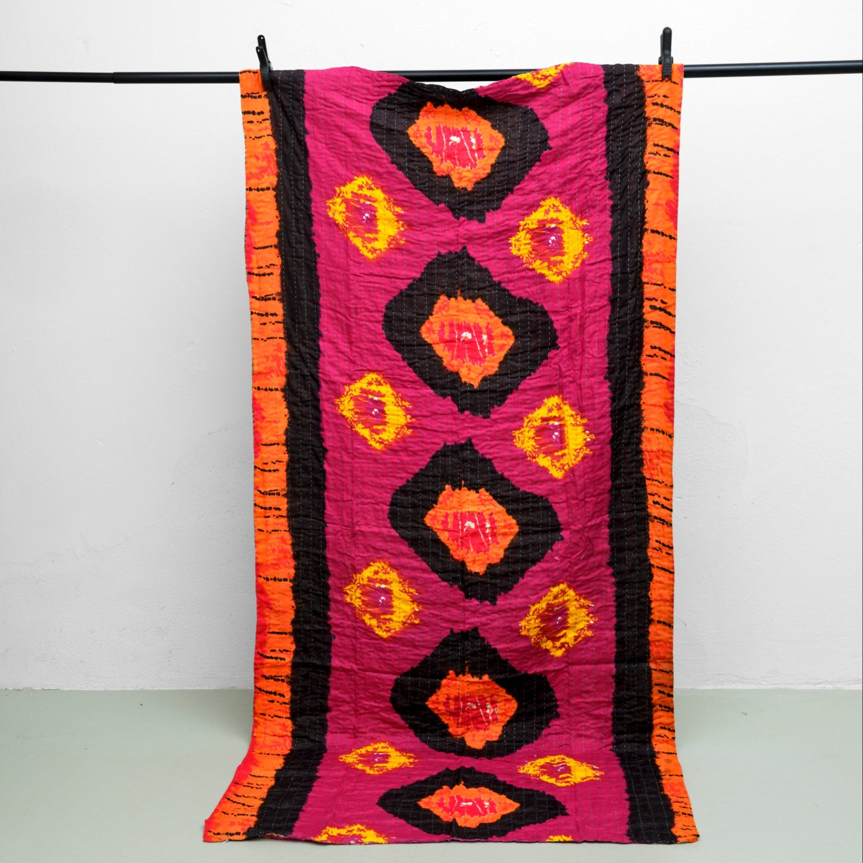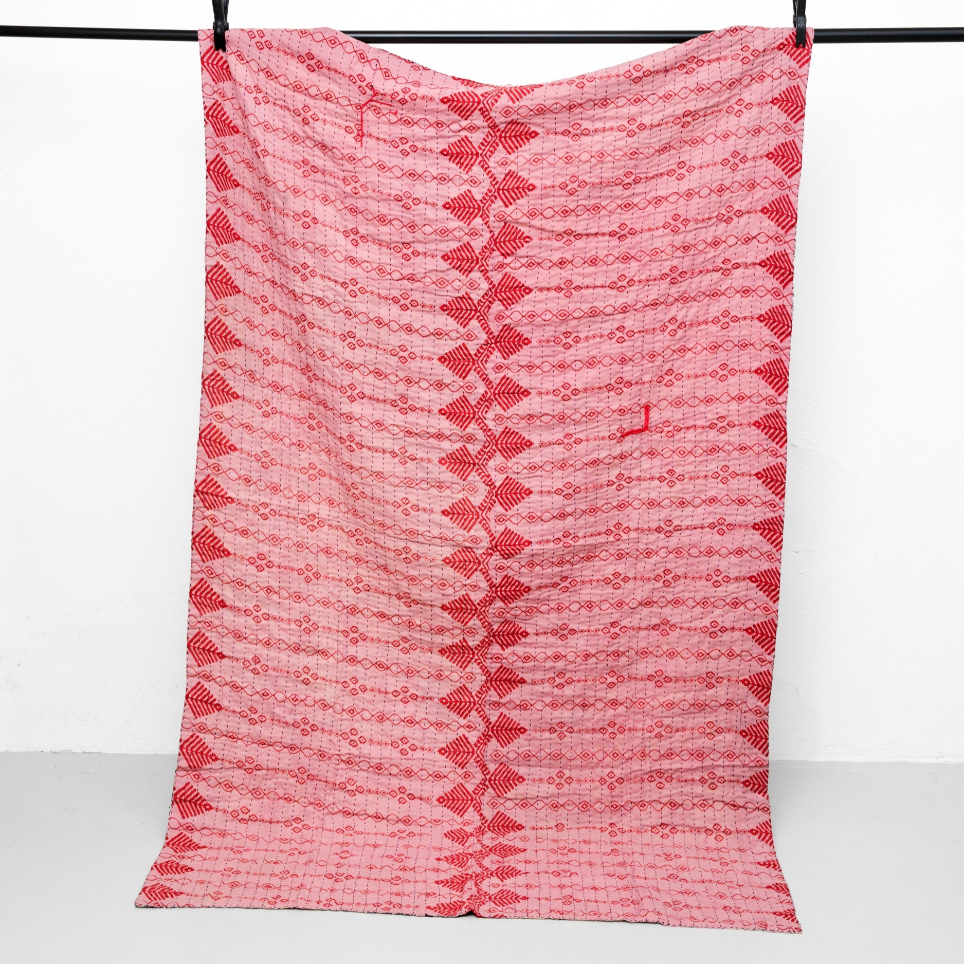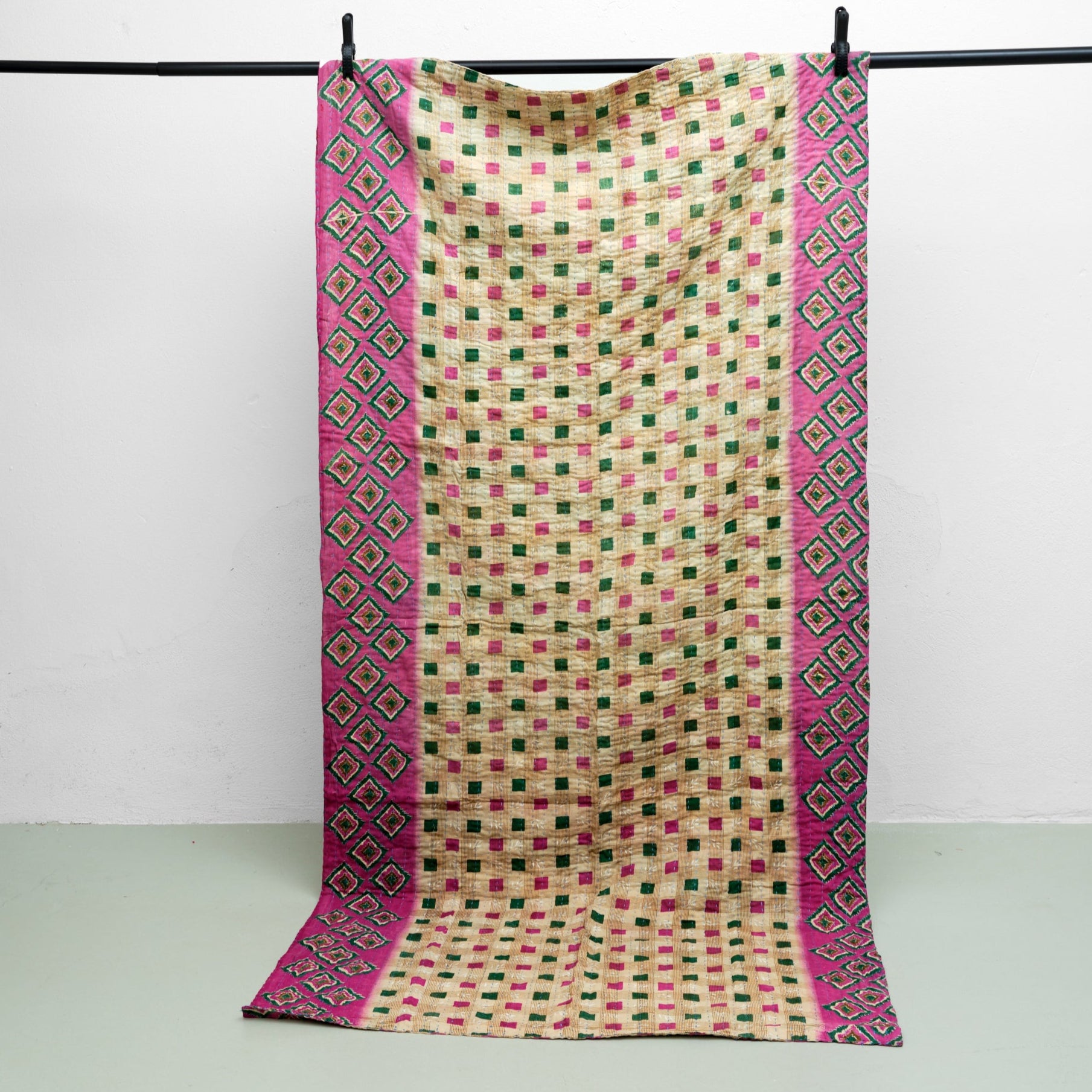 The many unique kantha blankets are hand-stitched with four layers of vintage cotton saris. The blankets are available in many different sizes, and each blanket is unique.