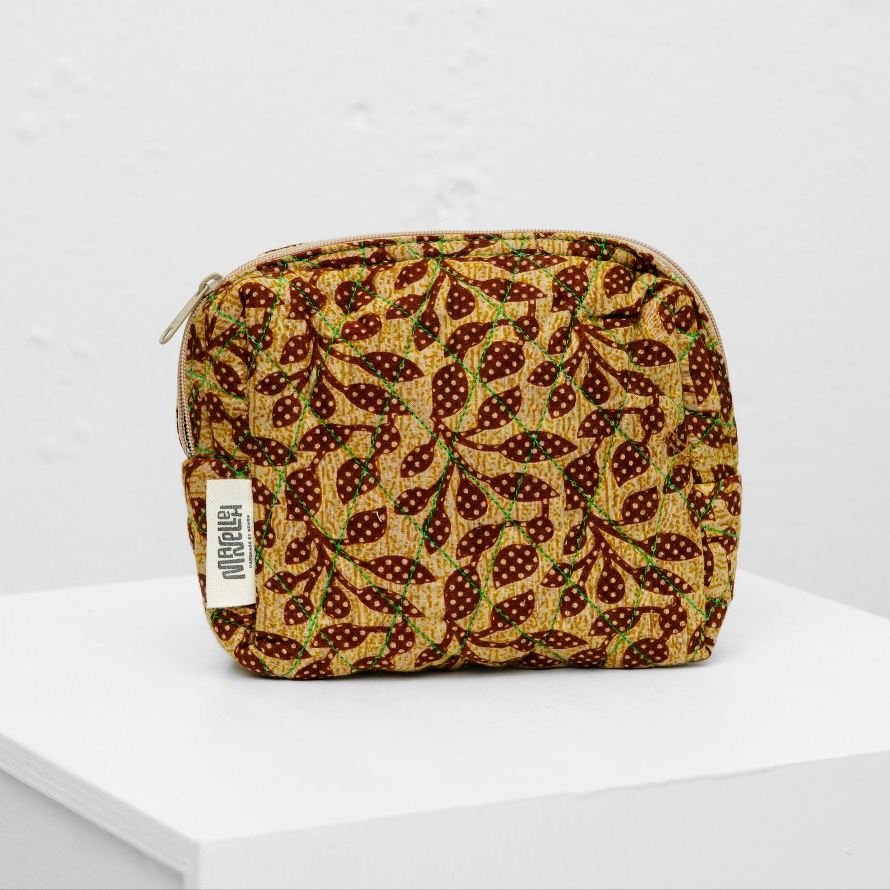 Kosmetikpungen er vatteret, lavet af fire lag vintage sarier og foret med GOTS certificeret økologisk bomuld. Den er syet med afsæt i globale fair trade principper og har taget cirka tre timer at optegne, klippe og sy på maskine.